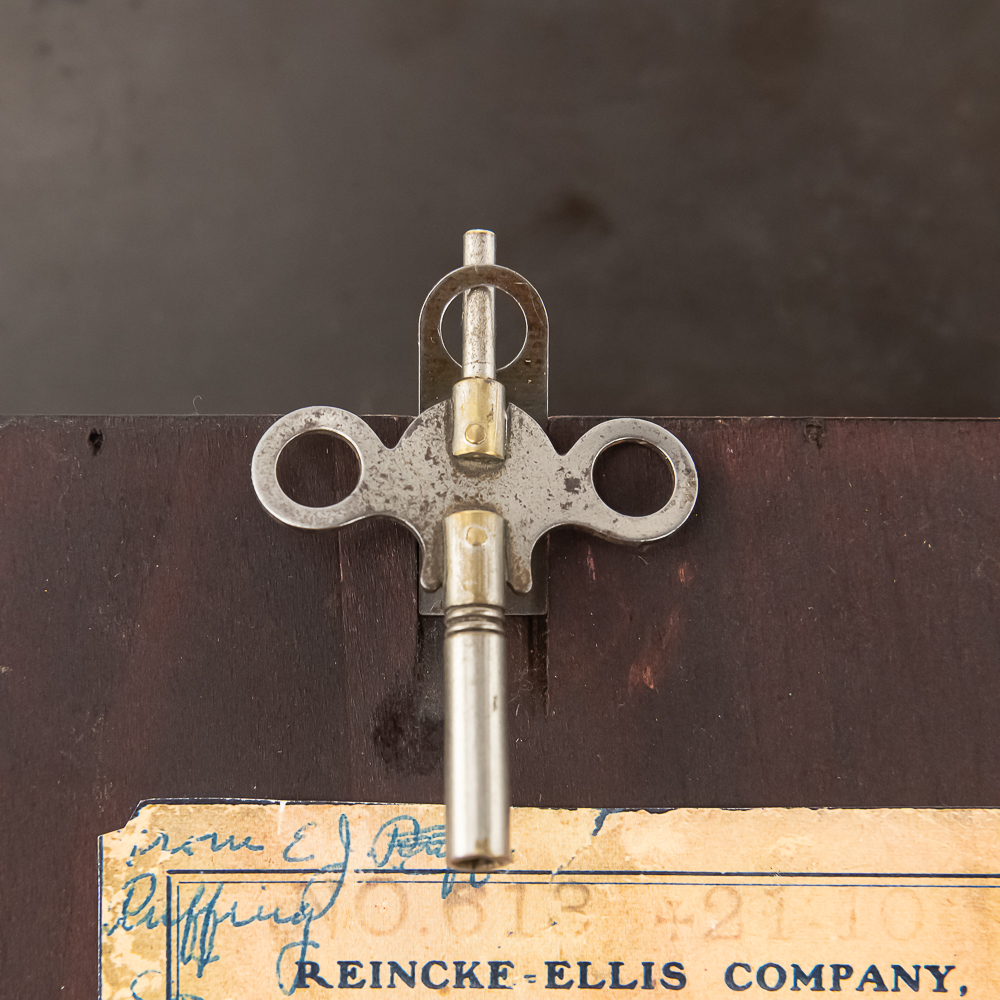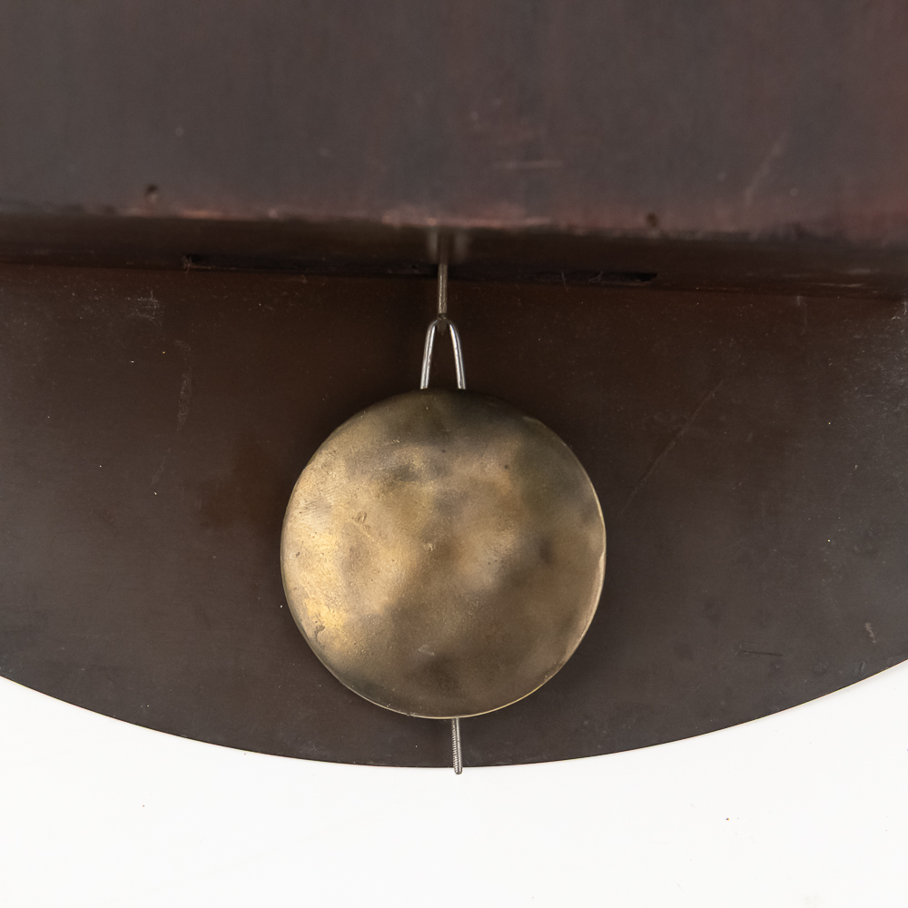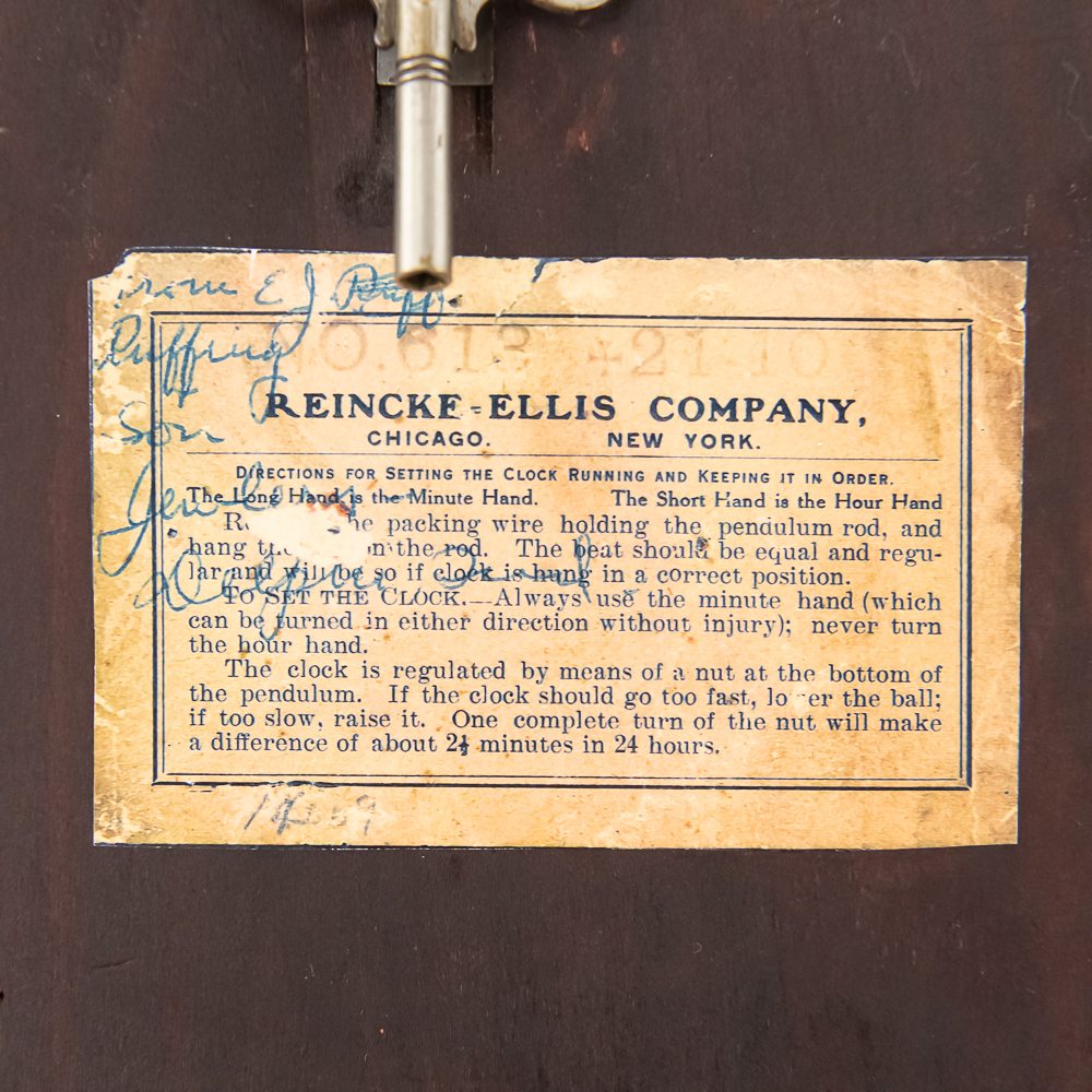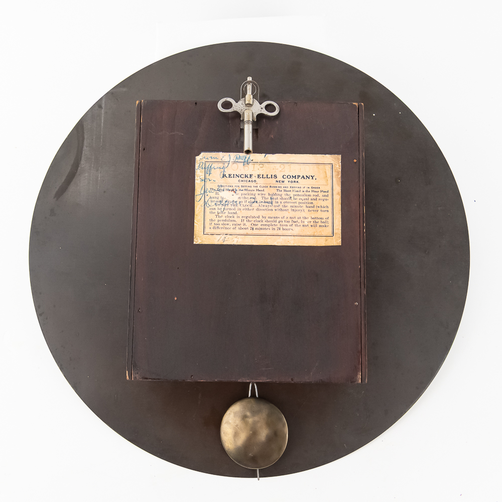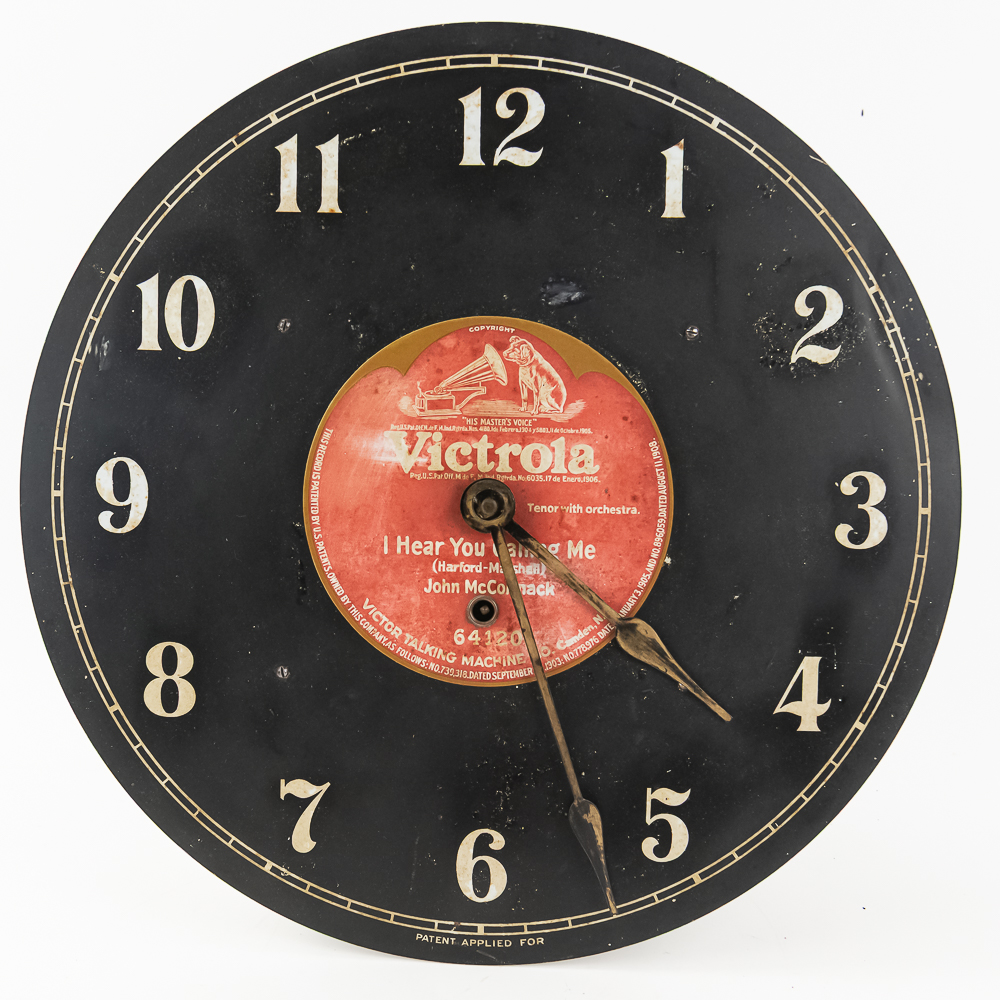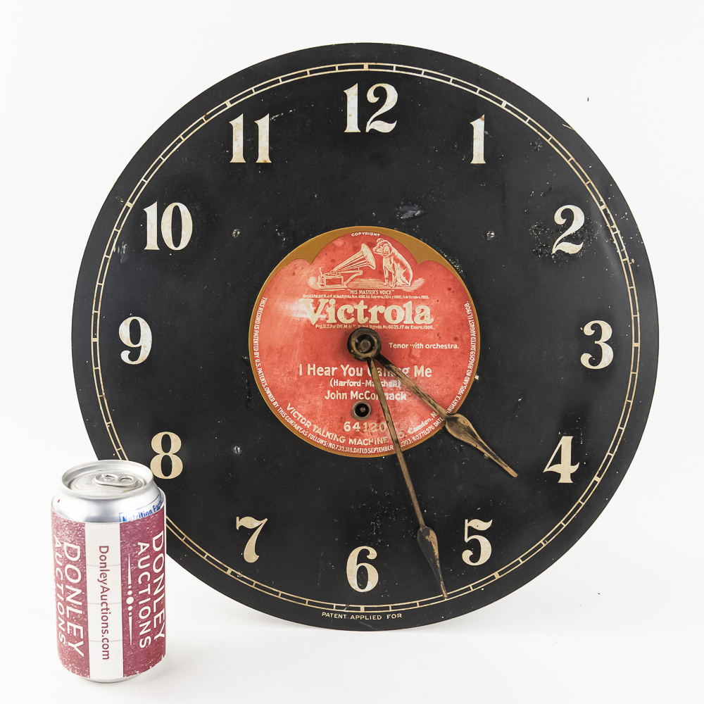 This original Victor Victrola advertising clock with its 15″ diameter steel dial featuring the Victor red seal record label has its original paint in good condition with some minor wear. Has its original hands showing some minor surface rust. Clock has a time only sessions single spring clock movement. Has its original winding key and pendulum. The small wooden box which holds the clock movement on the back has its original paper label on it. See photos. The clock appears complete and should not take much to make it run. From the Jeff Young Collection.