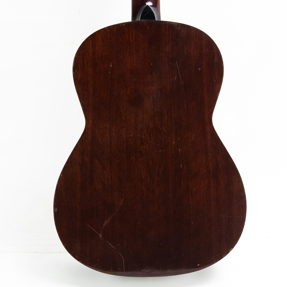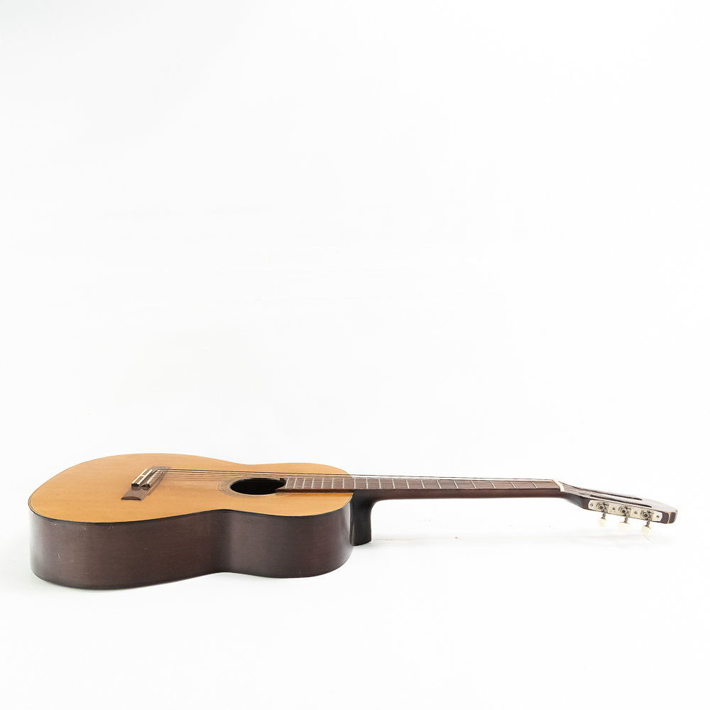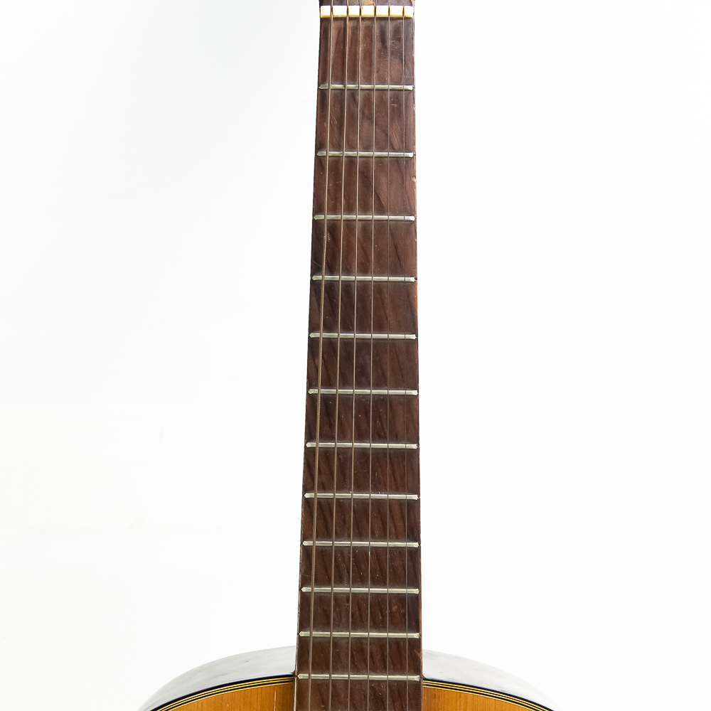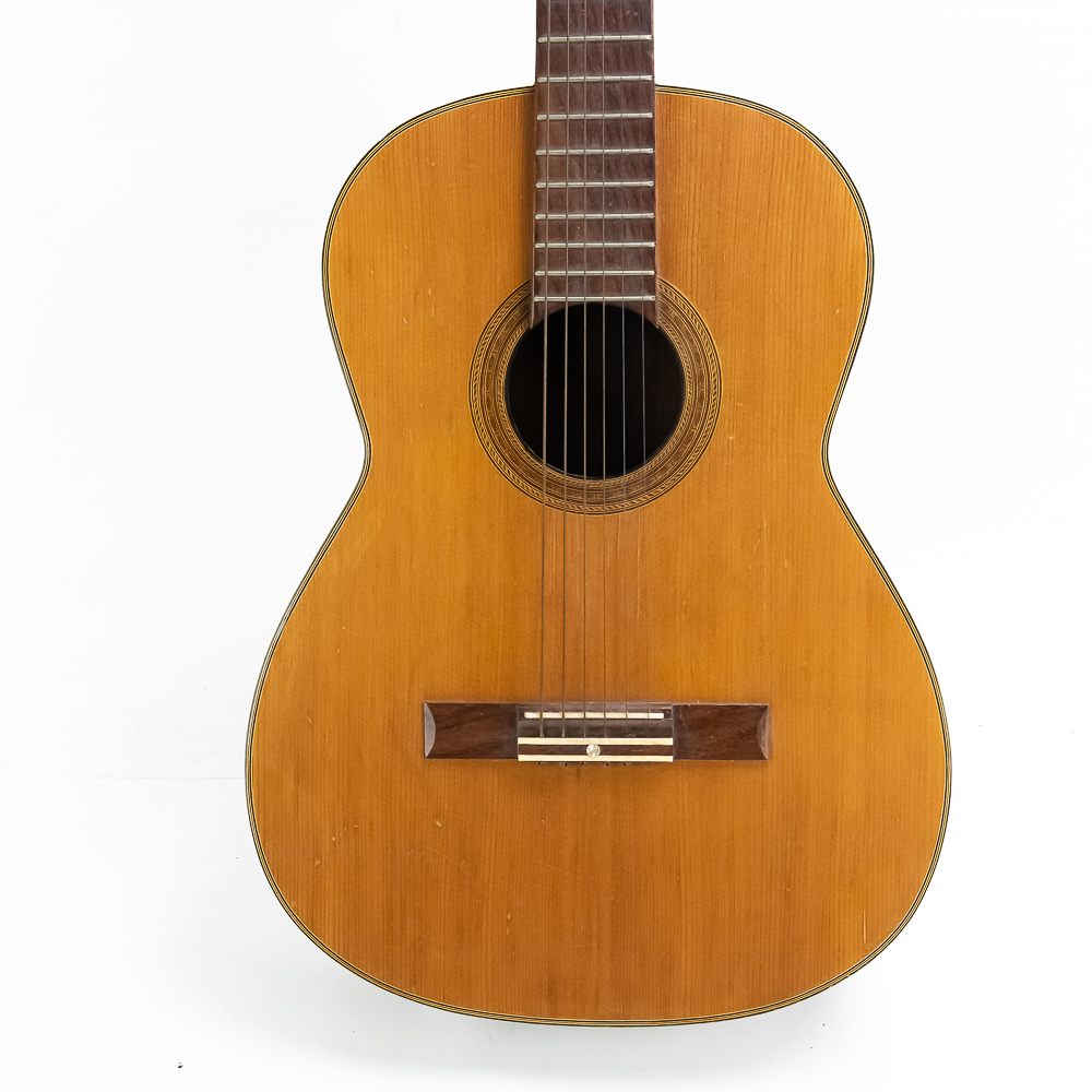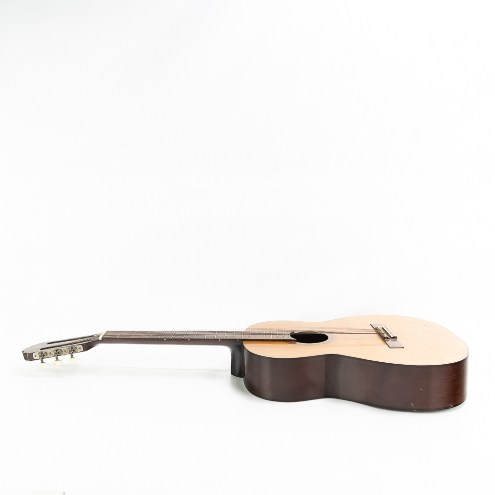 Unknown maker acoustic guitar in good condition. Original finish spruce top with maple sides and back in good condition with no splits or cracks. Bottom has strap lug. A good beginner guitar. No case.
