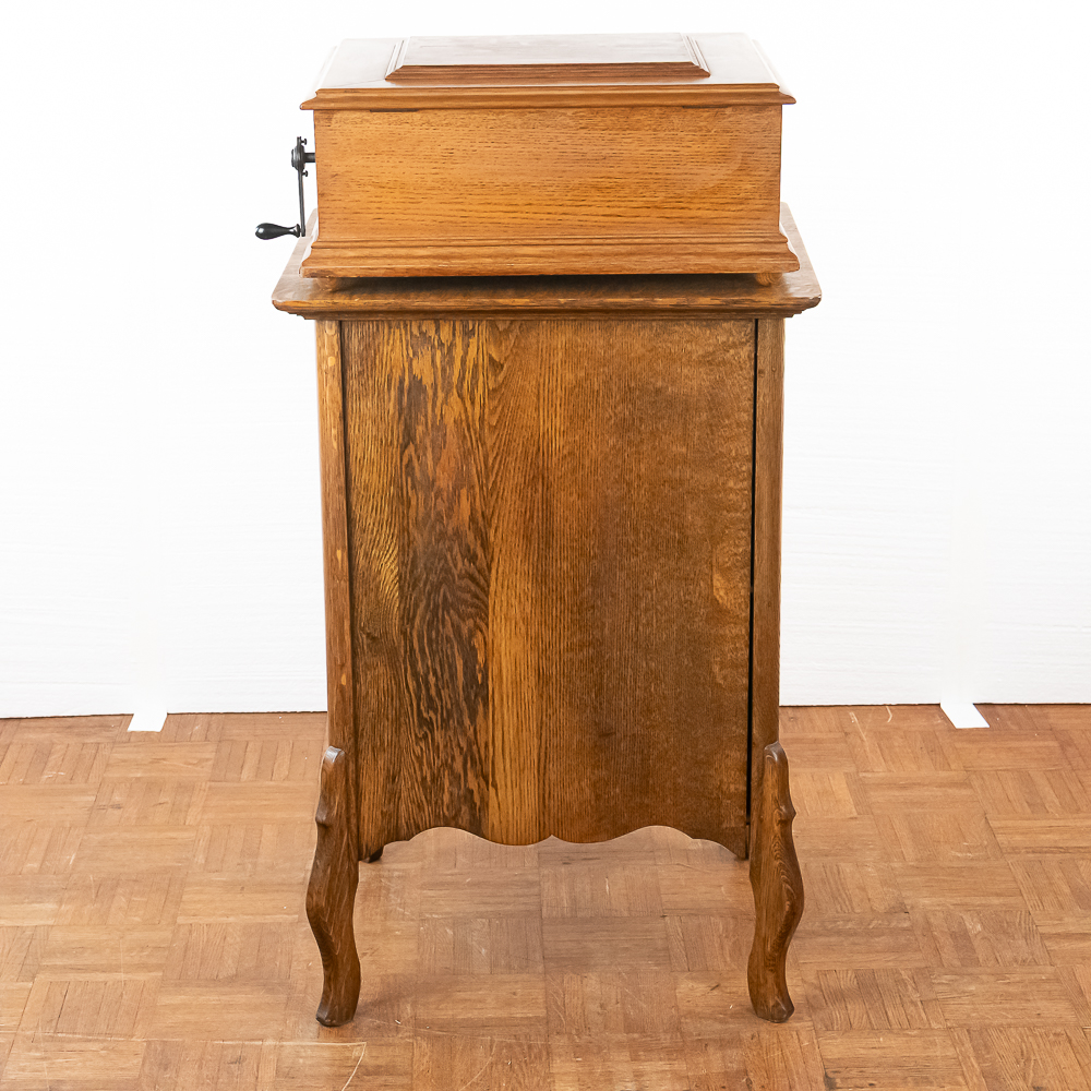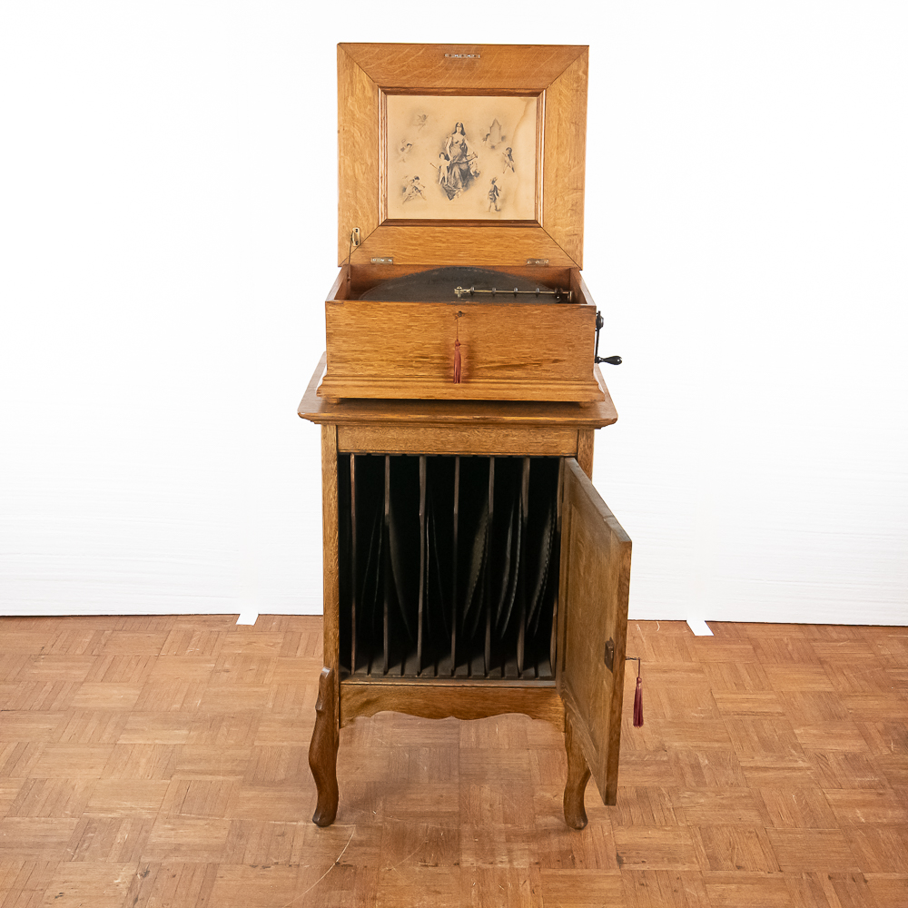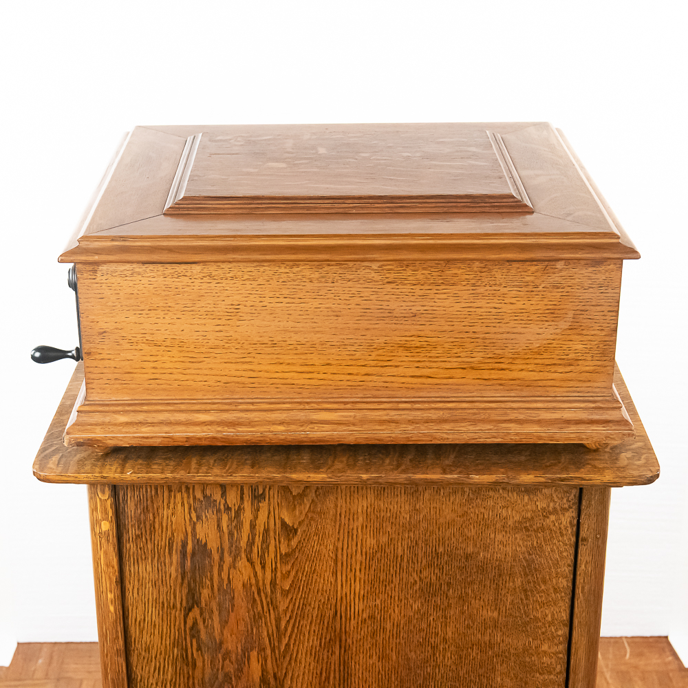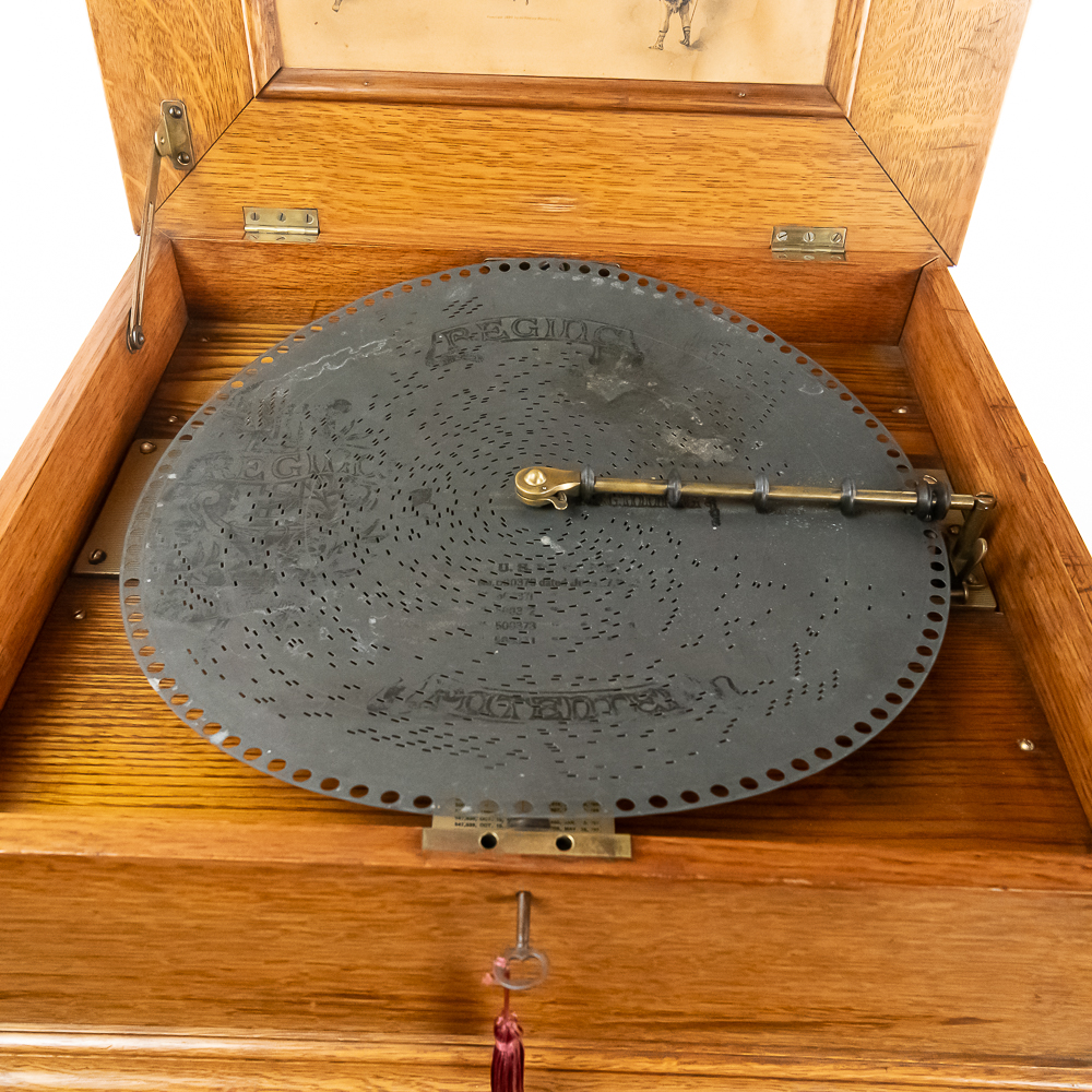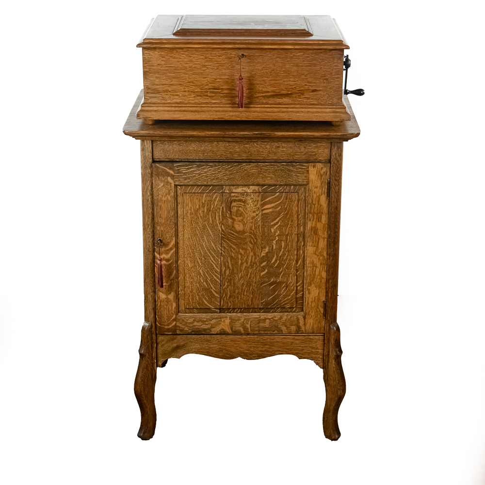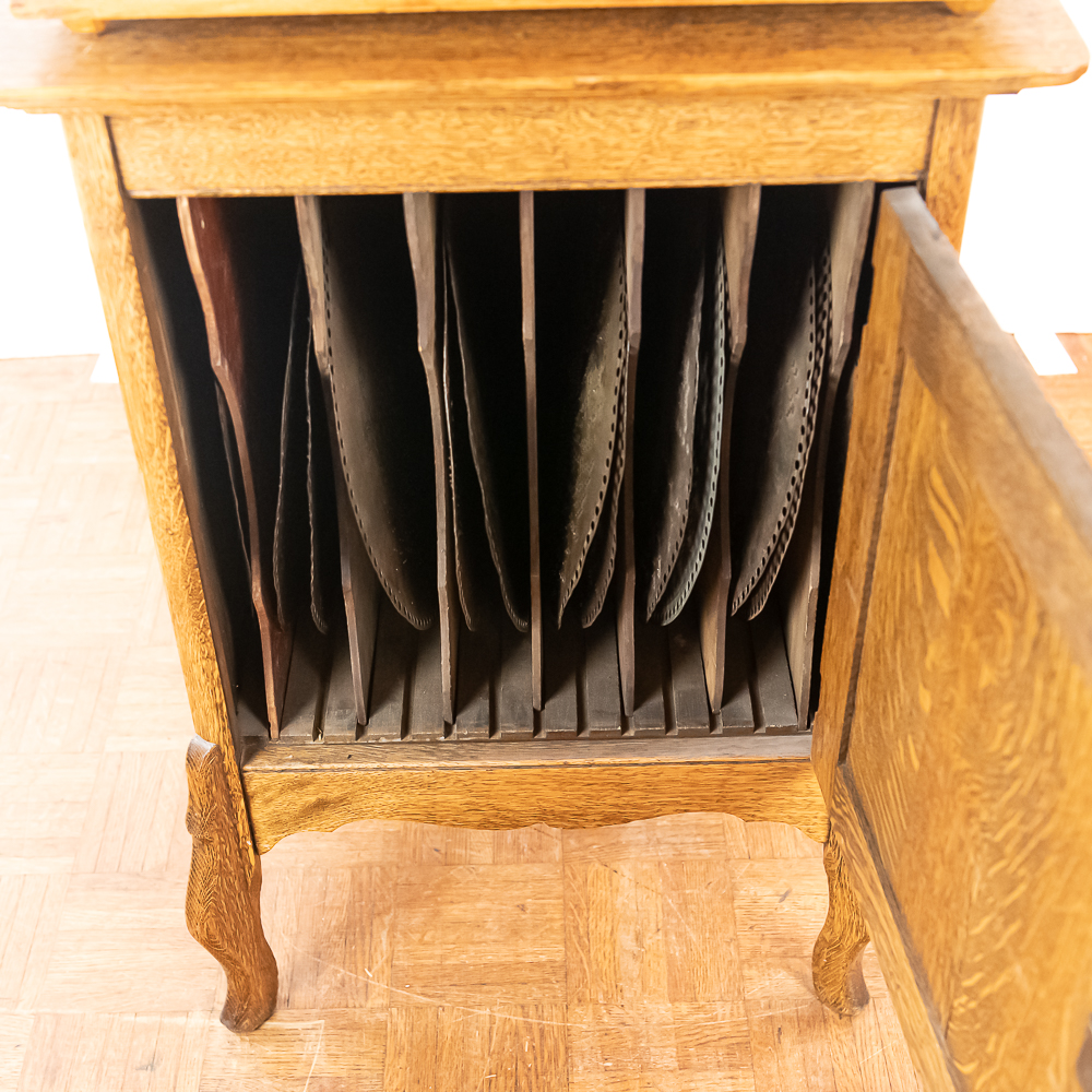 This machine in its oak cabinet has been stripped and refinished inside and out and is in overall good condition and presents well. Has its original paper Regina trademark inside the top cover it is slightly yellowed with some staining. Has its original lock and key. The single comb mechanism has evidence of having been professionally serviced and is in overall good condition. There are no visible broken comb teeth or tips. Has its original winding crank, it winds, plays and starts and stops as it should and sounds well. Also included are 15, 15-1/2″ Regina discs of various titles in average condition with some rust. Also included is a matching oak base cabinet which has also been stripped and refinished and is in overall good condition and presents well. Cabinet features highly figured quarter sawn oak front door with raised panel. The cabinet has most of its original interior which was originally fitted with 13 dividers however only 7 original dividers are present and 6 are missing. Has its original cabinet lock and key. Machine measures 21″ W X 18-1/2″ D X 10″ T. Cabinet measures 23″ W X 21″ D X 34″ T. From the Jeff Young Collection.