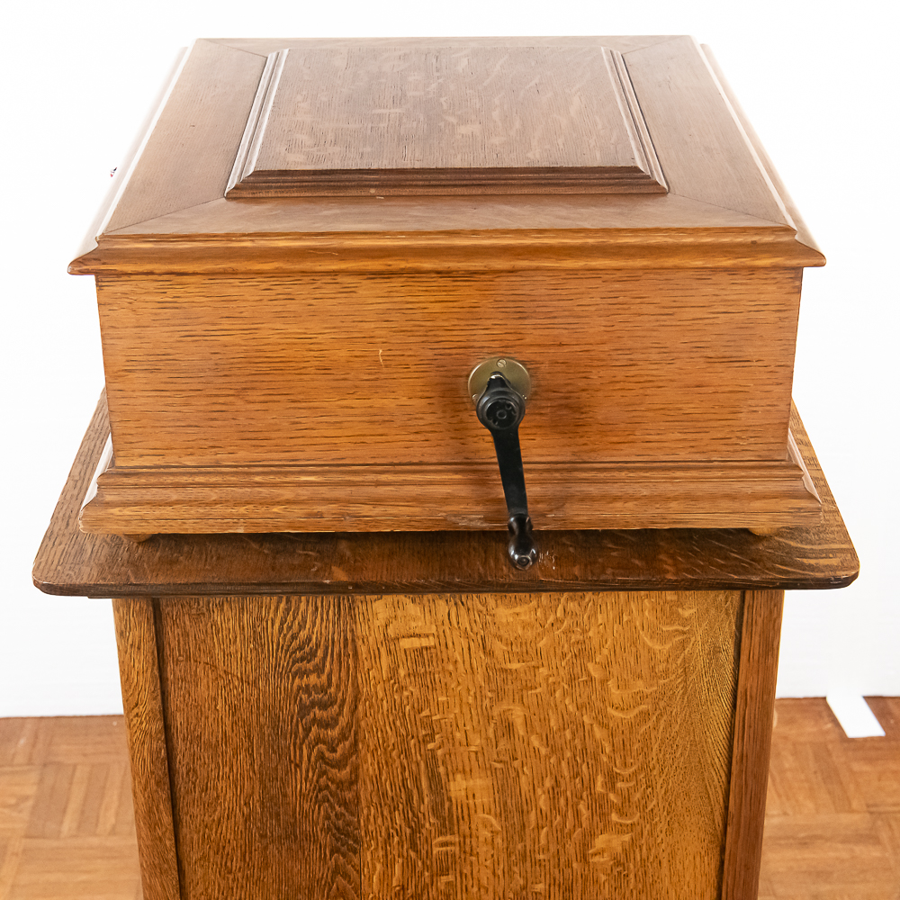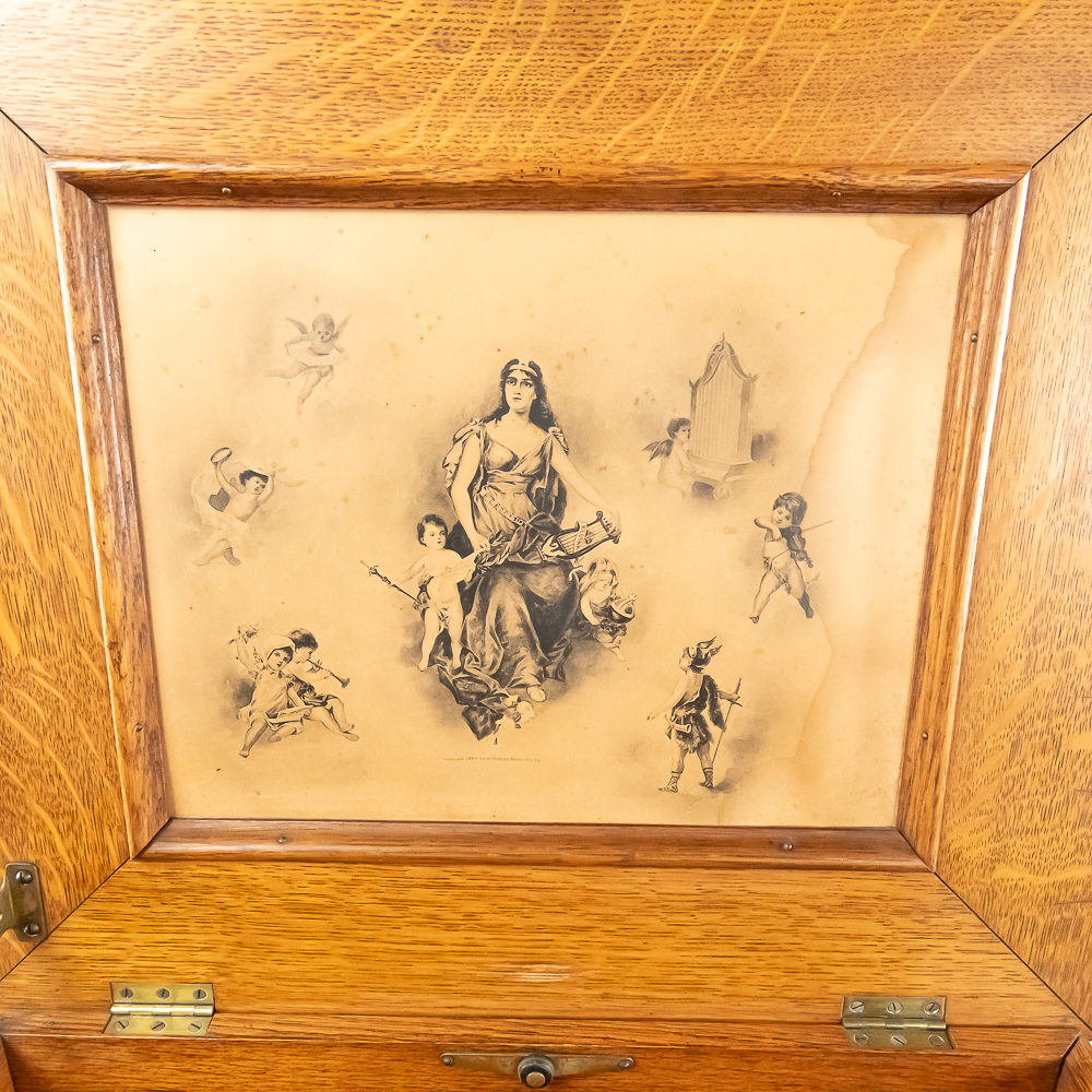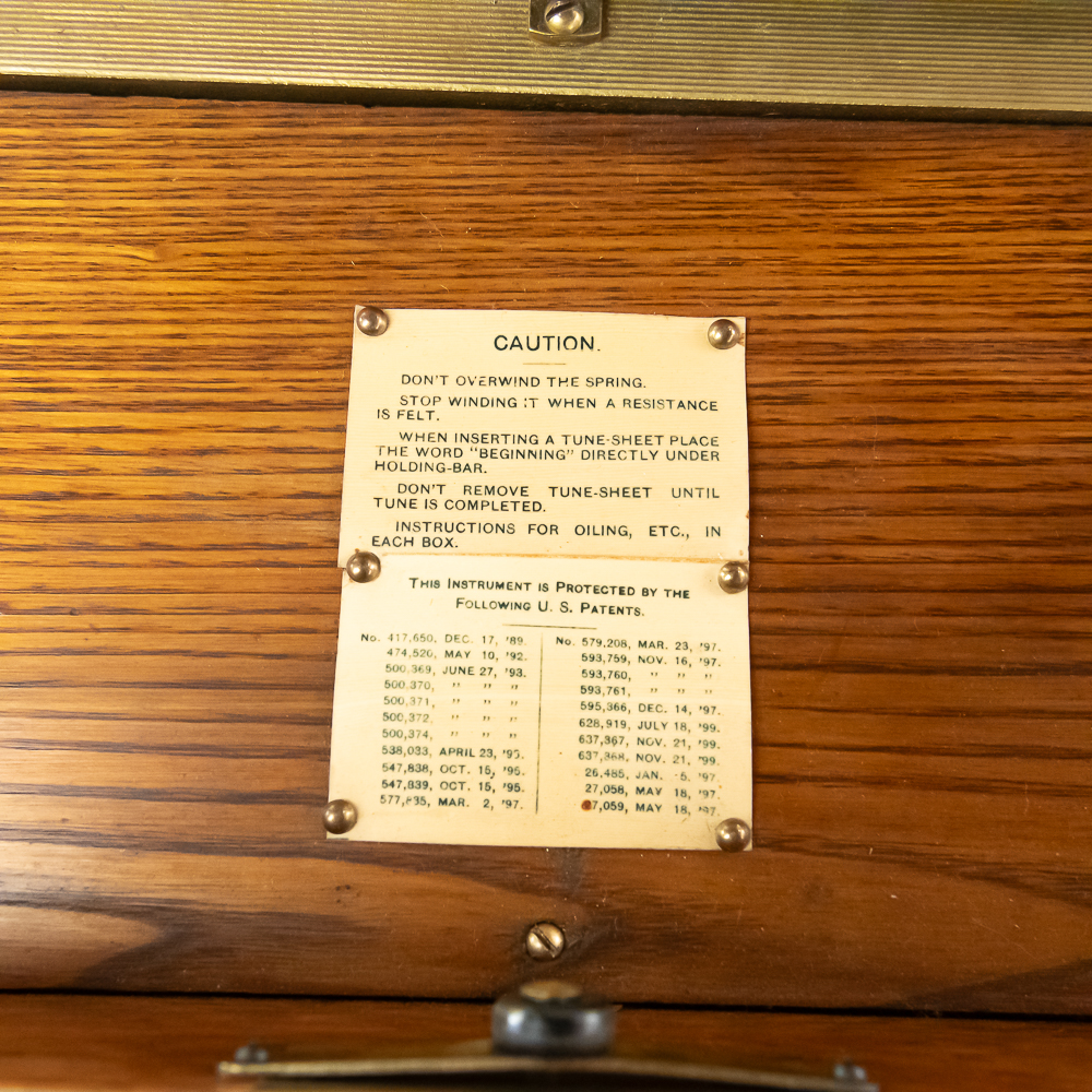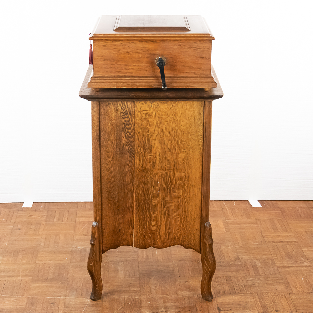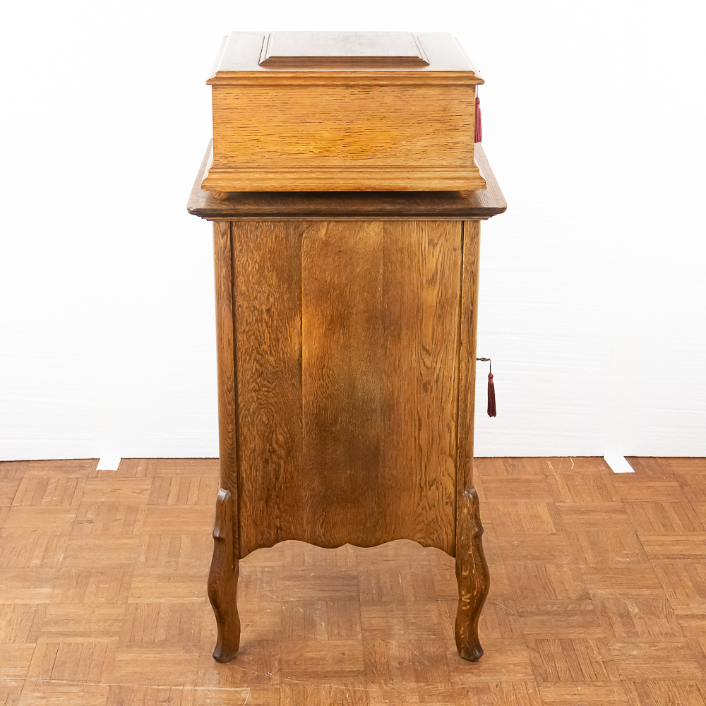 This machine in its oak cabinet has been stripped and refinished inside and out and is in overall good condition and presents well. Has its original paper Regina trademark inside the top cover it is slightly yellowed with some staining. Has its original lock and key. The single comb mechanism has evidence of having been professionally serviced and is in overall good condition. There are no visible broken comb teeth or tips. Has its original winding crank, it winds, plays and starts and stops as it should and sounds well. Also included are 15, 15-1/2″ Regina discs of various titles in average condition with some rust. Also included is a matching oak base cabinet which has also been stripped and refinished and is in overall good condition and presents well. Cabinet features highly figured quarter sawn oak front door with raised panel. The cabinet has most of its original interior which was originally fitted with 13 dividers however only 7 original dividers are present and 6 are missing. Has its original cabinet lock and key. Machine measures 21″ W X 18-1/2″ D X 10″ T. Cabinet measures 23″ W X 21″ D X 34″ T. From the Jeff Young Collection.