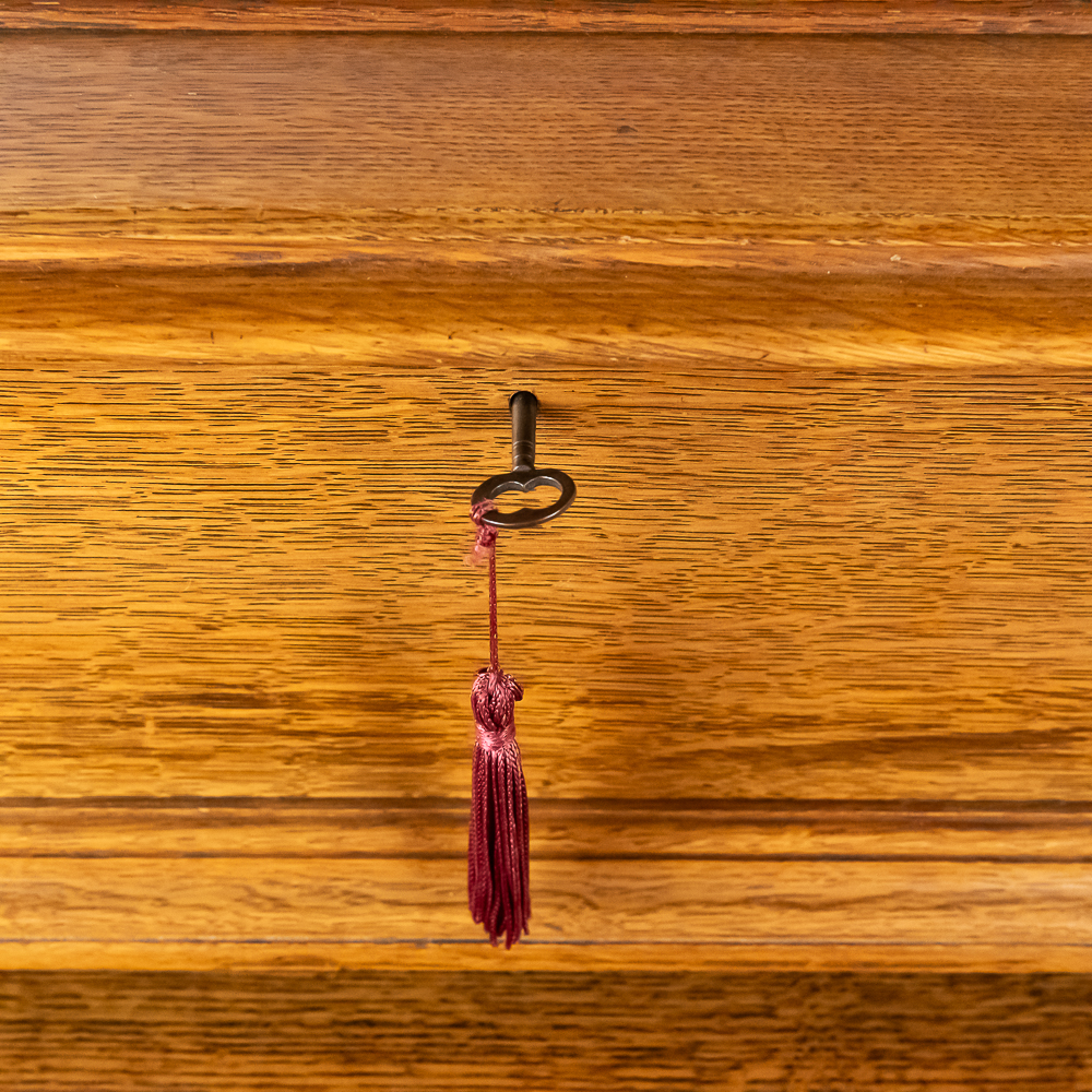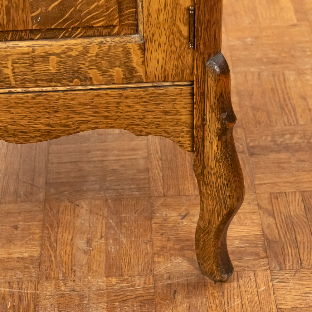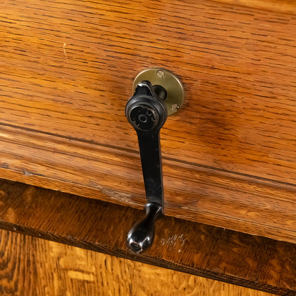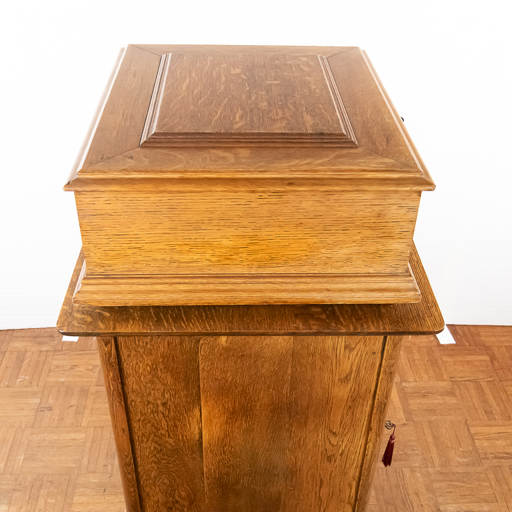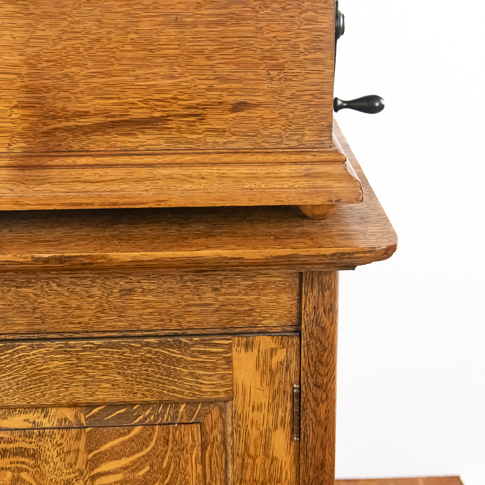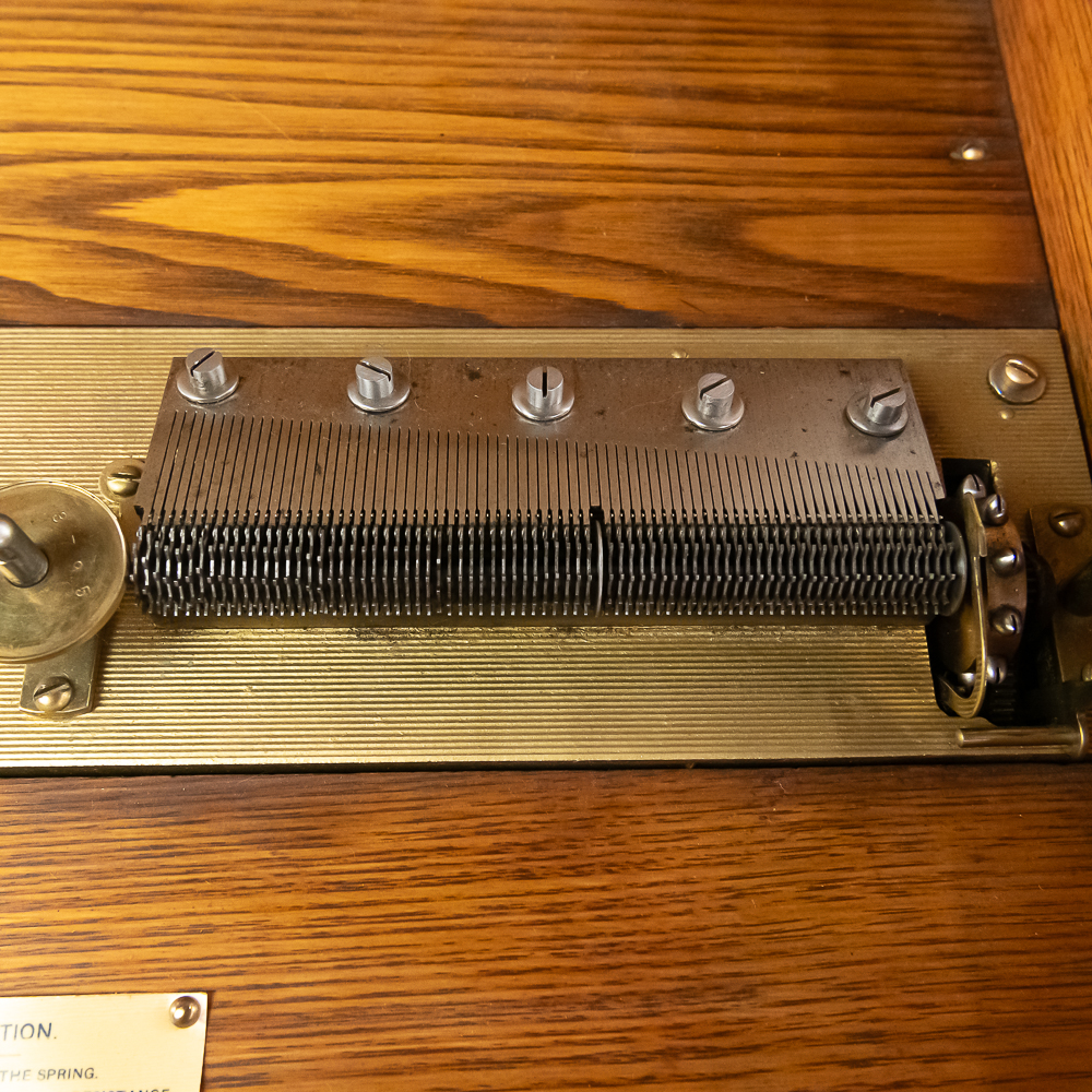 This machine in its oak cabinet has been stripped and refinished inside and out and is in overall good condition and presents well. Has its original paper Regina trademark inside the top cover it is slightly yellowed with some staining. Has its original lock and key. The single comb mechanism has evidence of having been professionally serviced and is in overall good condition. There are no visible broken comb teeth or tips. Has its original winding crank, it winds, plays and starts and stops as it should and sounds well. Also included are 15, 15-1/2″ Regina discs of various titles in average condition with some rust. Also included is a matching oak base cabinet which has also been stripped and refinished and is in overall good condition and presents well. Cabinet features highly figured quarter sawn oak front door with raised panel. The cabinet has most of its original interior which was originally fitted with 13 dividers however only 7 original dividers are present and 6 are missing. Has its original cabinet lock and key. Machine measures 21″ W X 18-1/2″ D X 10″ T. Cabinet measures 23″ W X 21″ D X 34″ T. From the Jeff Young Collection.