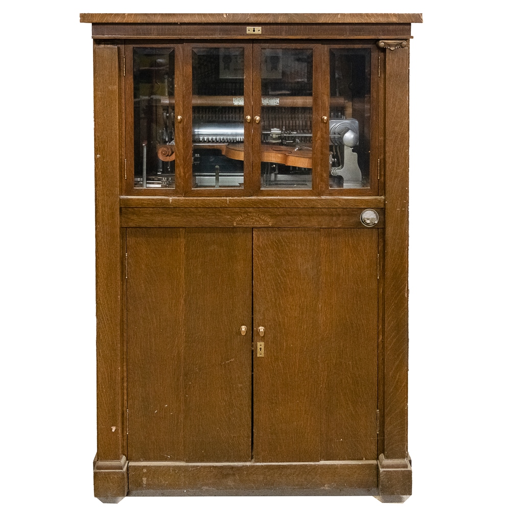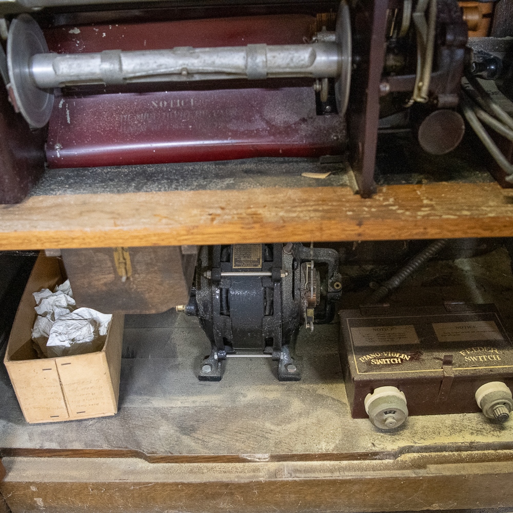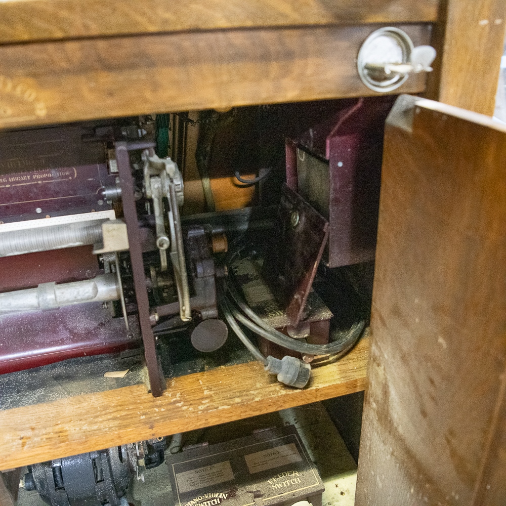 Oak Mills Violano serial number 1797. Good restoration candidate. It has its original violin which is market Mills Novelty Company on the paper label inside the violin. There are no strings present, otherwise the violin appears to be in good condition. The tuning weights and arms are present but appear to be reproductions. Oak cabinet has original front bifold doors and beveled glass and hardware, One of the front columns is missing a capital – see photos. Has original coin mechanism. The coin box and front cover are older reproductions. The sounding board appears to be in good condition with no visible cracks. The cast iron harp is free of any cracks, the piano action appears to have been reconditioned as well as the piano having been re-strung some time ago. The oak cabinet appears to have been professionally refinished. There are several minor nicks and scrapes and some veneer damage on the edges of the top cover. The roll-frame motor/generator and governor are all present. The contact roller is also present, but detached. This machine is not in playing condition and in need of restoration. 64″H x 42″W x 30″ D