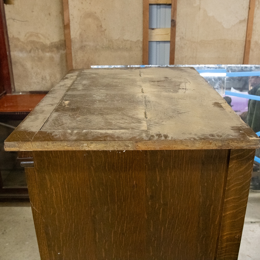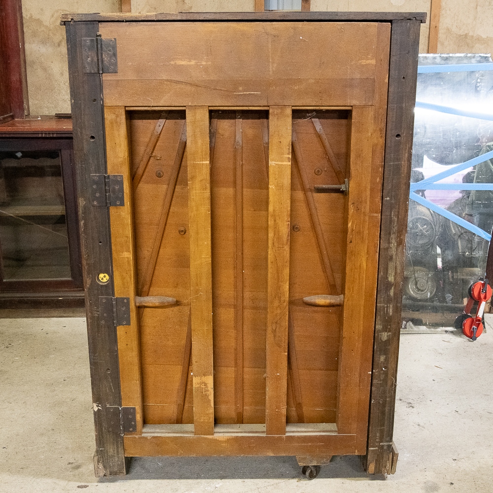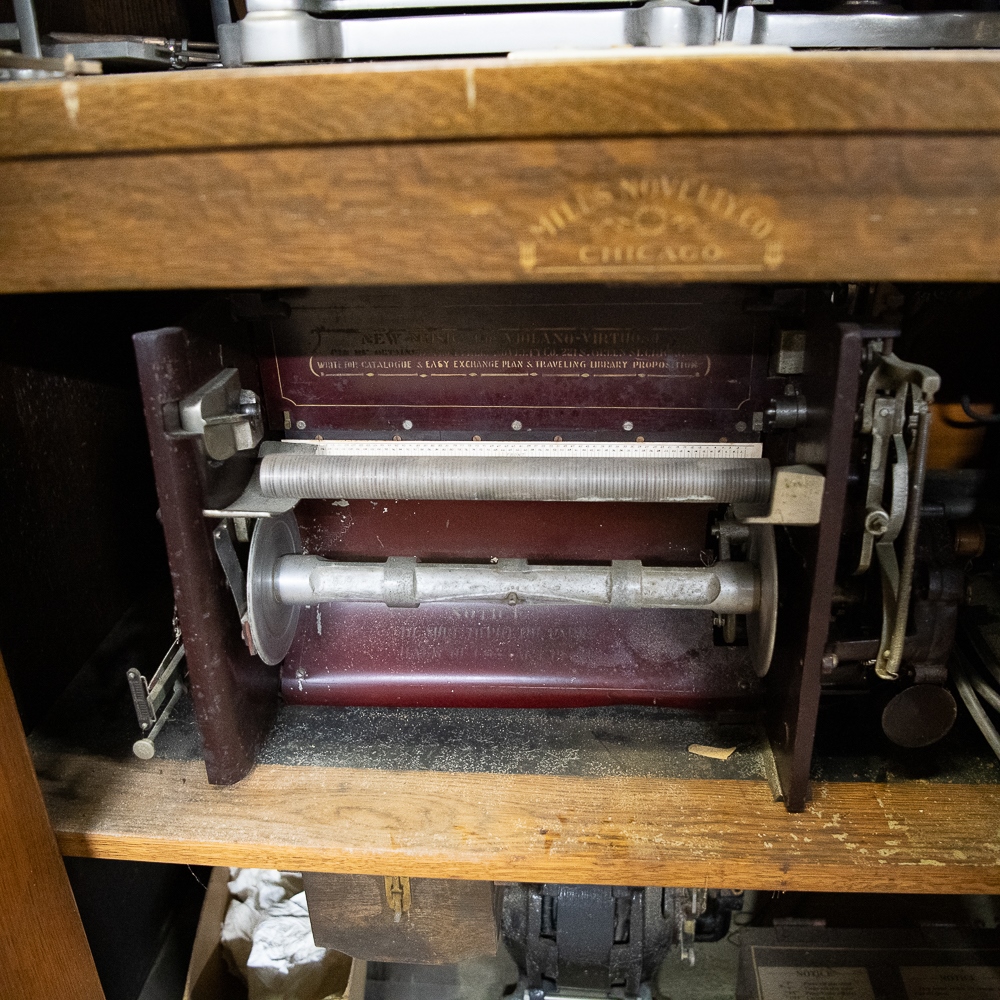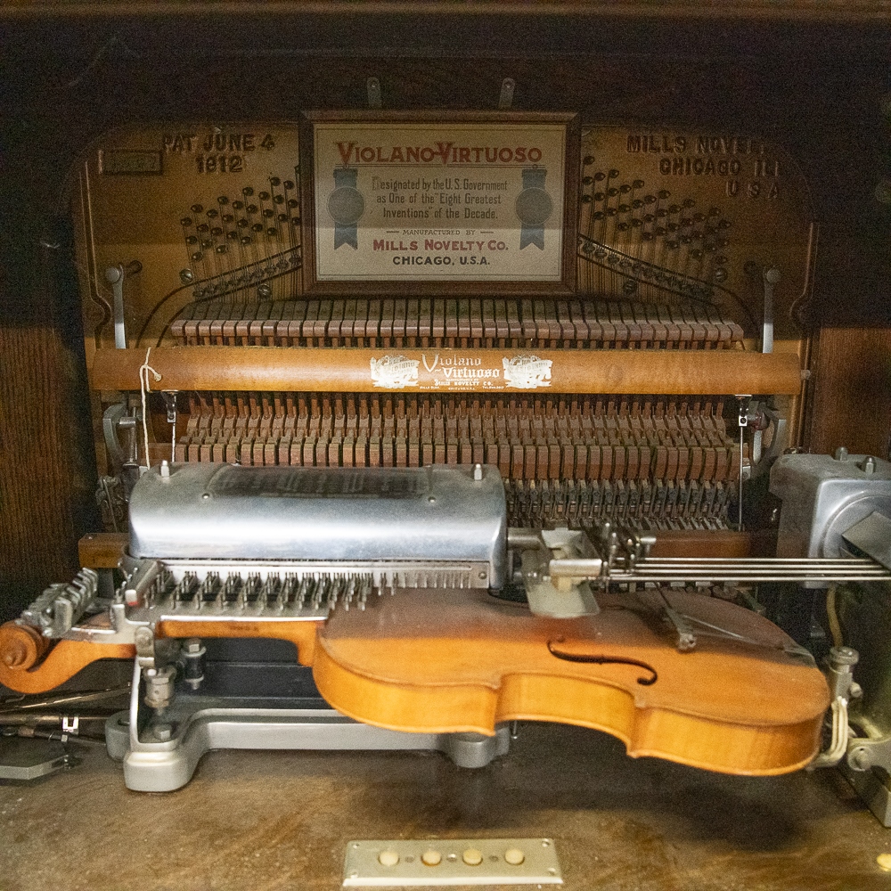 Oak Mills Violano serial number 1797. Good restoration candidate. It has its original violin which is market Mills Novelty Company on the paper label inside the violin. There are no strings present, otherwise the violin appears to be in good condition. The tuning weights and arms are present but appear to be reproductions. Oak cabinet has original front bifold doors and beveled glass and hardware, One of the front columns is missing a capital – see photos. Has original coin mechanism. The coin box and front cover are older reproductions. The sounding board appears to be in good condition with no visible cracks. The cast iron harp is free of any cracks, the piano action appears to have been reconditioned as well as the piano having been re-strung some time ago. The oak cabinet appears to have been professionally refinished. There are several minor nicks and scrapes and some veneer damage on the edges of the top cover. The roll-frame motor/generator and governor are all present. The contact roller is also present, but detached. This machine is not in playing condition and in need of restoration. 64″H x 42″W x 30″ D