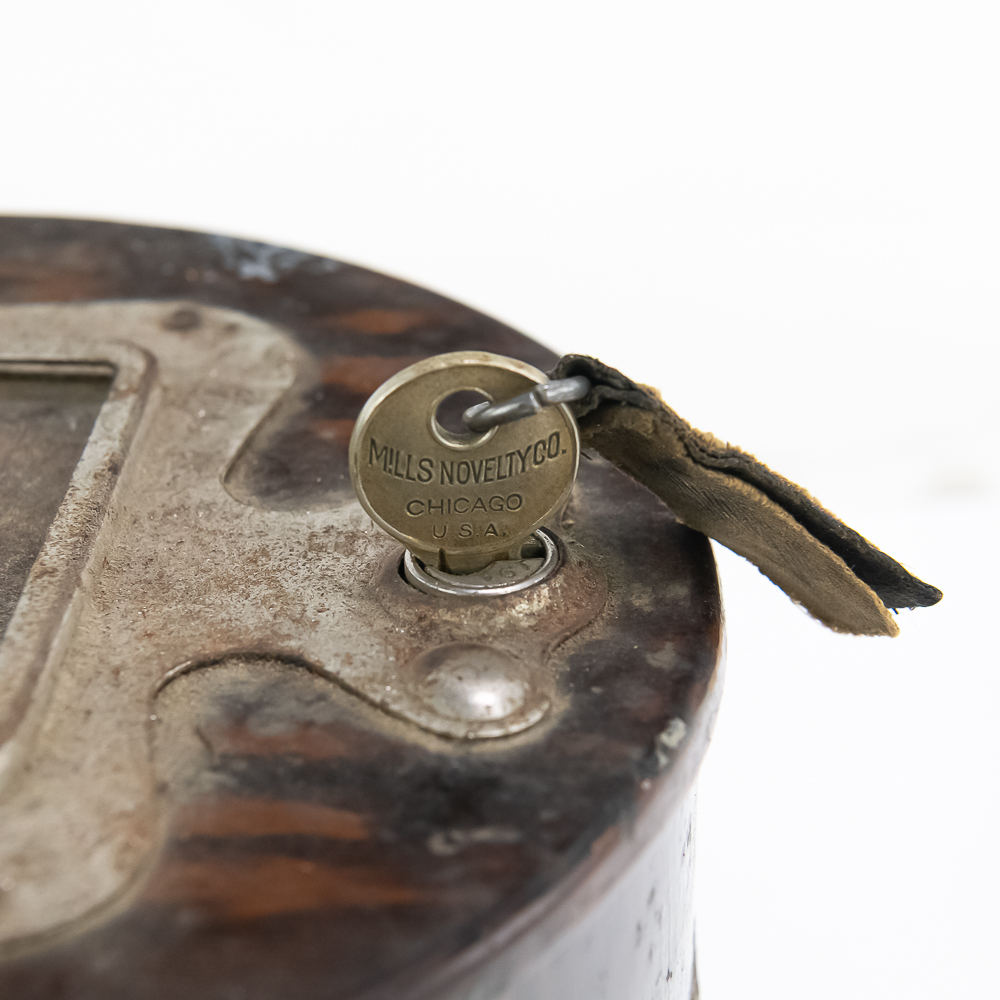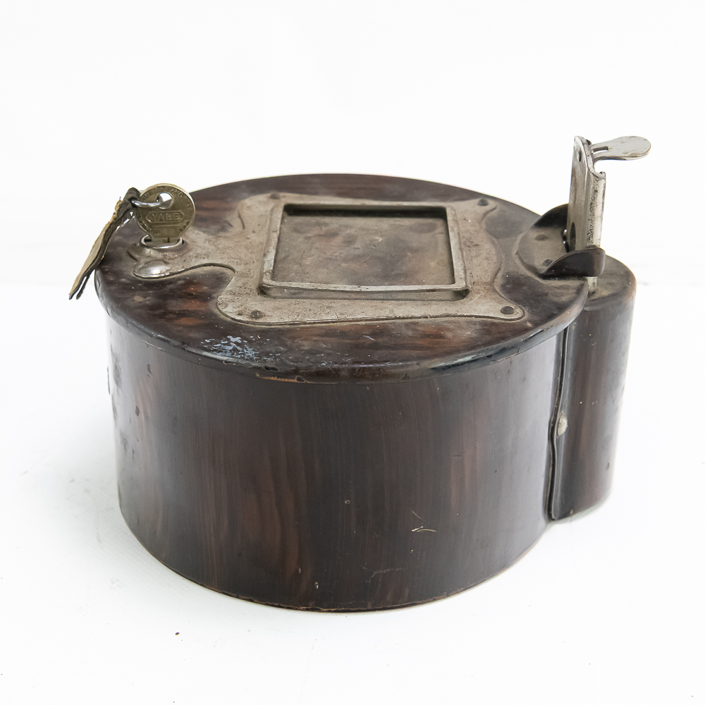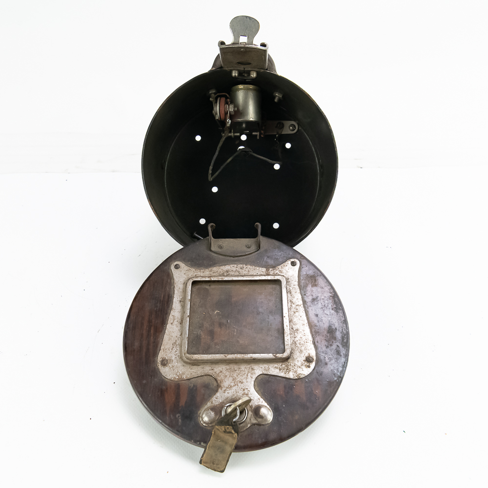 All original Mills Violano remote wall box which allowed customers to play the machine while seated at a booth. Stamped steel constructed box has original painted wood grain finish in VG condition, instruction card frame has slight rust and no card or glass. 5 cent coin slot works smoothly and has the original electric contact switch inside (see pic). Comes with original Mills lock anf Mills key. In overall VG condition. Measures 6.75″ in diameter.