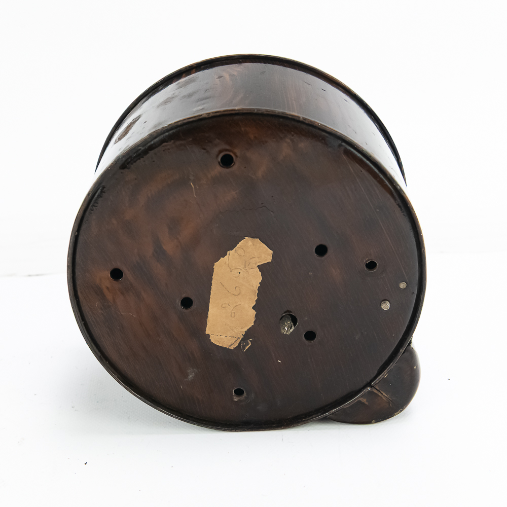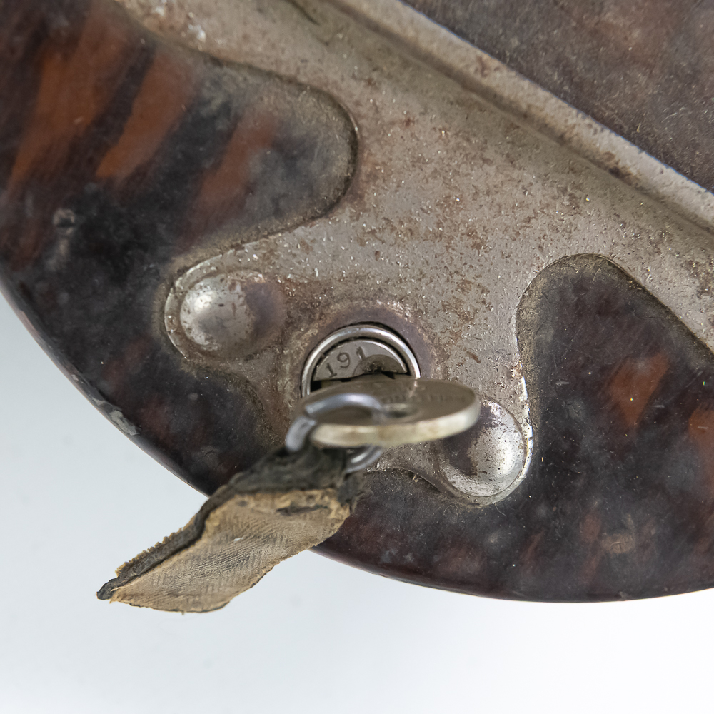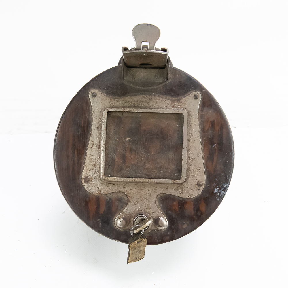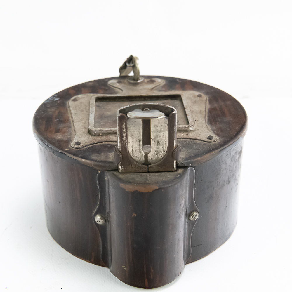 All original Mills Violano remote wall box which allowed customers to play the machine while seated at a booth. Stamped steel constructed box has original painted wood grain finish in VG condition, instruction card frame has slight rust and no card or glass. 5 cent coin slot works smoothly and has the original electric contact switch inside (see pic). Comes with original Mills lock anf Mills key. In overall VG condition. Measures 6.75″ in diameter.