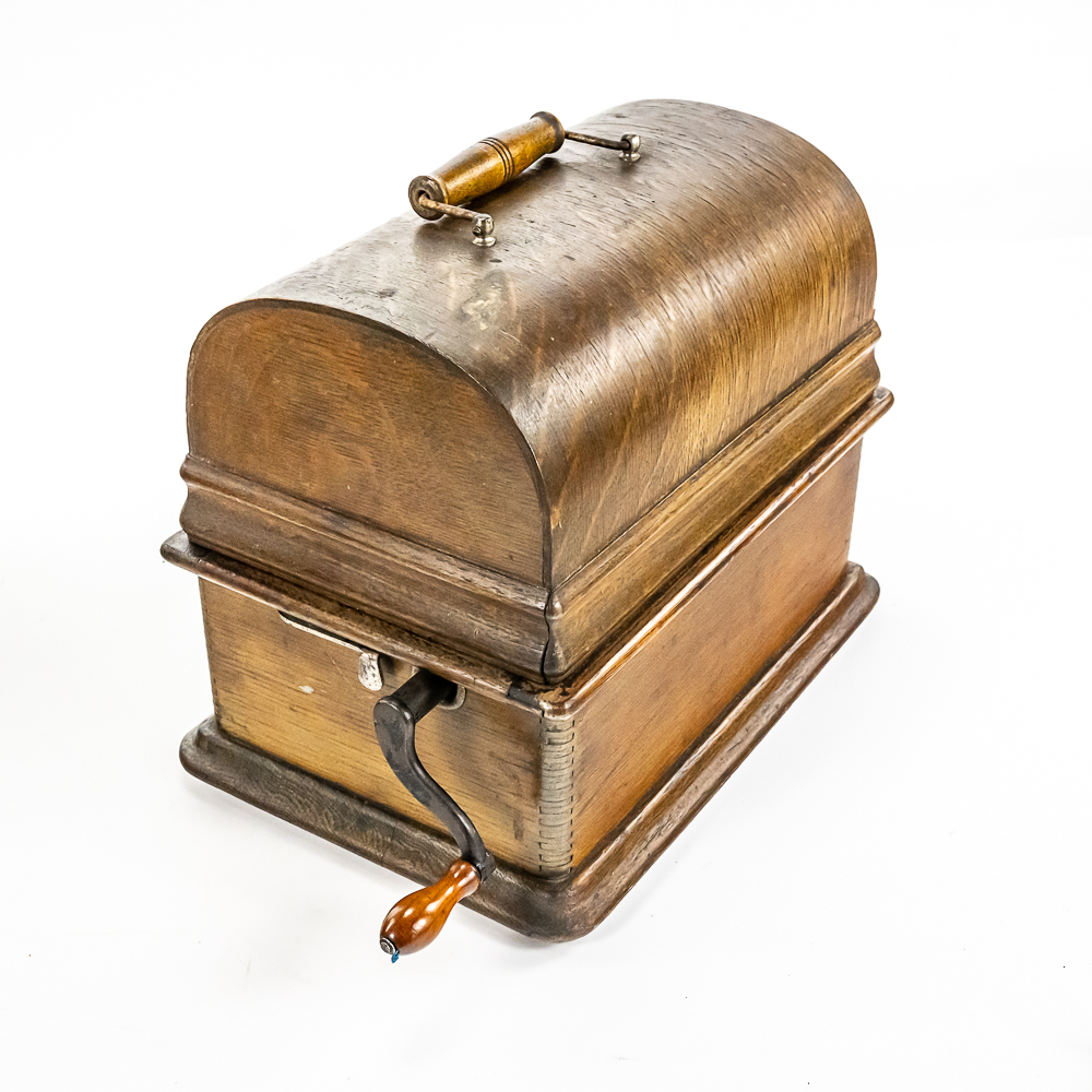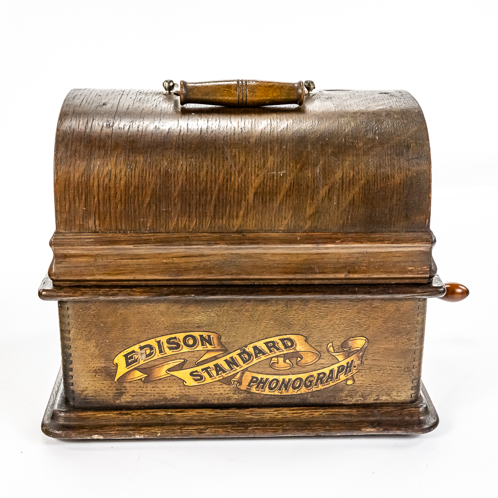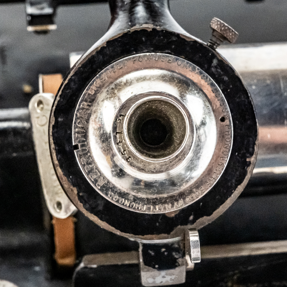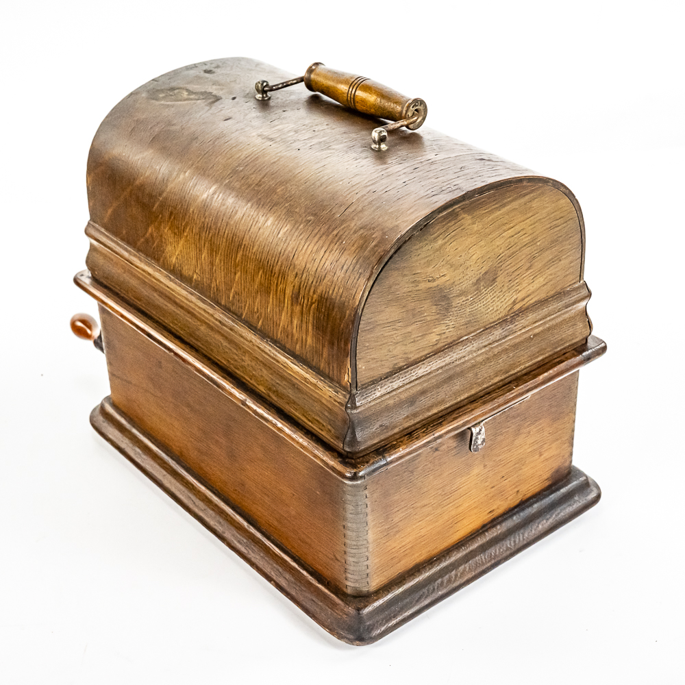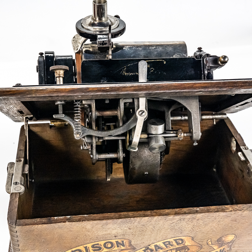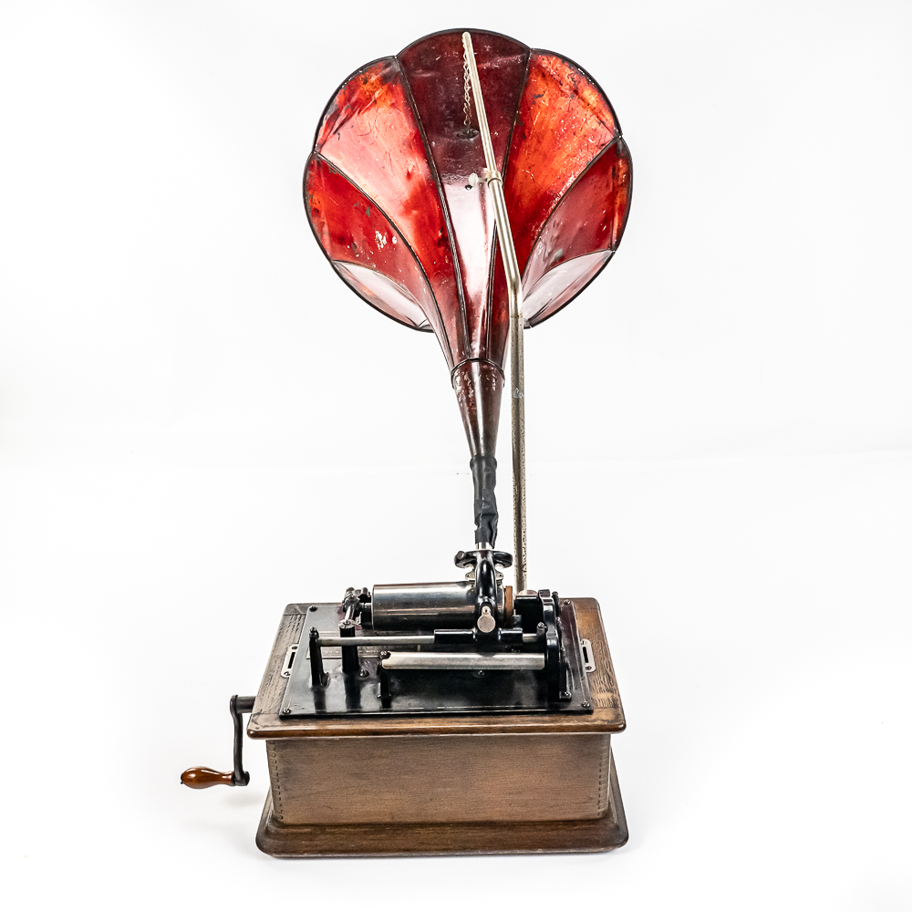This machine with its oak cabinet and cover has been refinished and redecaled and is in otherwise good condition. This 2/4 minute machine has 2 original reproducers – model C and H with good stylus. Carriage and mandrill move freely. The upper mech and bed plate have their original paint and pinstripes in good condition. Has its original winding crank and the motor winds and runs. Also included is an older high quality reproduction horn support assembly in good condition. Also included is a 32″L ten panel Edison Standard steel horn. The horn has its original paint, pinstripes and decals all of which are in good condition. The horn appears to have been clear coated inside and out There are a few minor abrasions as well as some paint loss near the small end. Cabinet and cover measure 13″ X 9-1/2″ X 11″ T.