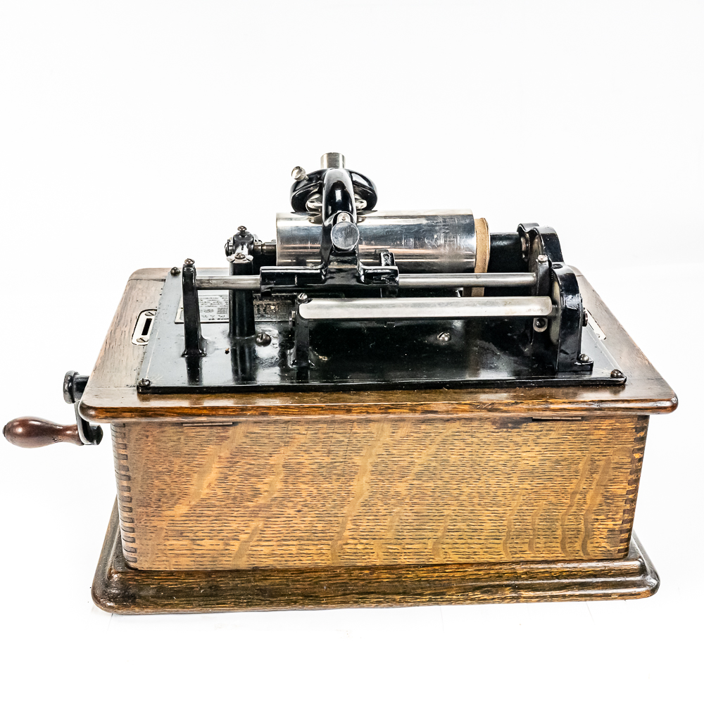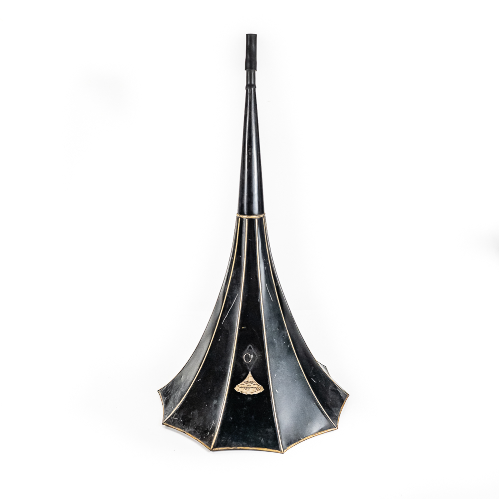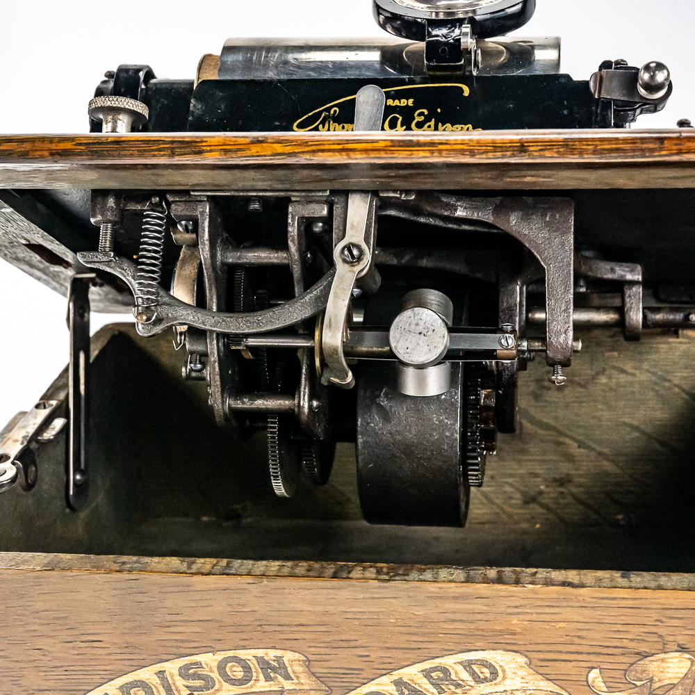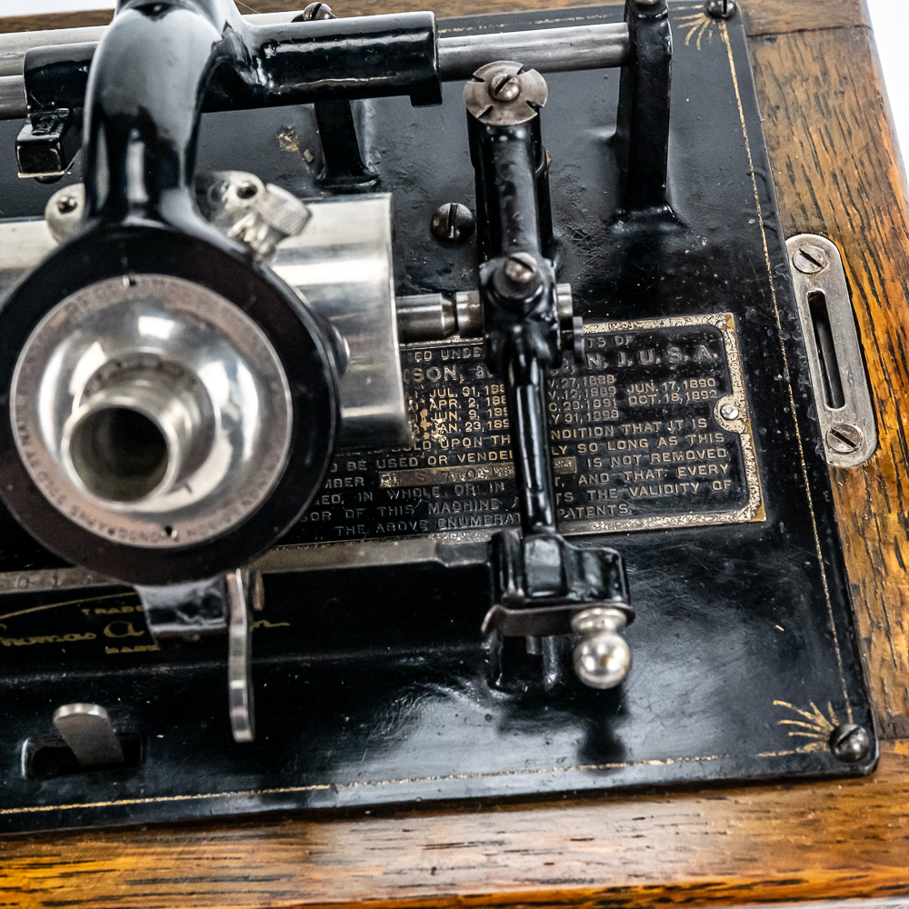 This machine in its oak cabinet and cover which have their original “limed”oak finish and large black and gold banner decal all of which are in good original condition. The model C reproducer has a good stylus. Carriage and mandrill move freely The upper mech and bed plate all have their original black paint and pinstripes in average condition. Has its original slotted cast iron winding crank and the motor winds and runs. Also included is a high quality reproduction horn support assembly in average condition. Also included is a 32″ L which is 19″ diameter at the large end 10 panel Edison Standard steel horn with its original black paint, pinstripes and decals in average condition with some minor scratches, dings and some rust. in average condition. Cabinet and cover measure 13″ X 9″ X 10” T.