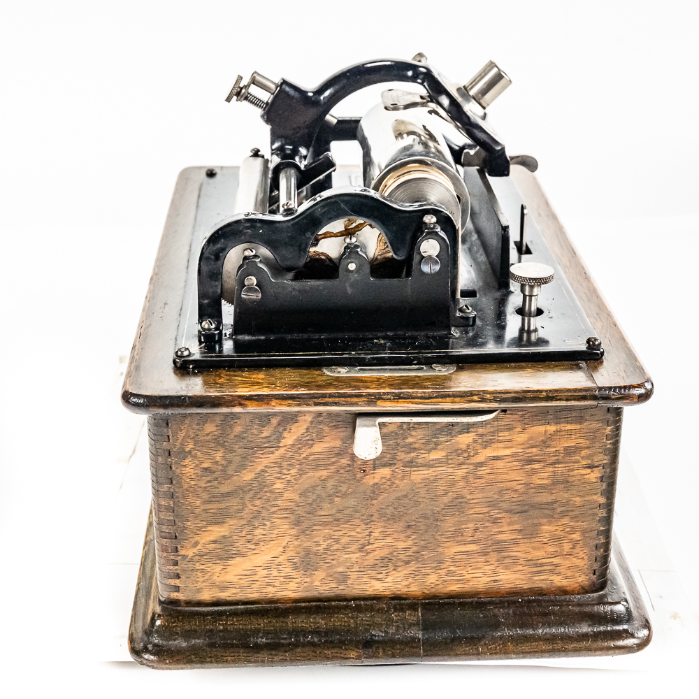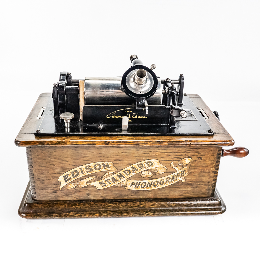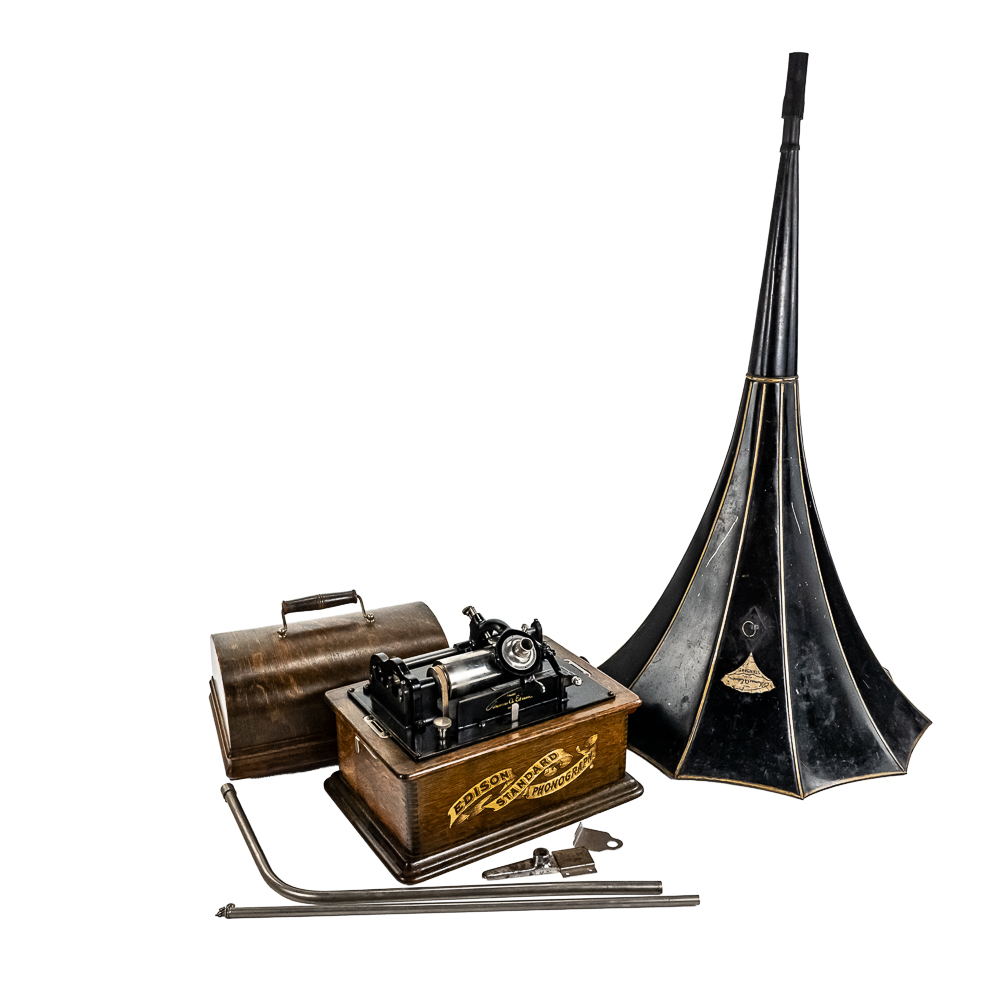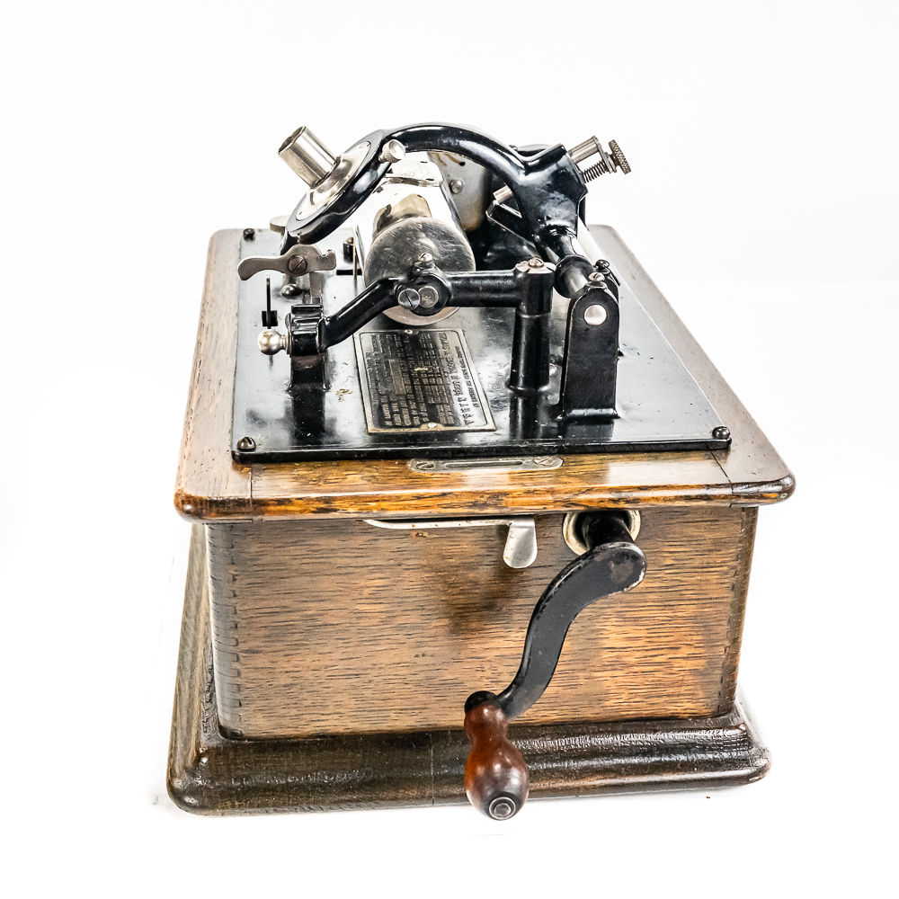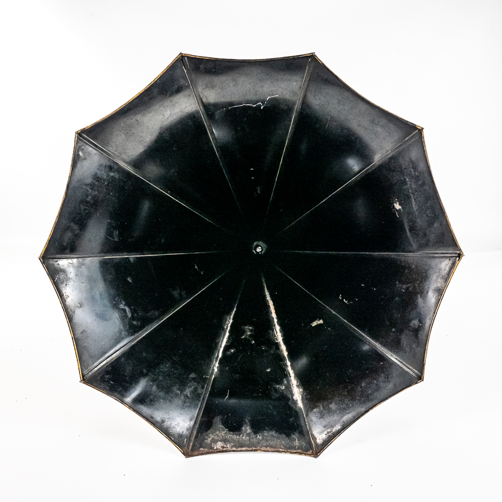 This machine in its oak cabinet and cover which have their original “limed”oak finish and large black and gold banner decal all of which are in good original condition. The model C reproducer has a good stylus. Carriage and mandrill move freely The upper mech and bed plate all have their original black paint and pinstripes in average condition. Has its original slotted cast iron winding crank and the motor winds and runs. Also included is a high quality reproduction horn support assembly in average condition. Also included is a 32″ L which is 19″ diameter at the large end 10 panel Edison Standard steel horn with its original black paint, pinstripes and decals in average condition with some minor scratches, dings and some rust. in average condition. Cabinet and cover measure 13″ X 9″ X 10” T.