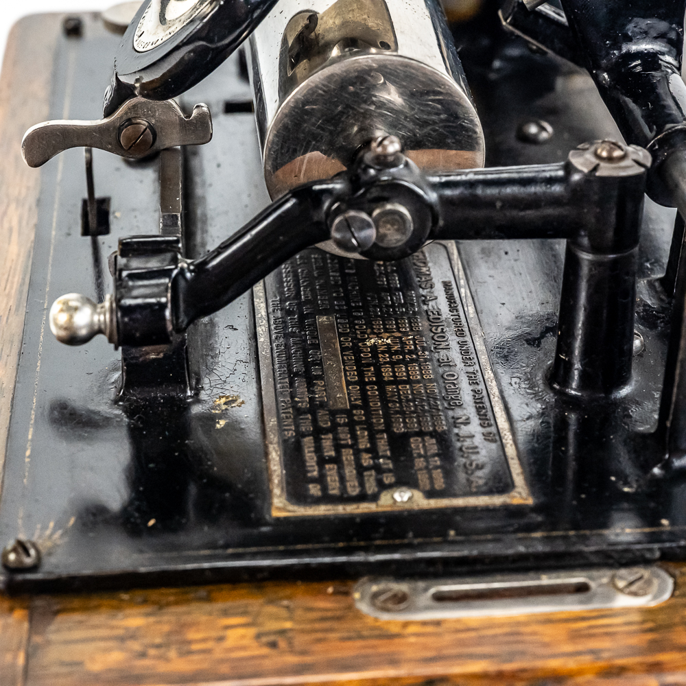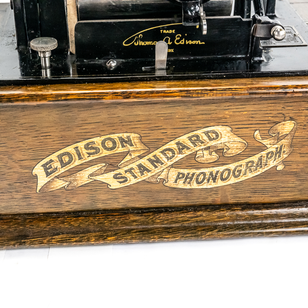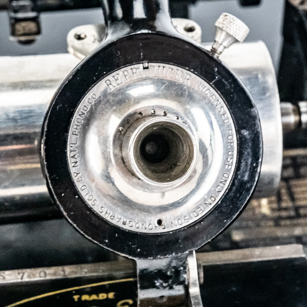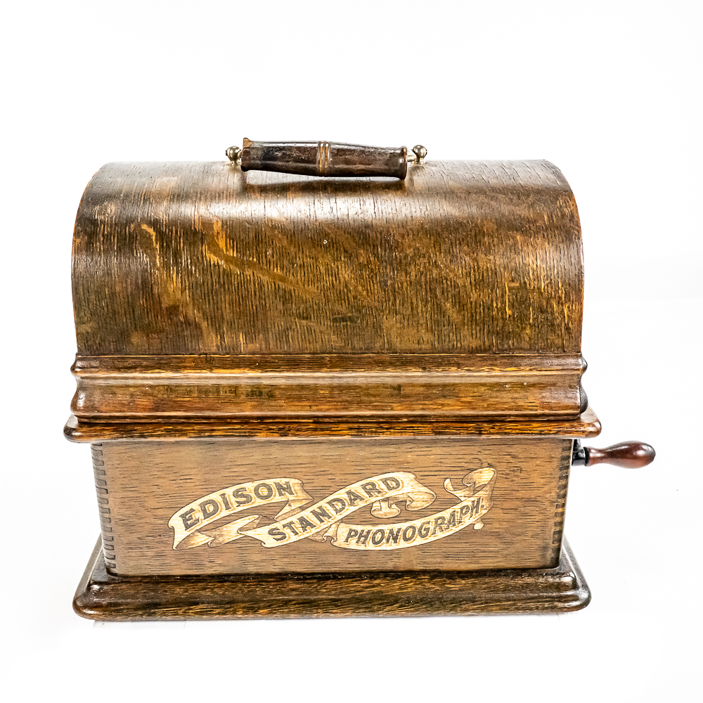 This machine in its oak cabinet and cover which have their original “limed”oak finish and large black and gold banner decal all of which are in good original condition. The model C reproducer has a good stylus. Carriage and mandrill move freely The upper mech and bed plate all have their original black paint and pinstripes in average condition. Has its original slotted cast iron winding crank and the motor winds and runs. Also included is a high quality reproduction horn support assembly in average condition. Also included is a 32″ L which is 19″ diameter at the large end 10 panel Edison Standard steel horn with its original black paint, pinstripes and decals in average condition with some minor scratches, dings and some rust. in average condition. Cabinet and cover measure 13″ X 9″ X 10” T.