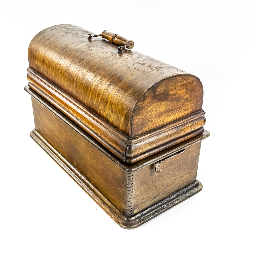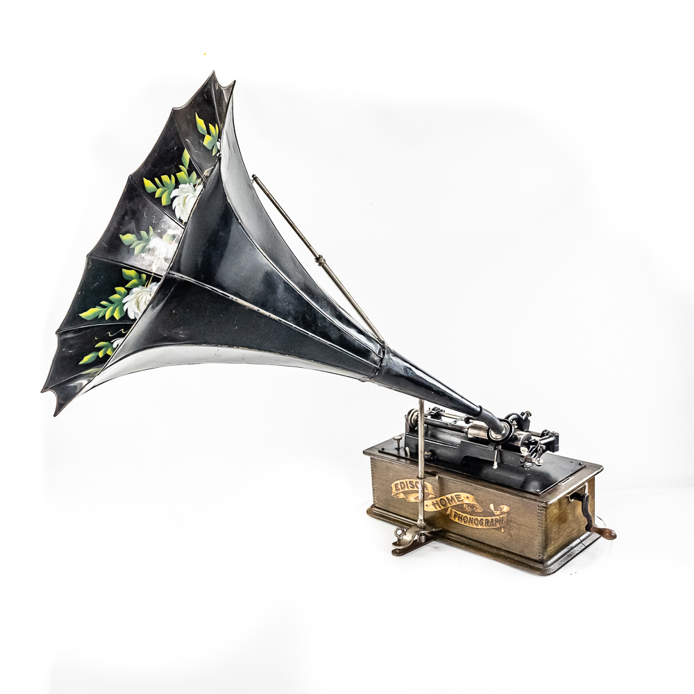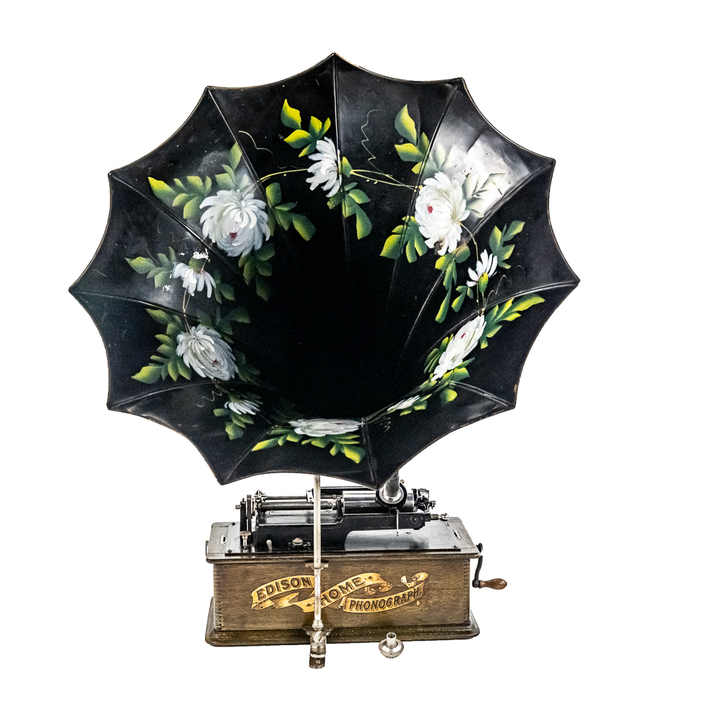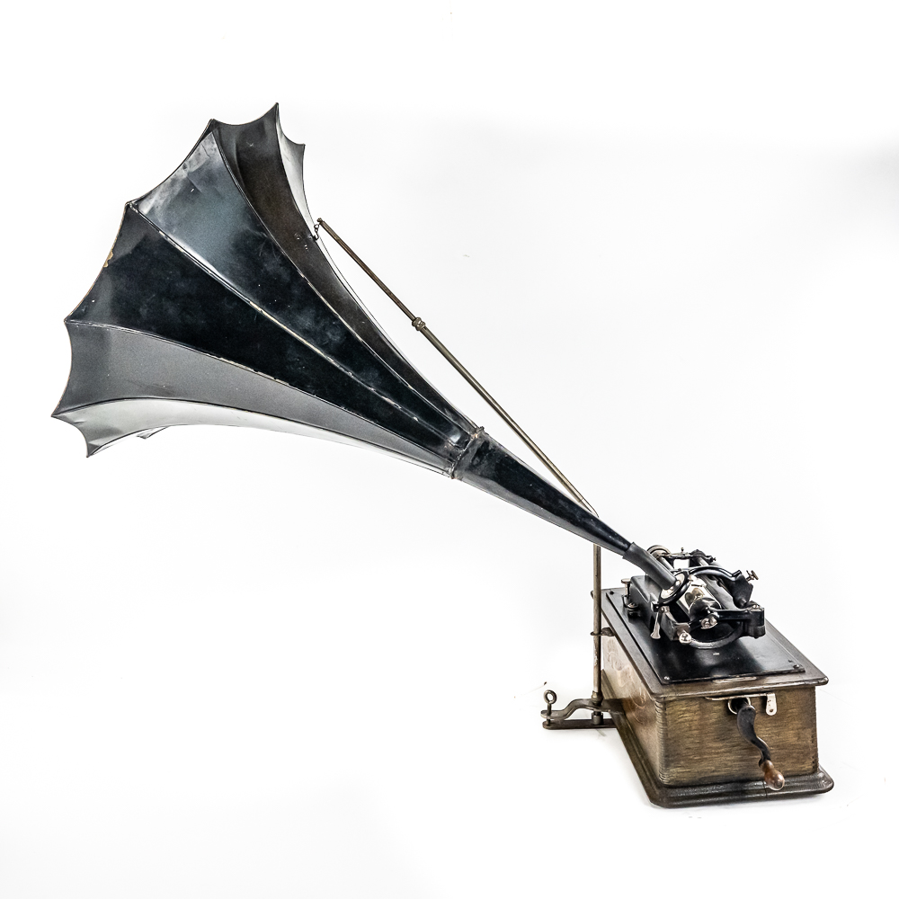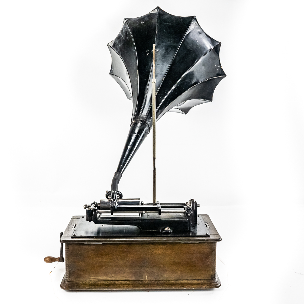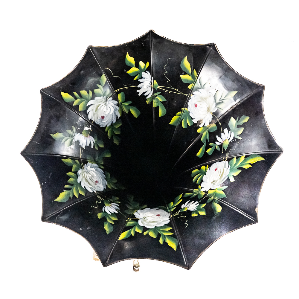 This machine in its oak cabinet and cover have their original “limed” oak finish. Both have some minor finish loss here and there and appear to have been recoated. and average in appearance. .This machine has a 2/4 minute conversion and comes with both a model C and model H reproducers both of which have good stylus’. Carriage and mandrill move freely. The upper mech and bed plate have their original black paint and pinstripes in fair condition with the usual wear. Has its original slotted cast iron winding crank which is damaged at the slotted end however still useable. The motor winds and runs. Also included is an unusual original horn support which has its original nickel plating with some peeling and rust in fair condition. Also included is an after market 32″ L 11 panel hand painted steel horn which is 22″ at the large end. The inside of the horn is hand painted with a floral design depicting white peonies with green leaves. The inside of the horn with the paintings is in good condition however the outside of the horn appears to have been clear coated with evidence of a sloppy repair towards the small end of the horn where the panels join to the tapered cone. See photos. Cabinet and cover measure 18″ X 8-1/2″ X 12″ T.