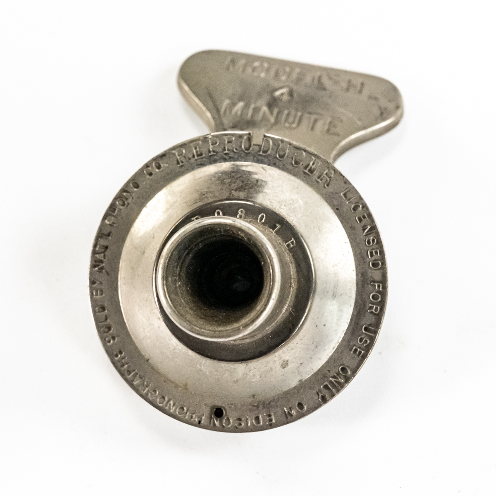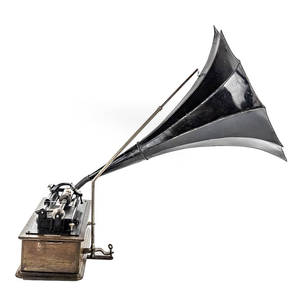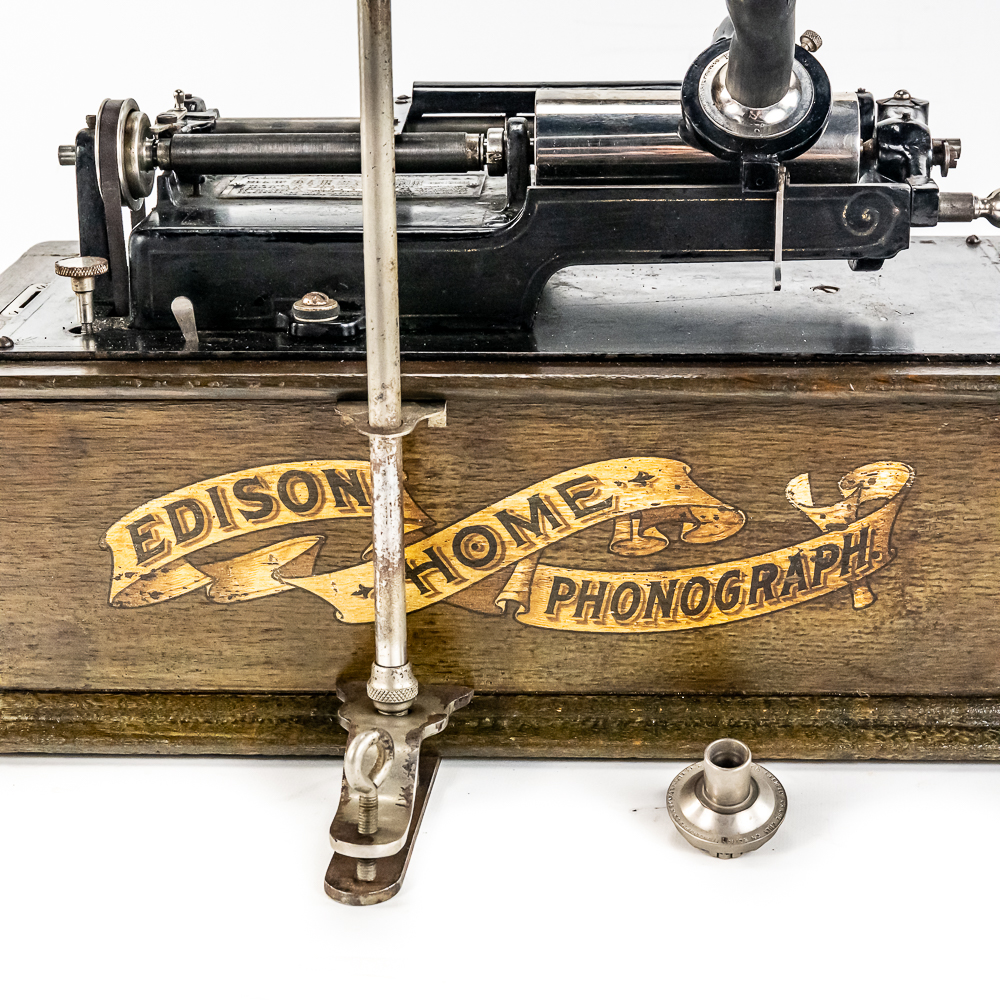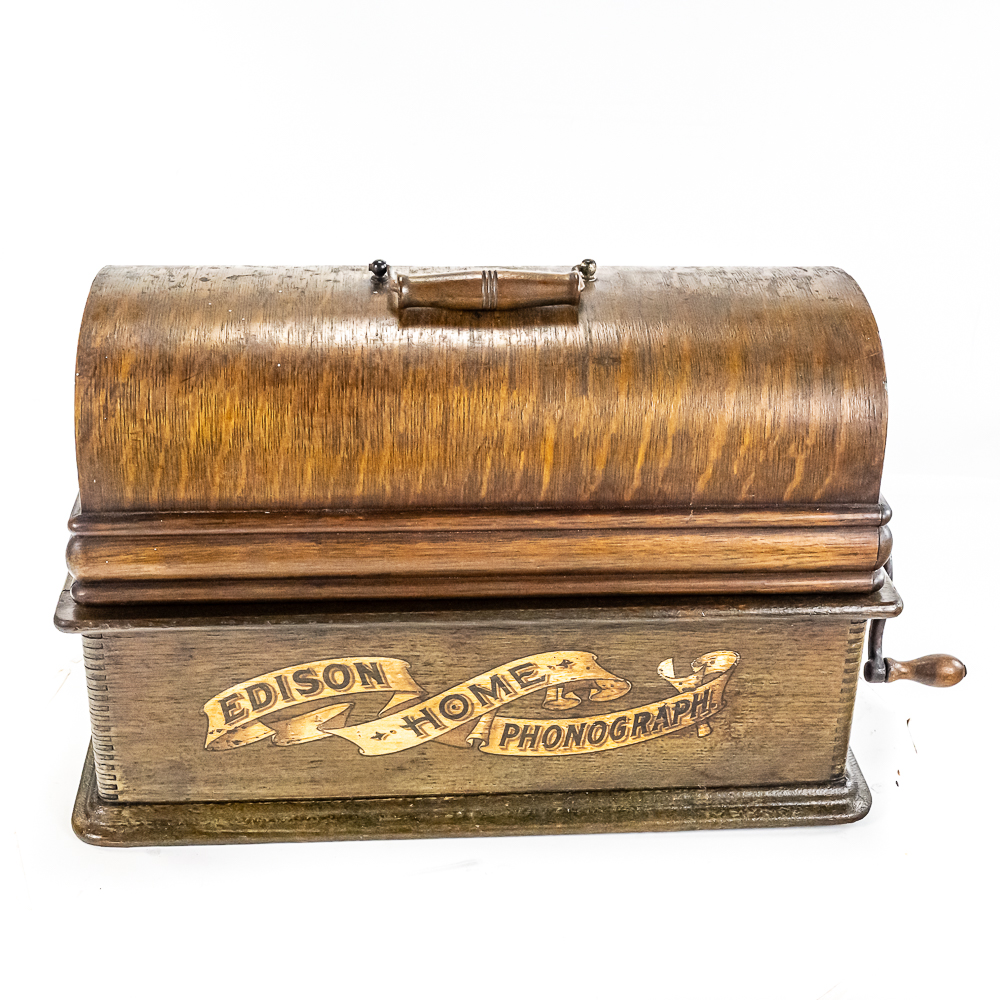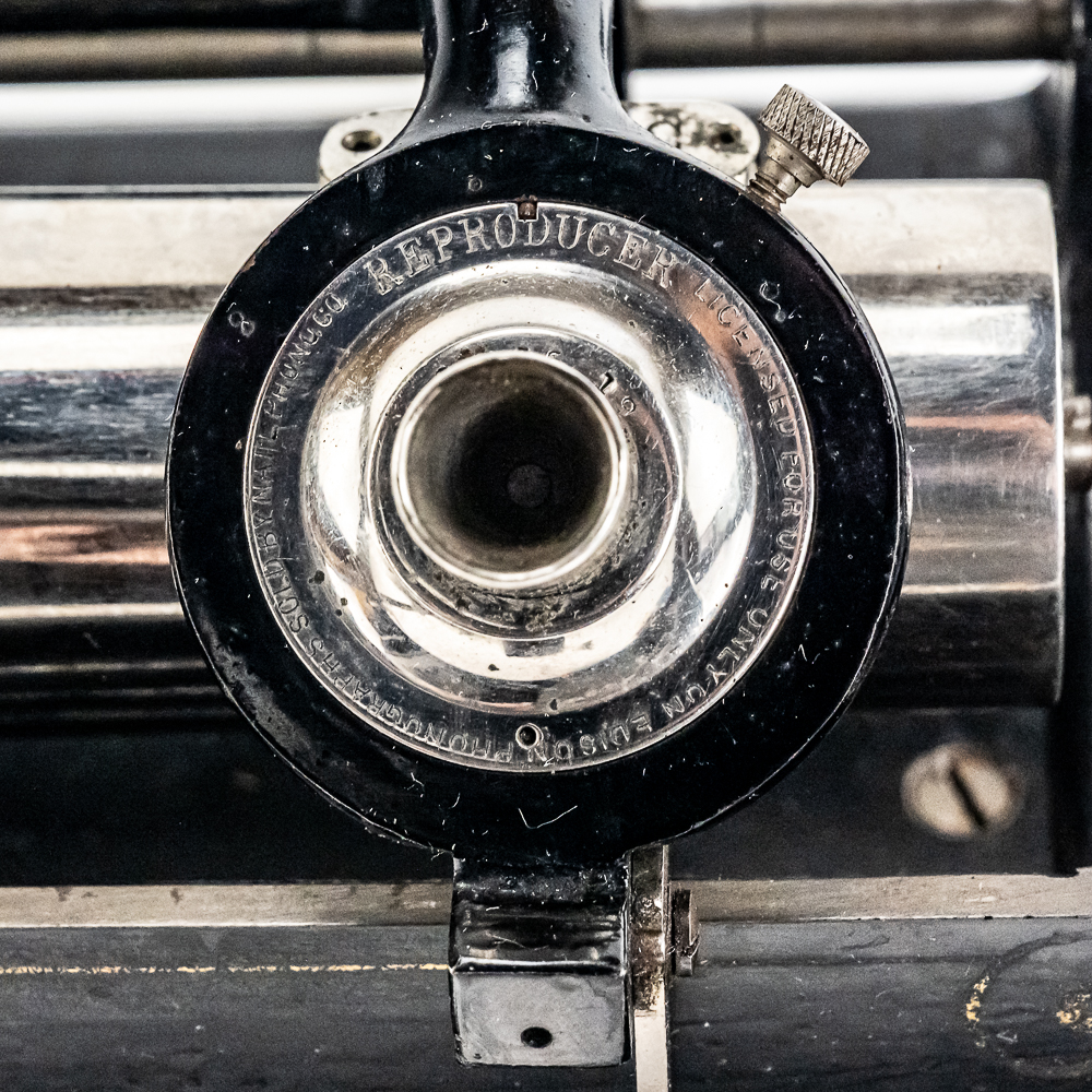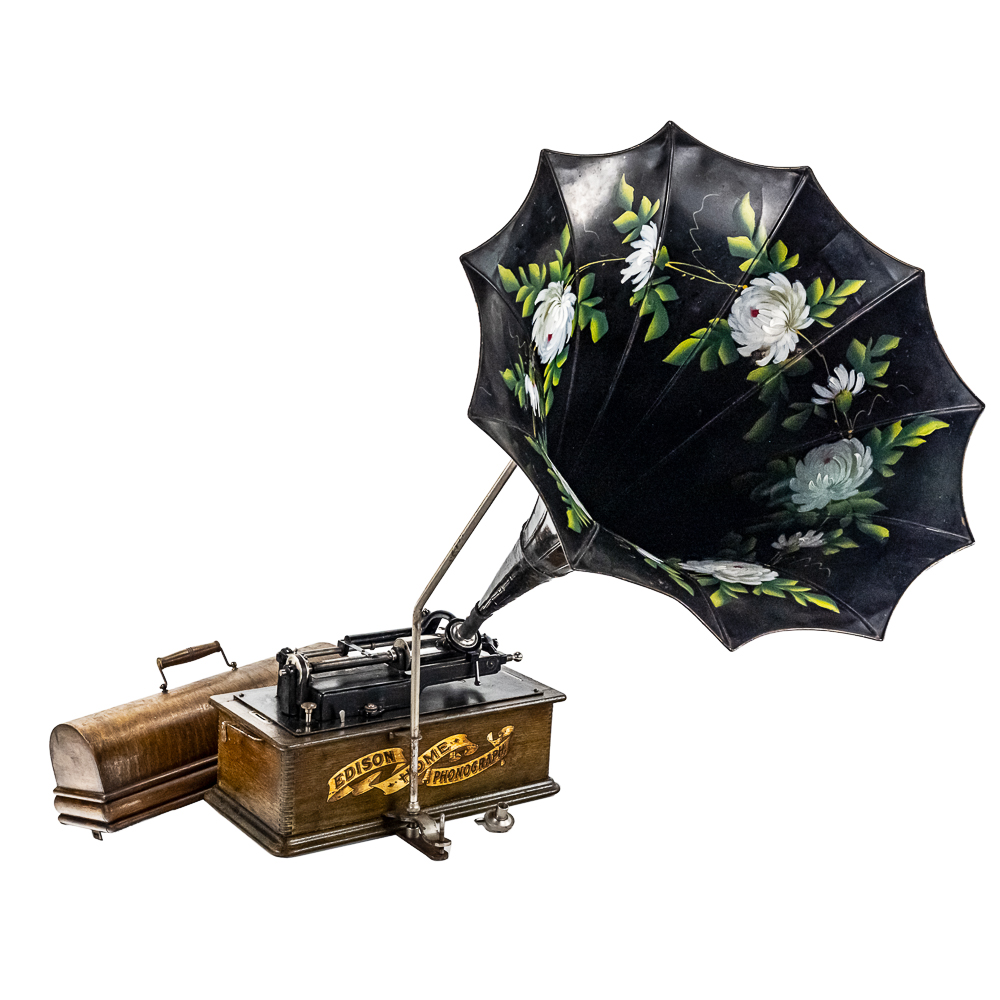 This machine in its oak cabinet and cover have their original “limed” oak finish. Both have some minor finish loss here and there and appear to have been recoated. and average in appearance. .This machine has a 2/4 minute conversion and comes with both a model C and model H reproducers both of which have good stylus’. Carriage and mandrill move freely. The upper mech and bed plate have their original black paint and pinstripes in fair condition with the usual wear. Has its original slotted cast iron winding crank which is damaged at the slotted end however still useable. The motor winds and runs. Also included is an unusual original horn support which has its original nickel plating with some peeling and rust in fair condition. Also included is an after market 32″ L 11 panel hand painted steel horn which is 22″ at the large end. The inside of the horn is hand painted with a floral design depicting white peonies with green leaves. The inside of the horn with the paintings is in good condition however the outside of the horn appears to have been clear coated with evidence of a sloppy repair towards the small end of the horn where the panels join to the tapered cone. See photos. Cabinet and cover measure 18″ X 8-1/2″ X 12″ T.