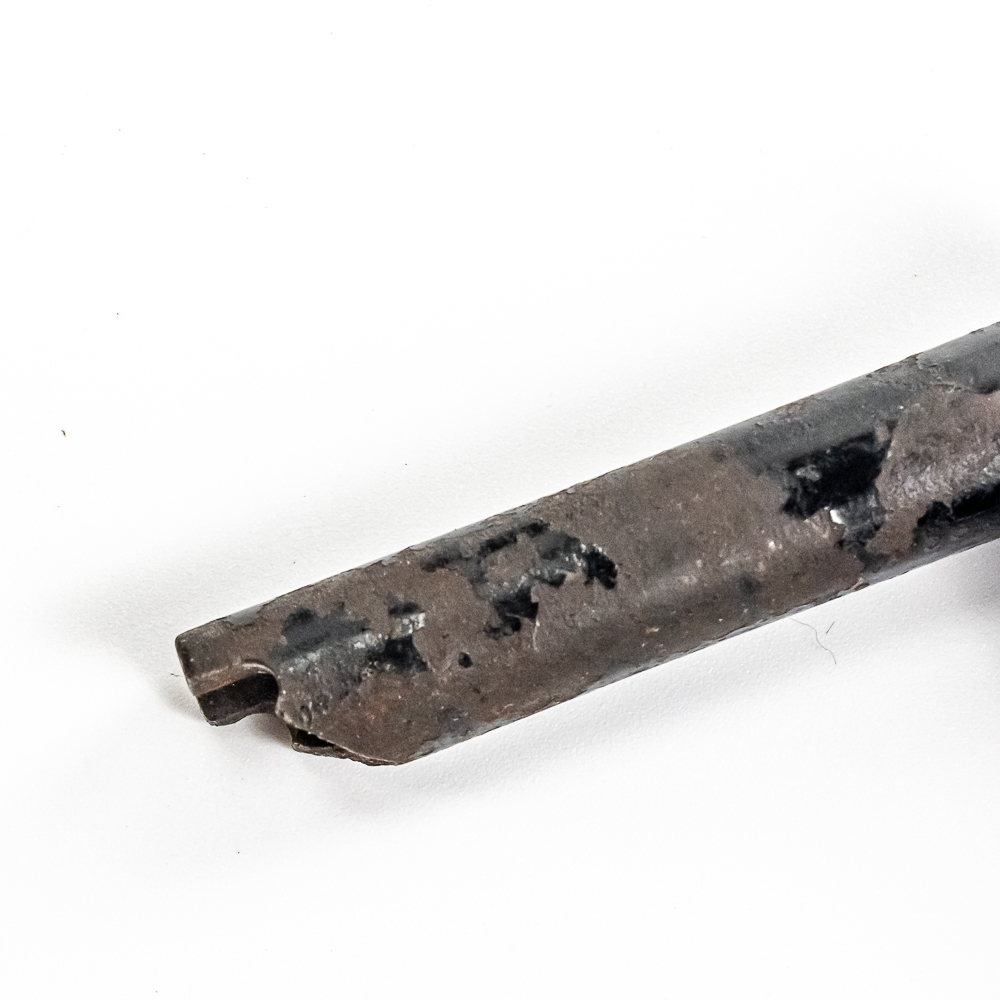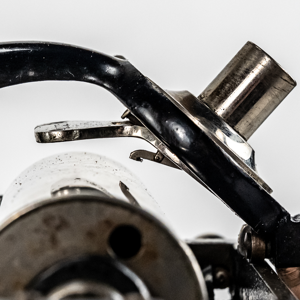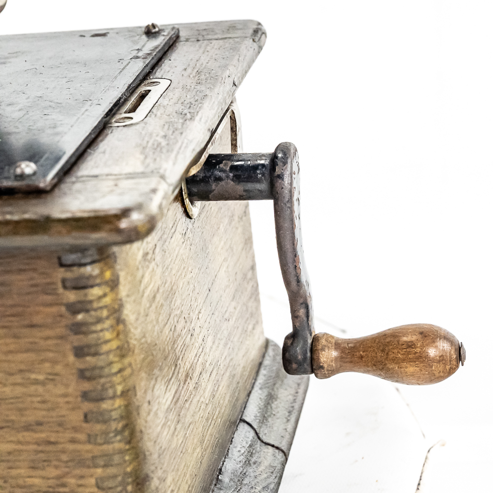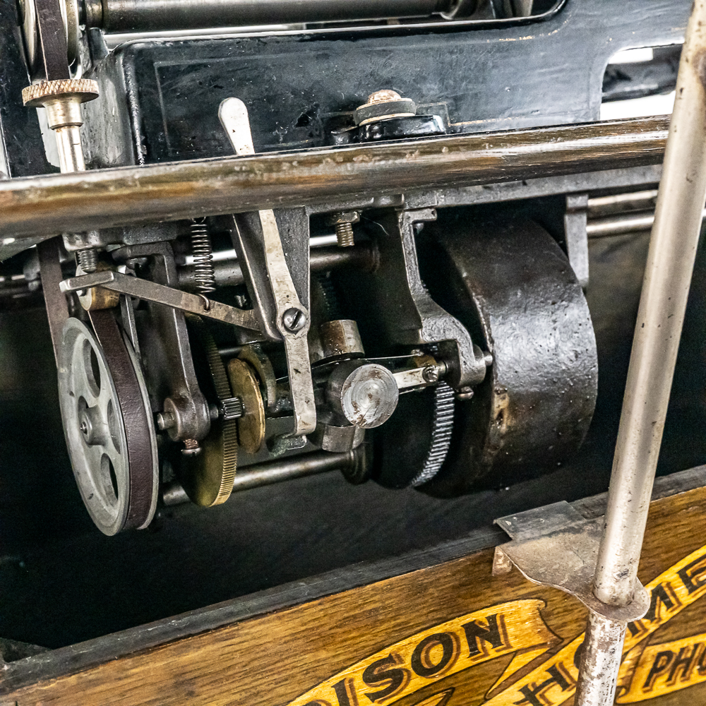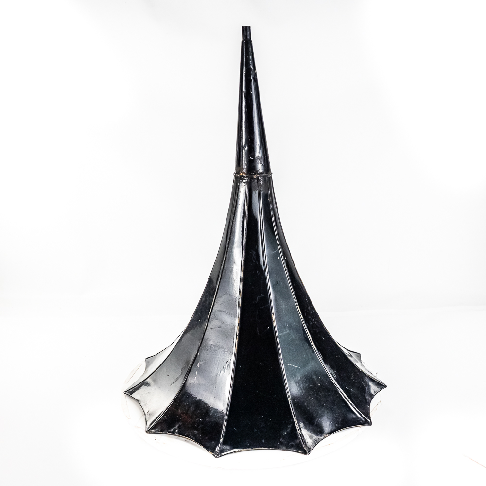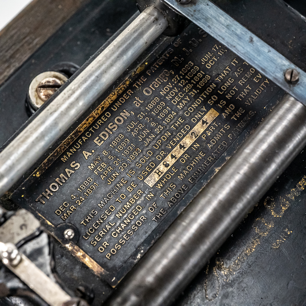 This machine in its oak cabinet and cover have their original “limed” oak finish. Both have some minor finish loss here and there and appear to have been recoated. and average in appearance. .This machine has a 2/4 minute conversion and comes with both a model C and model H reproducers both of which have good stylus’. Carriage and mandrill move freely. The upper mech and bed plate have their original black paint and pinstripes in fair condition with the usual wear. Has its original slotted cast iron winding crank which is damaged at the slotted end however still useable. The motor winds and runs. Also included is an unusual original horn support which has its original nickel plating with some peeling and rust in fair condition. Also included is an after market 32″ L 11 panel hand painted steel horn which is 22″ at the large end. The inside of the horn is hand painted with a floral design depicting white peonies with green leaves. The inside of the horn with the paintings is in good condition however the outside of the horn appears to have been clear coated with evidence of a sloppy repair towards the small end of the horn where the panels join to the tapered cone. See photos. Cabinet and cover measure 18″ X 8-1/2″ X 12″ T.