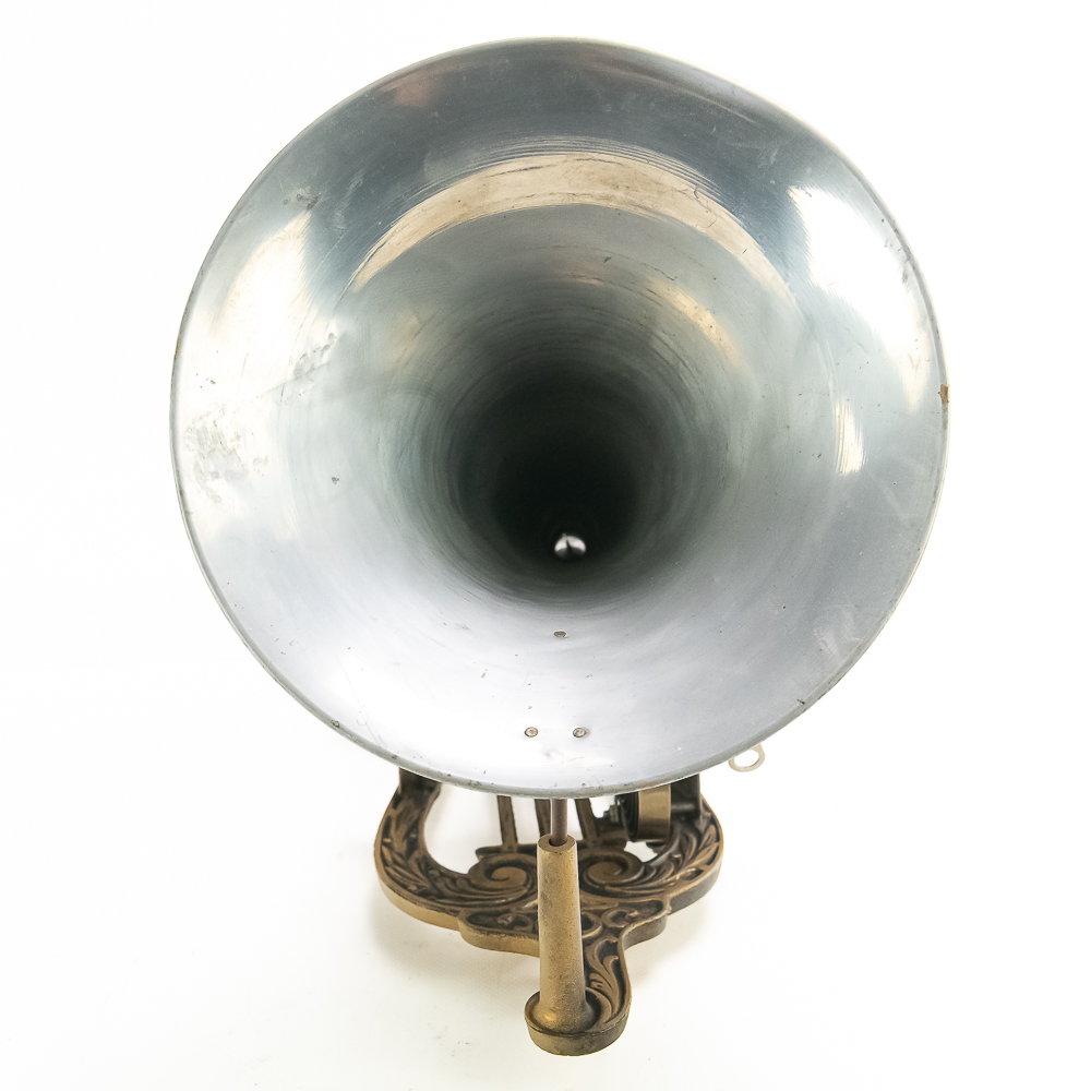 Nice all original Puck style cylinder phonograph. String missing from the drive. Motor winds and runs well. Aluminum horn. Unusual Columbia patent sticker on tin mandrel. Missing reproducer.