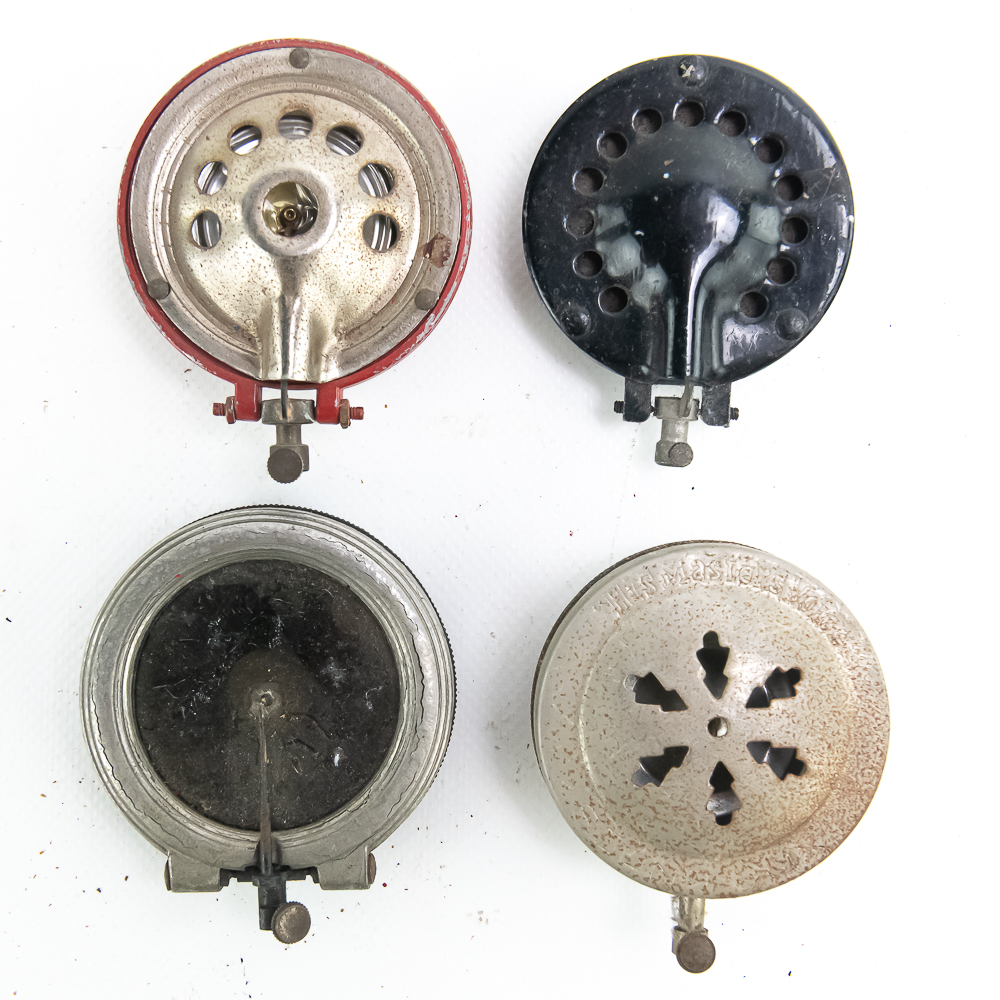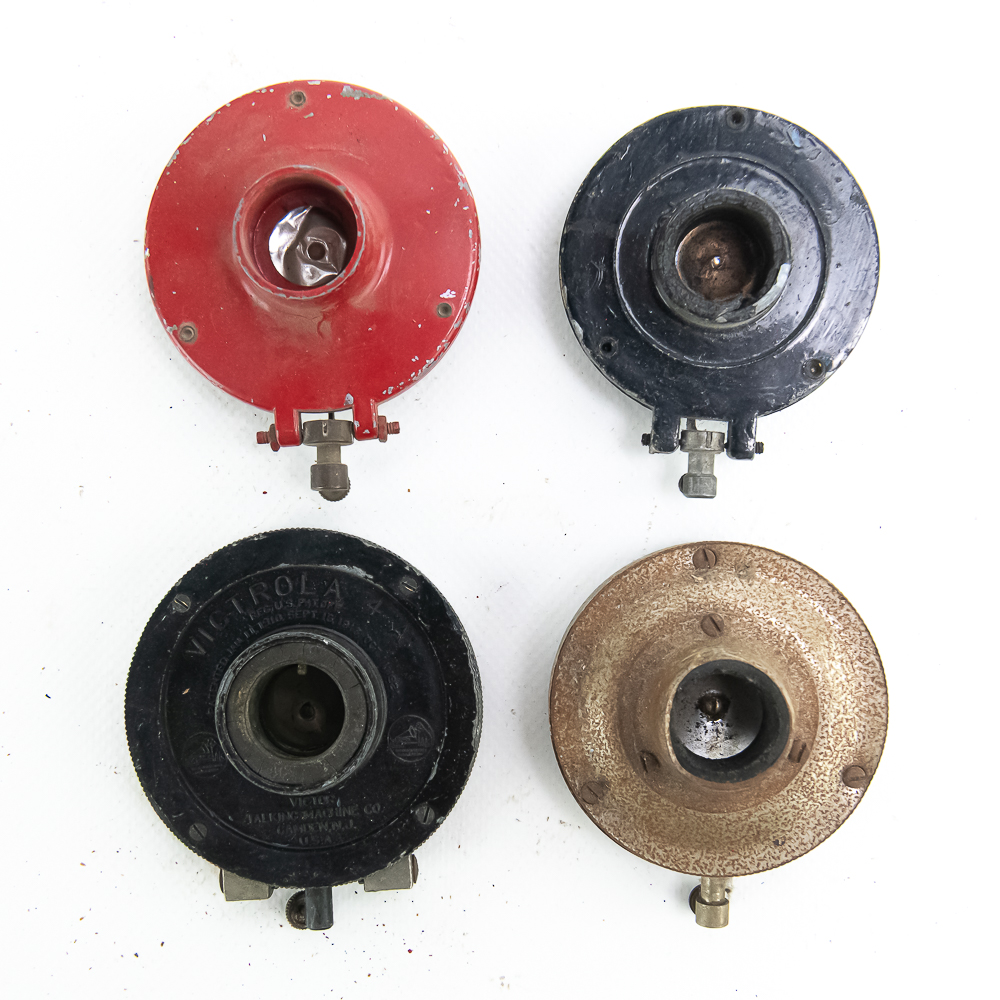 This lot consists of one nickel plated Victrola #4 reproducer in average condition and 3 various suitcase portable reproducers. All in average condition.