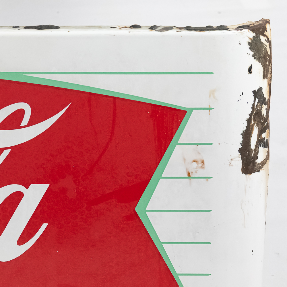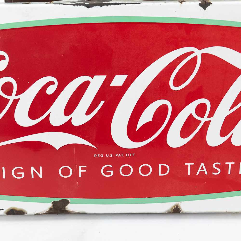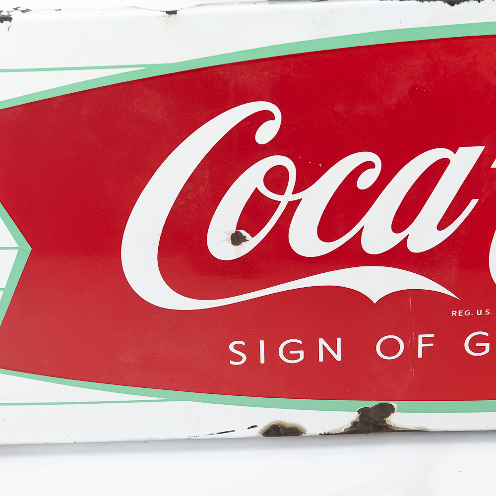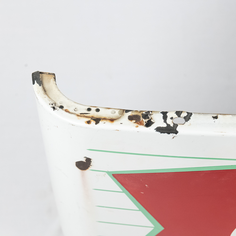 Nice bright colors. A little damage on upper right side at bend. Some porcelain chips and a surface rust spot around edge. A few small (nickel size) spots with rust on face of sign. The sign shows nicely with a vintage look.