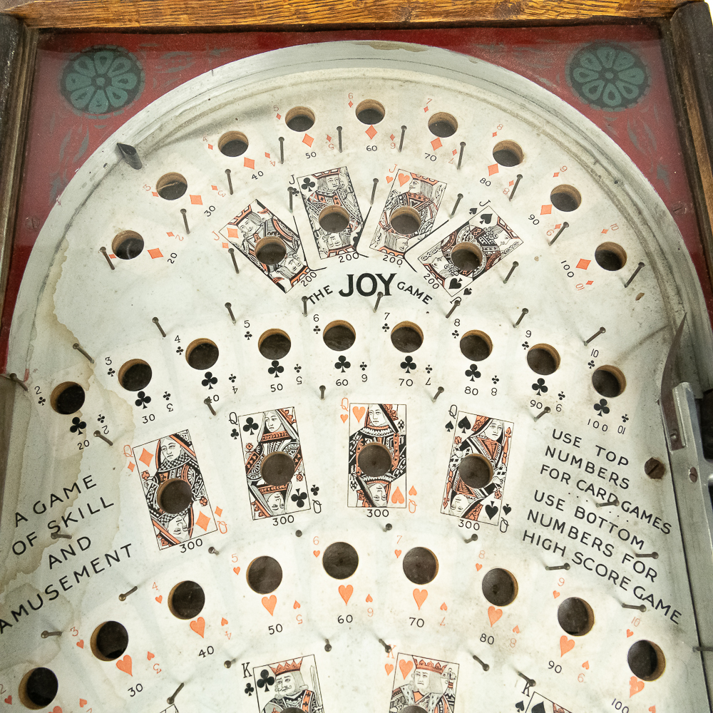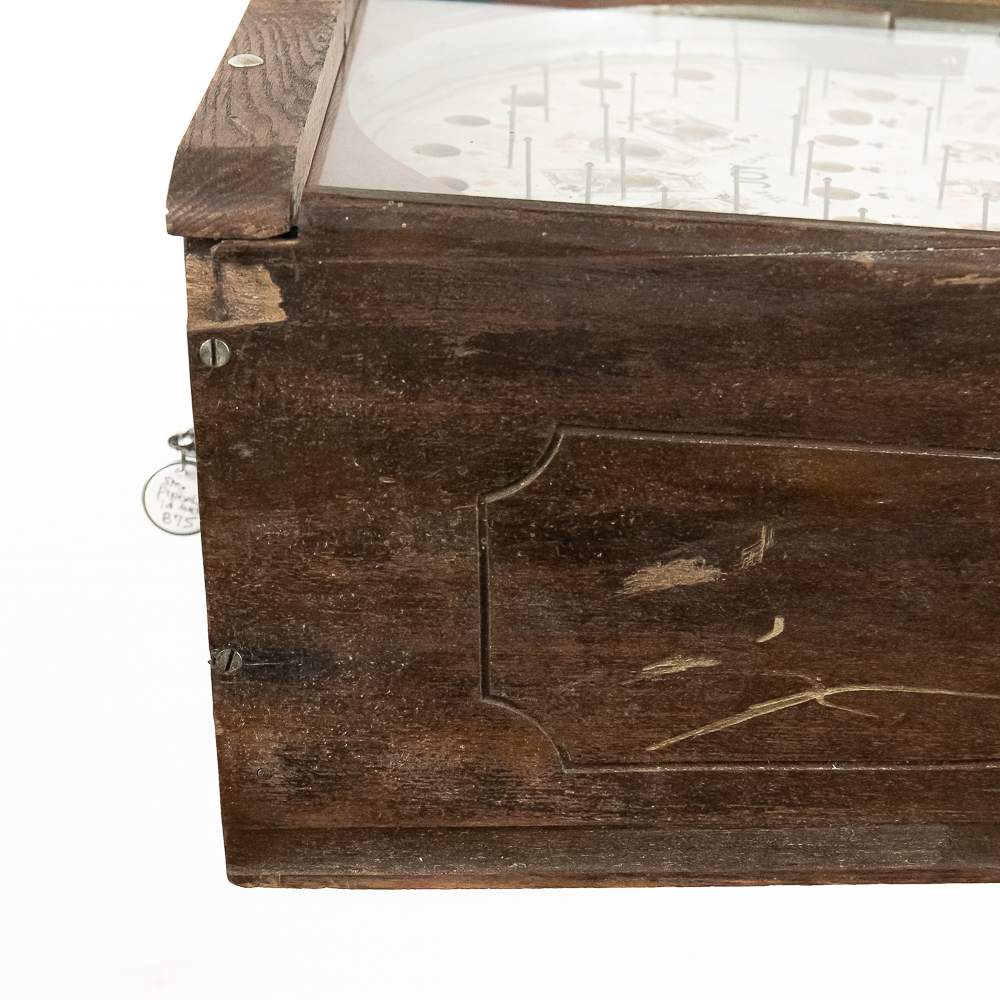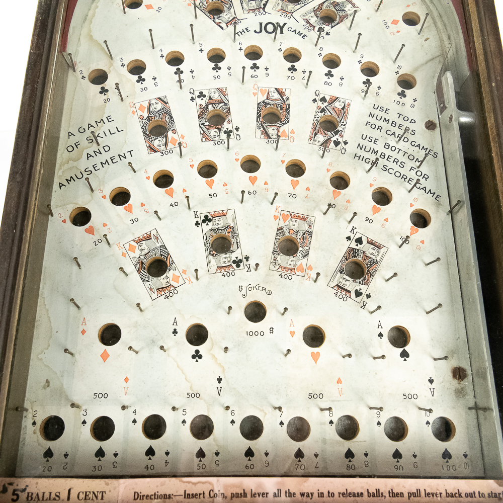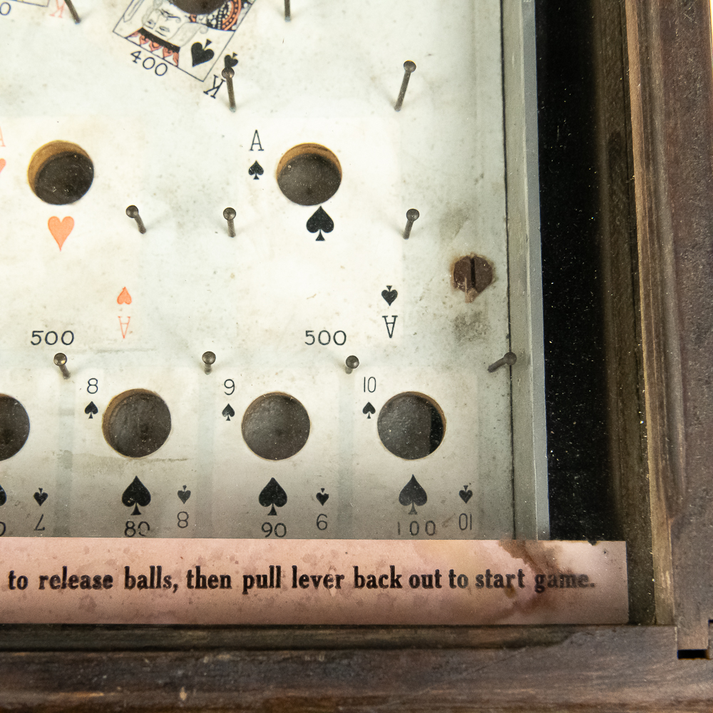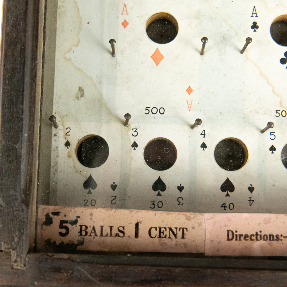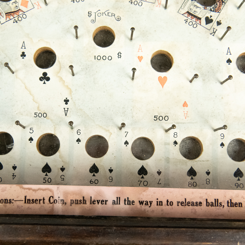 A one cent card motif, wood case pinball machine. Good glass, good clean playfield, original under glass instructions. It works as it should and has lock with key. It does have a small chunk of wood missing on left rear upper case. Not that noticeable and does not effect play. Finish is rough to fair. There are a few non-factory screws to strengthen case.