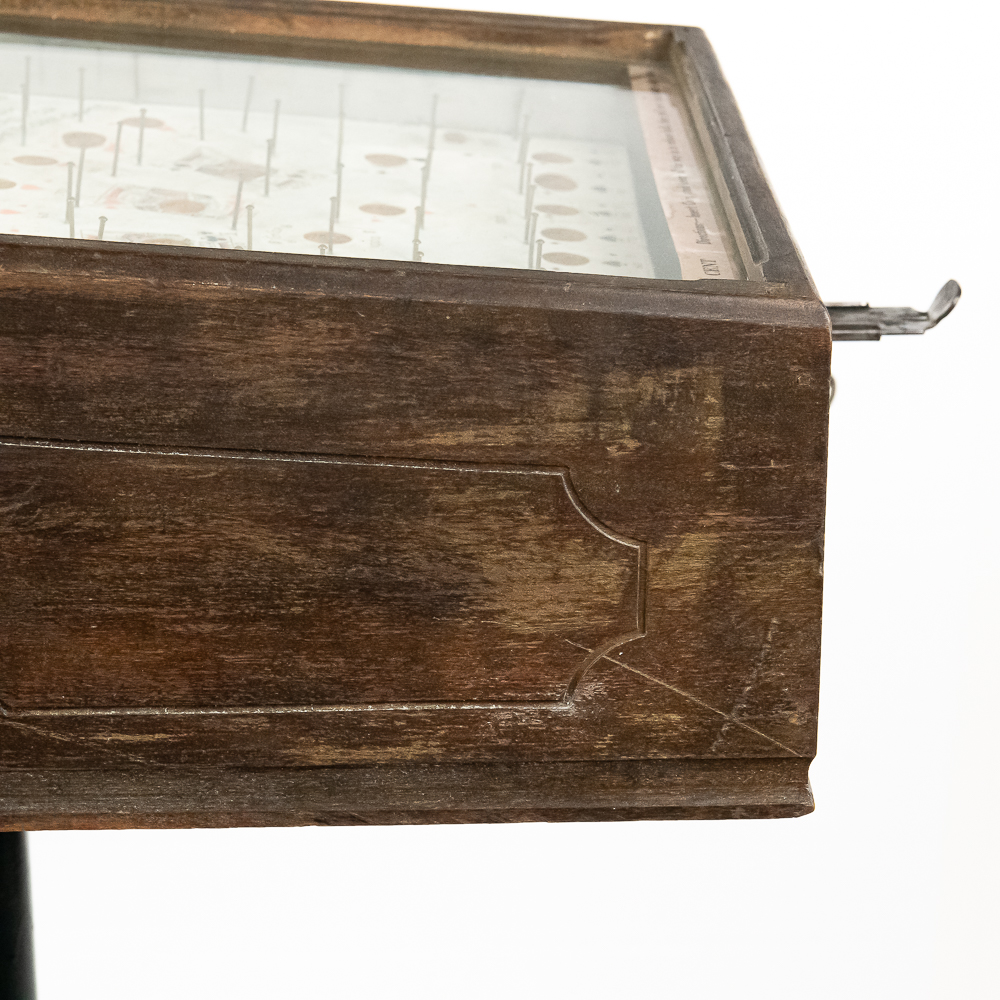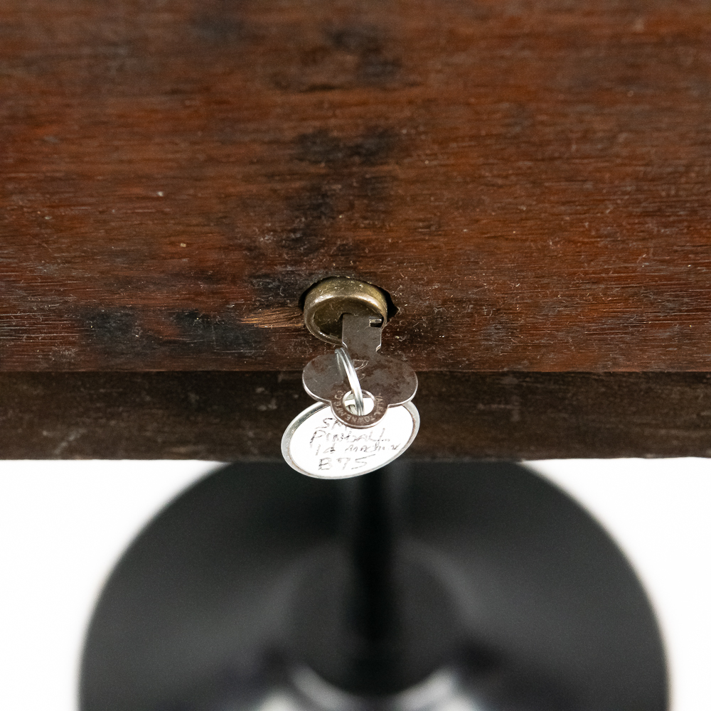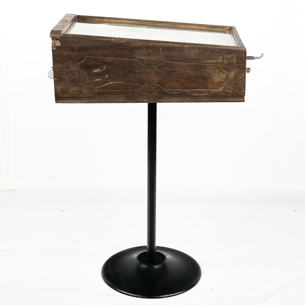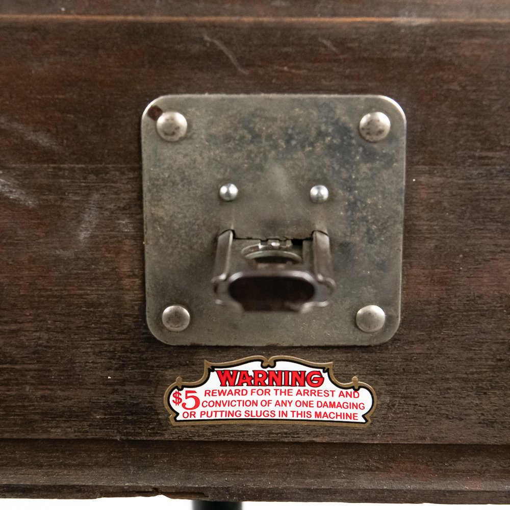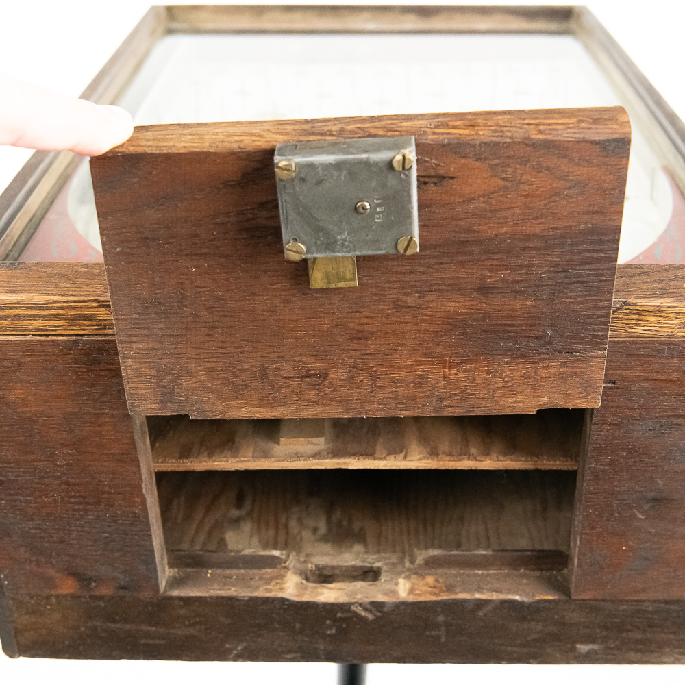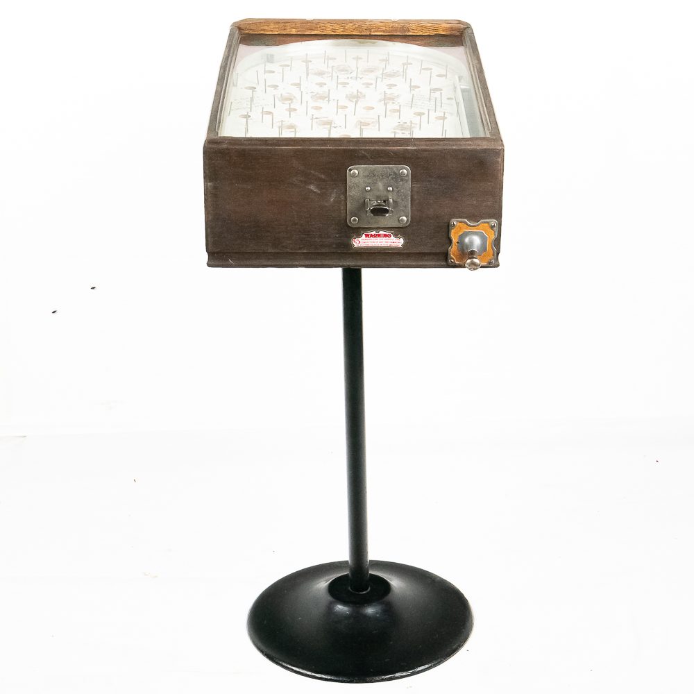 A one cent card motif, wood case pinball machine. Good glass, good clean playfield, original under glass instructions. It works as it should and has lock with key. It does have a small chunk of wood missing on left rear upper case. Not that noticeable and does not effect play. Finish is rough to fair. There are a few non-factory screws to strengthen case.