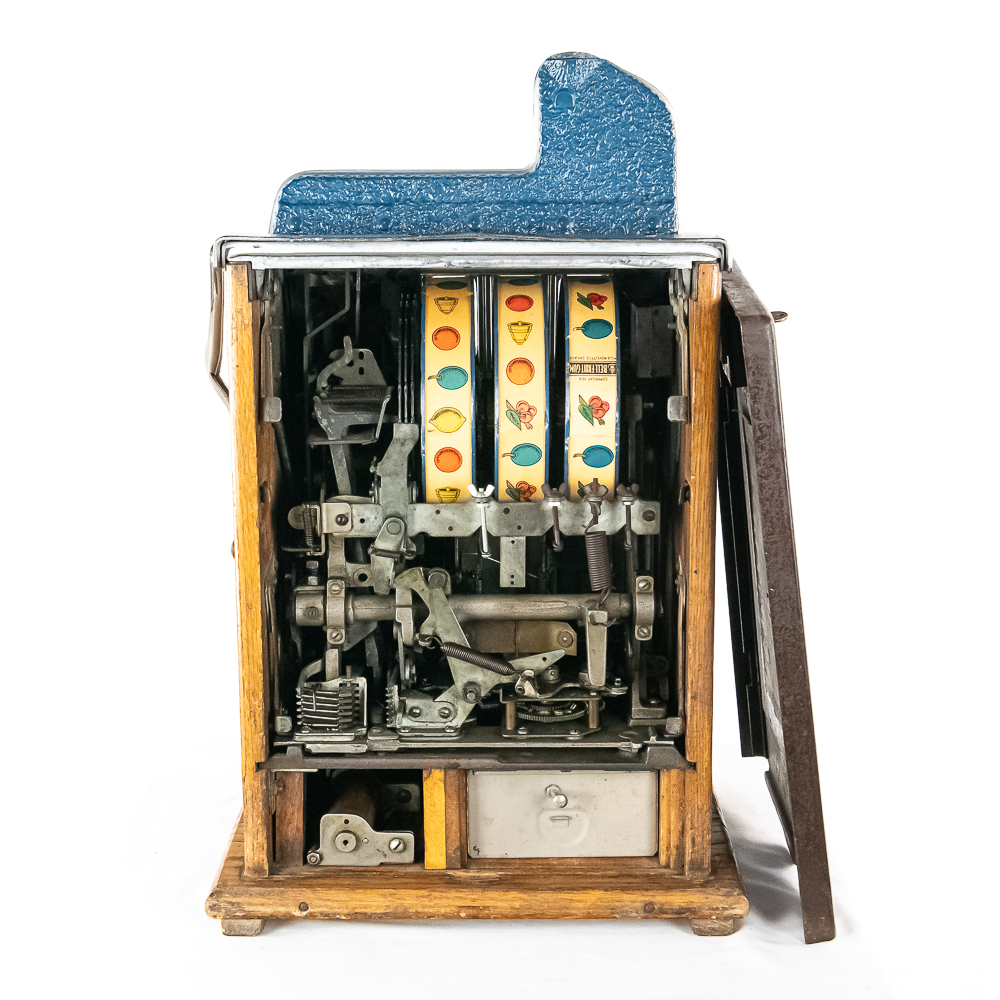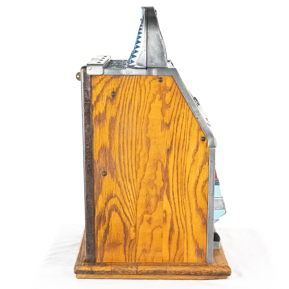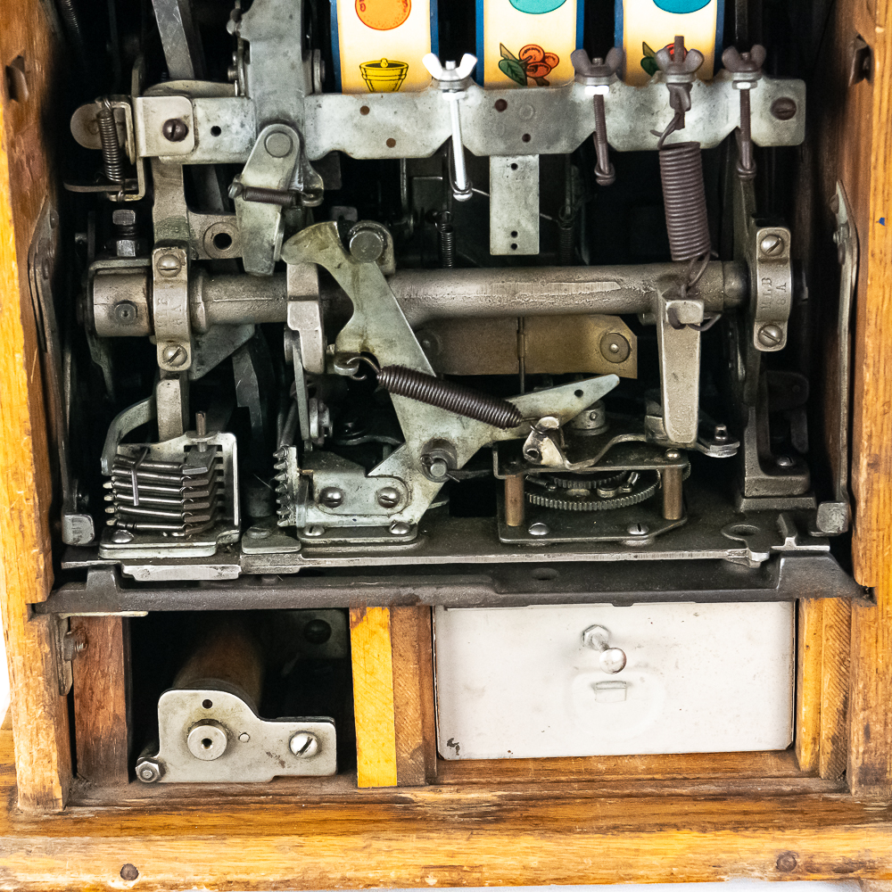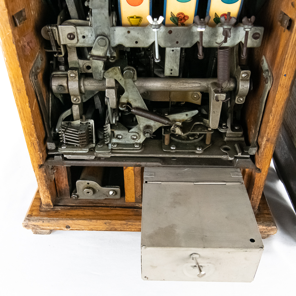 Looks to be an original or older restoration. A good looking, 3-reel, front jackpot slot that comes with key and works like it should. Overall good condition, with a few small scuffs and nicks.