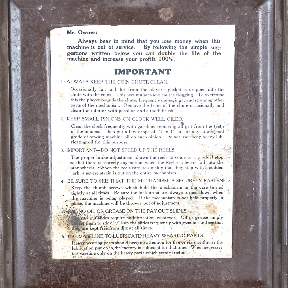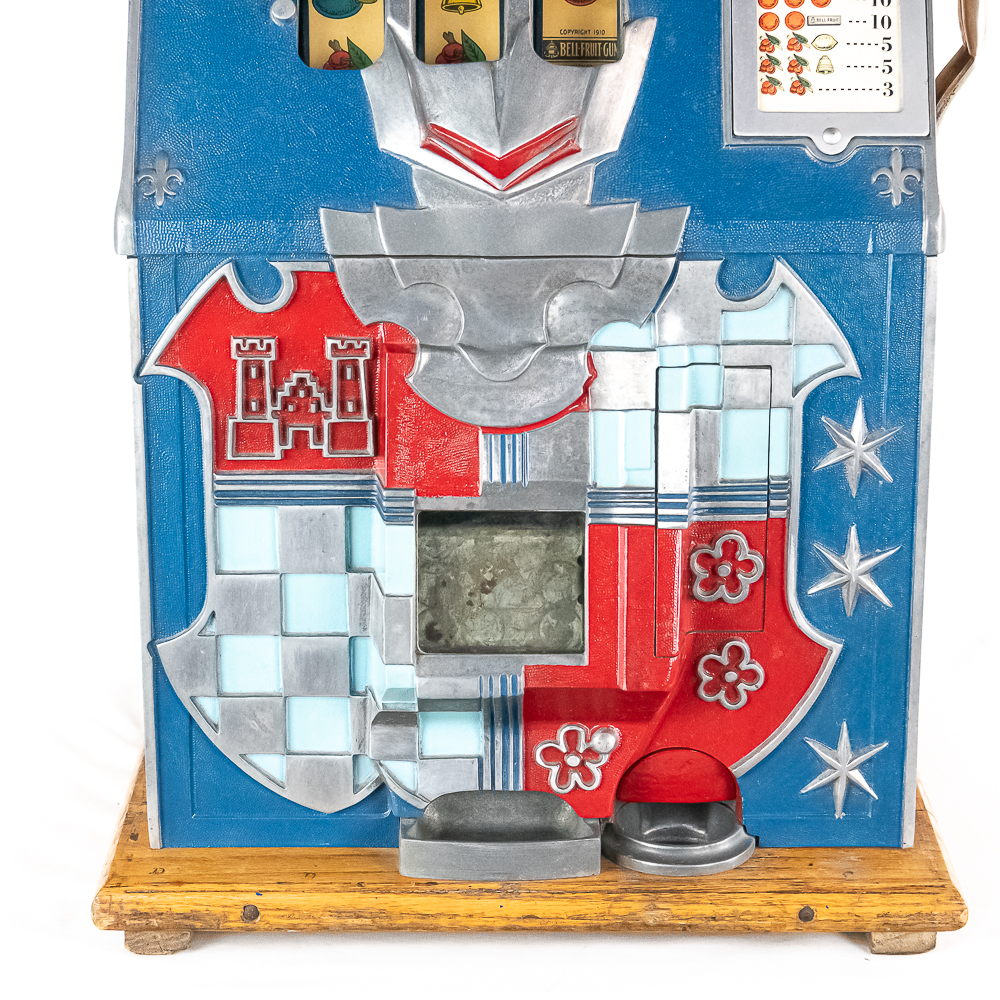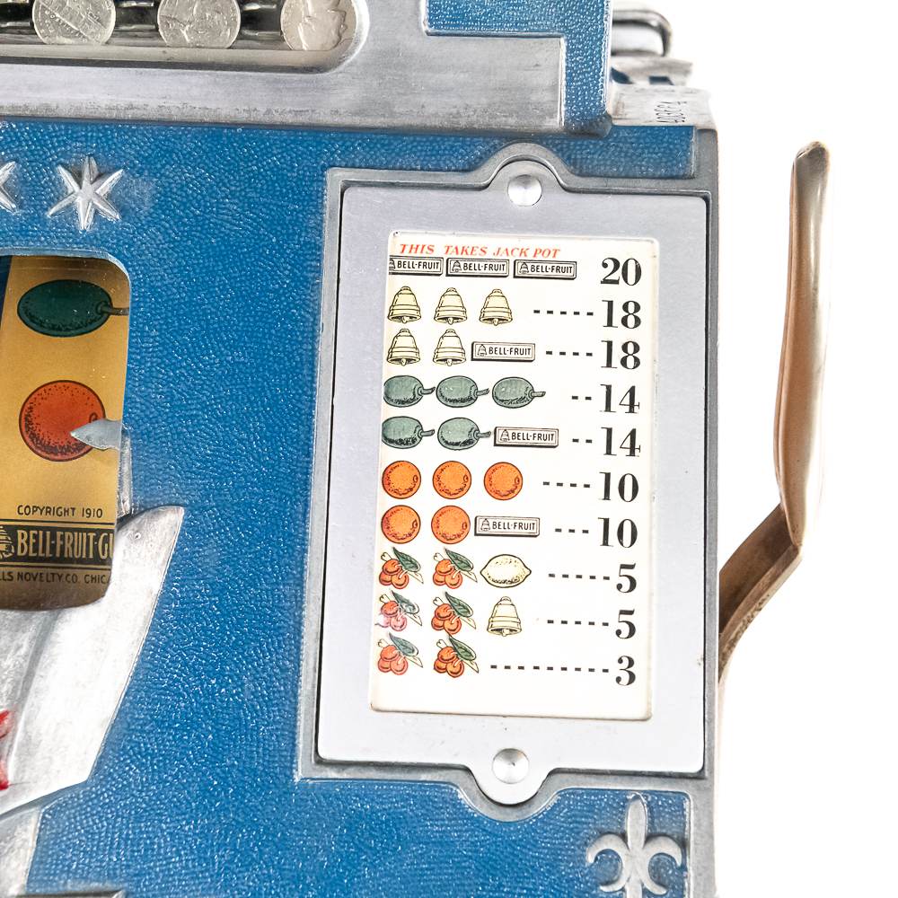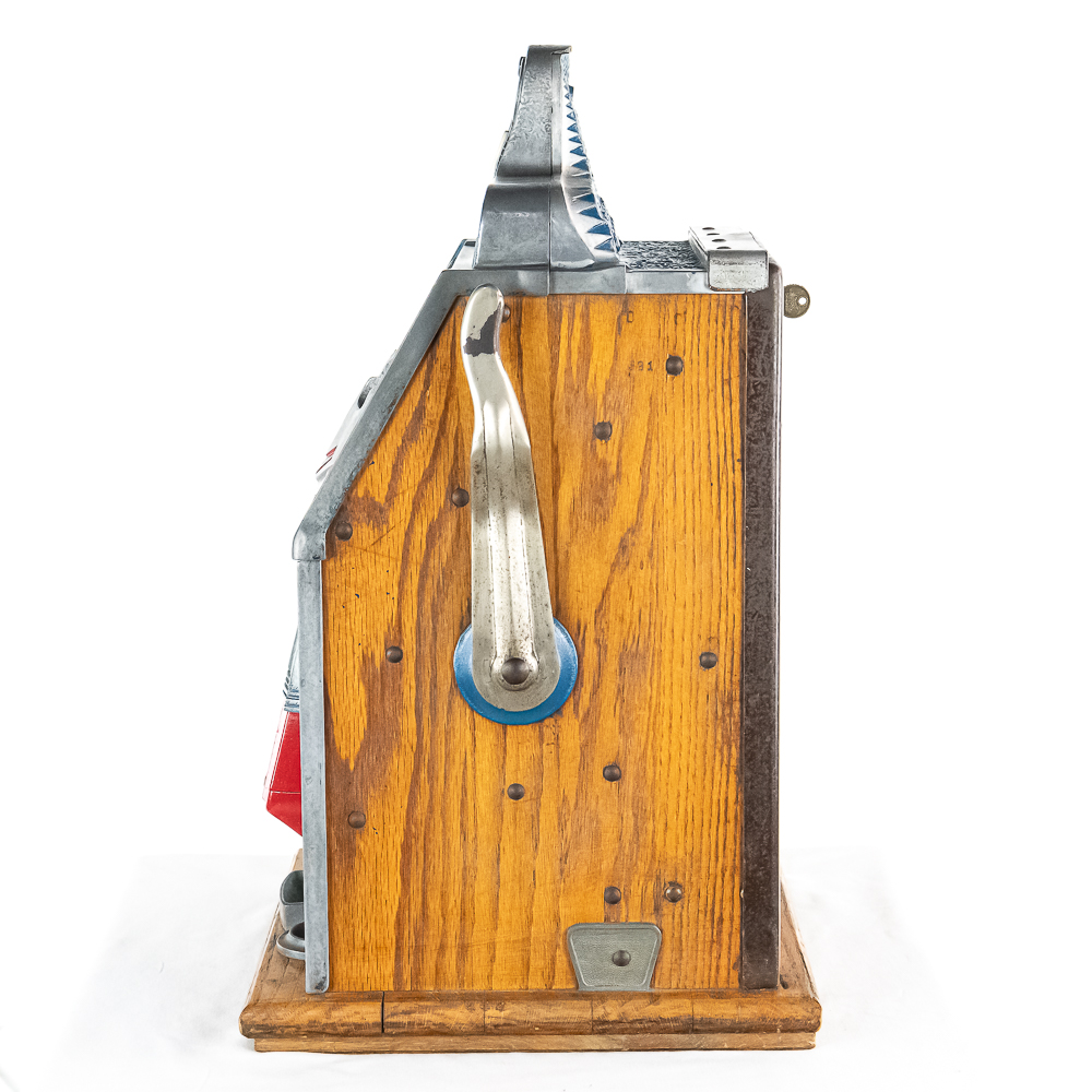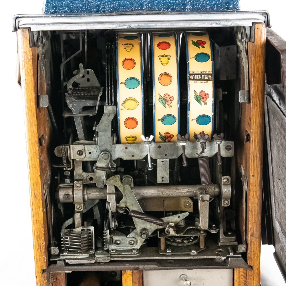 Looks to be an original or older restoration. A good looking, 3-reel, front jackpot slot that comes with key and works like it should. Overall good condition, with a few small scuffs and nicks.