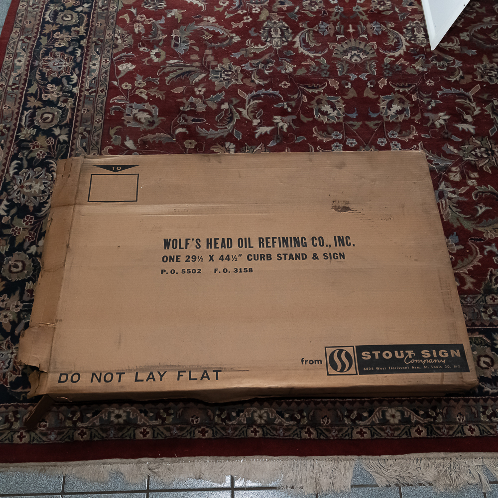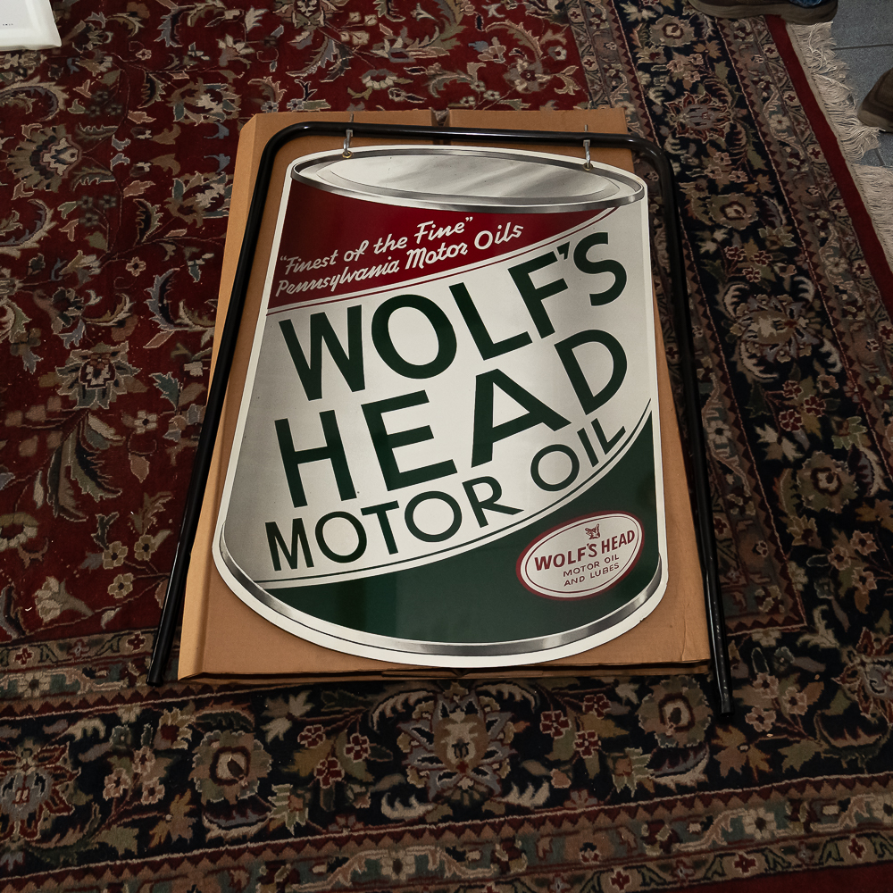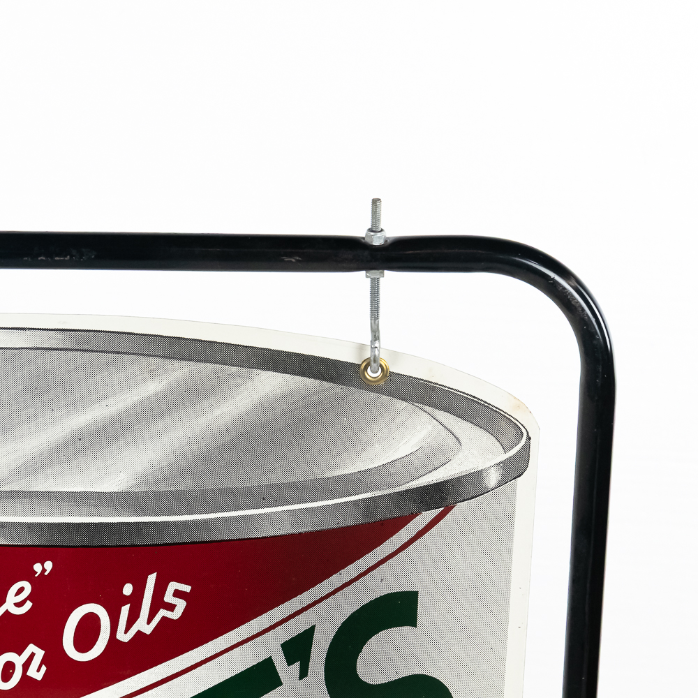 This is the more difficult to find double-sided metal sign. The original box, insert, even the small cloth bag that the hardware came in, is included. The items are N.O.S. but there is a small quarter size spot missing paint on one side and some surface rust on metal bracket (from sitting many years in service garage). Otherwise in very good condition. Colors are sharp and bright.
