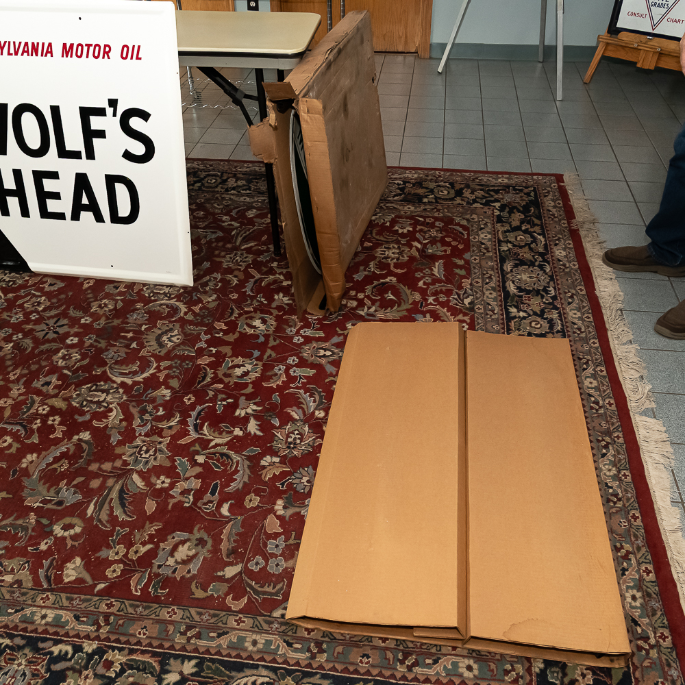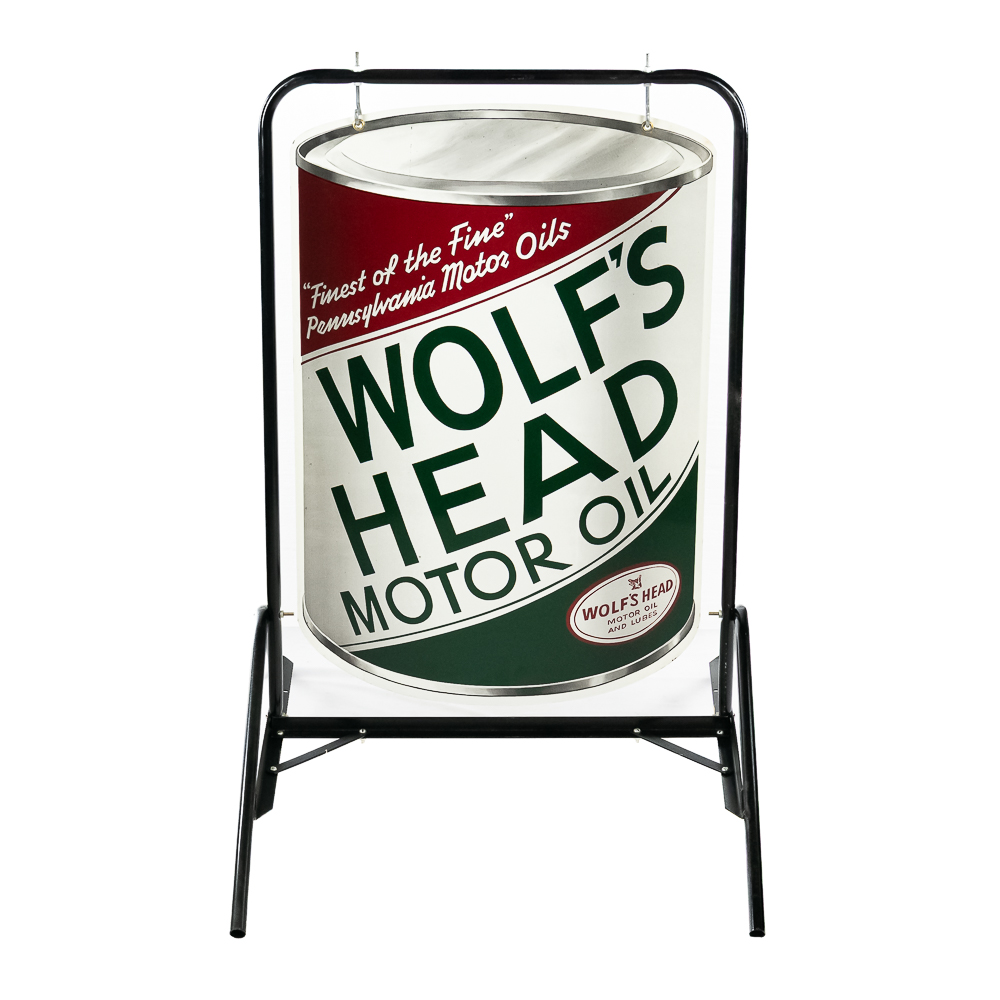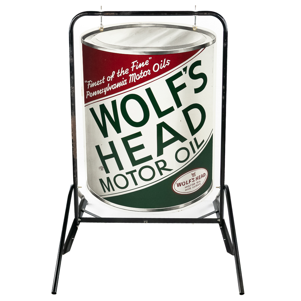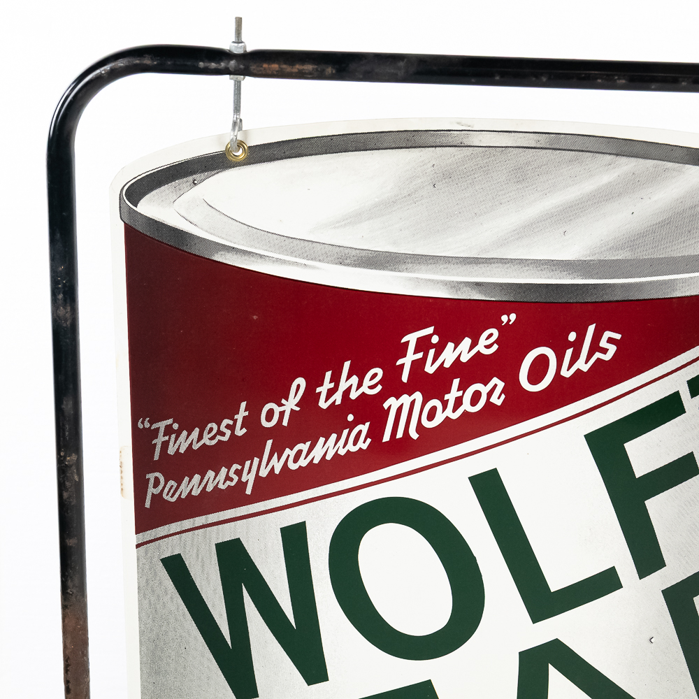 This is the more difficult to find double-sided metal sign. The original box, insert, even the small cloth bag that the hardware came in, is included. The items are N.O.S. but there is a small quarter size spot missing paint on one side and some surface rust on metal bracket (from sitting many years in service garage). Otherwise in very good condition. Colors are sharp and bright.