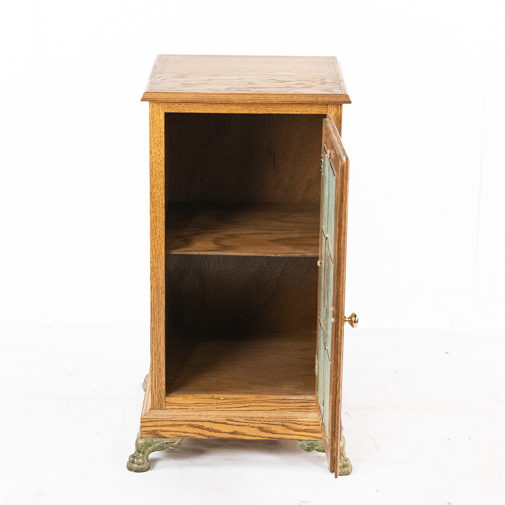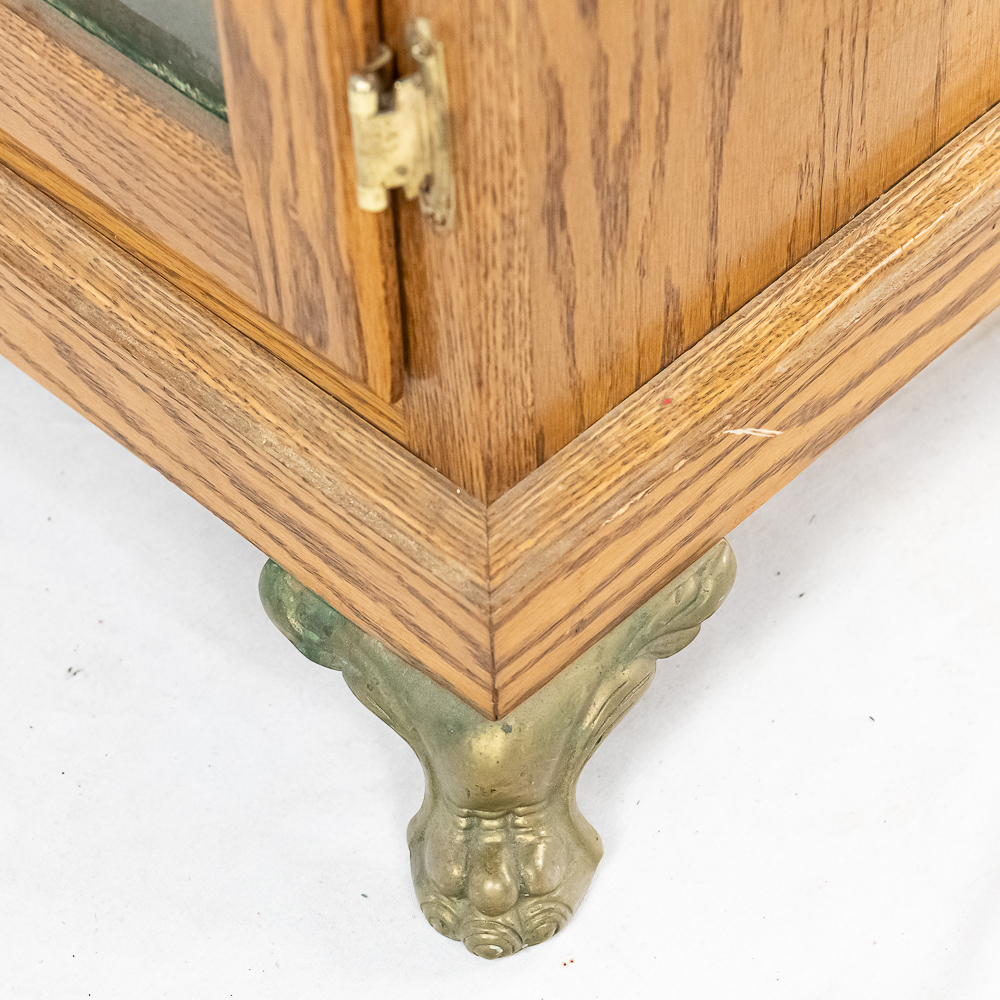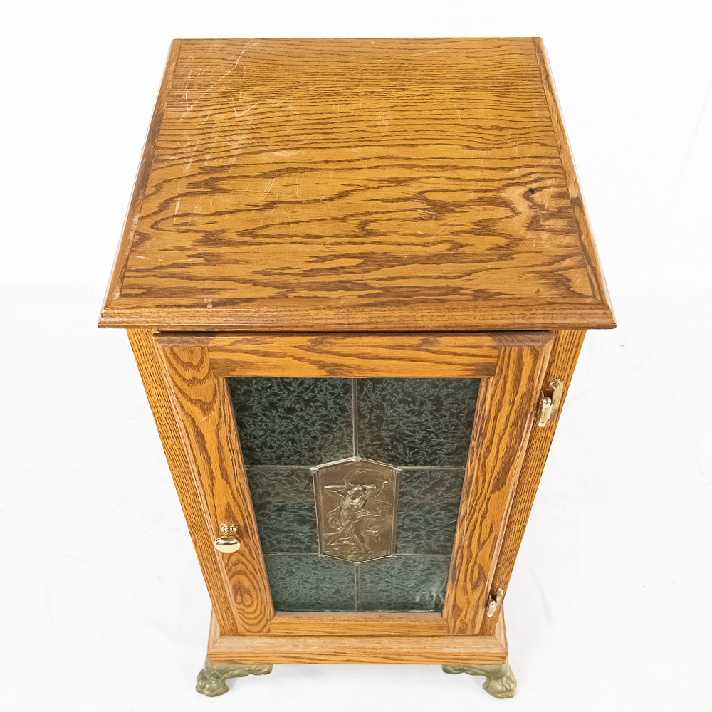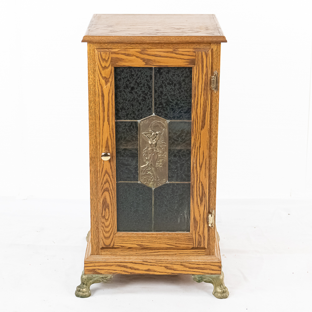 Has a lovely front leaded glass door with brass fairy center insert. One inside shelf and 4 brass claw feet. Inside electric light with switch mounted on back. Overall good condition with just a few light scuffs on top. 34″H X 19″w X 19″D