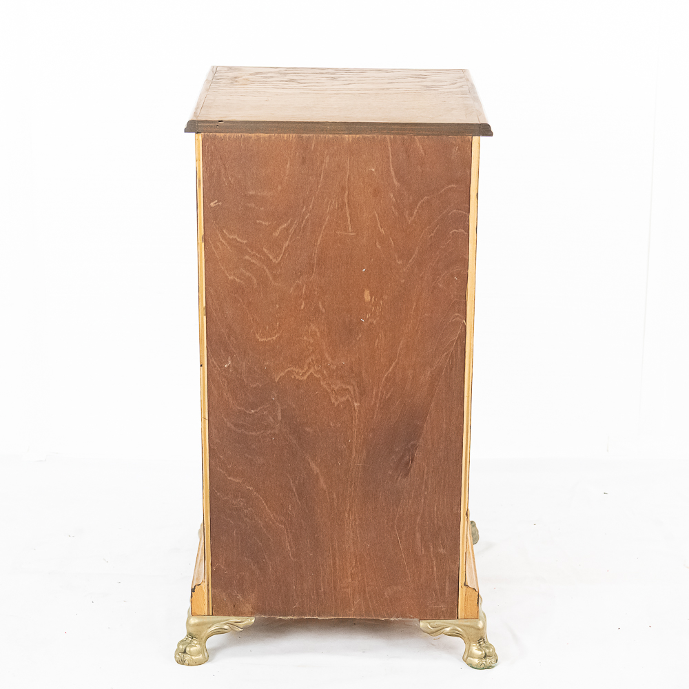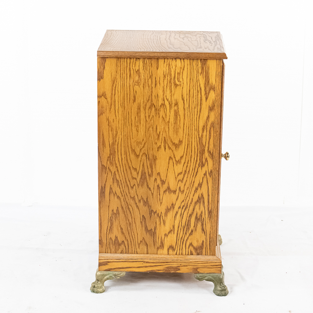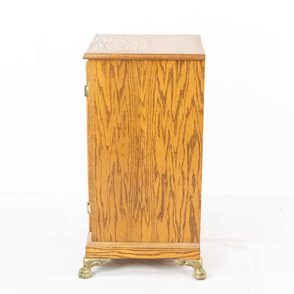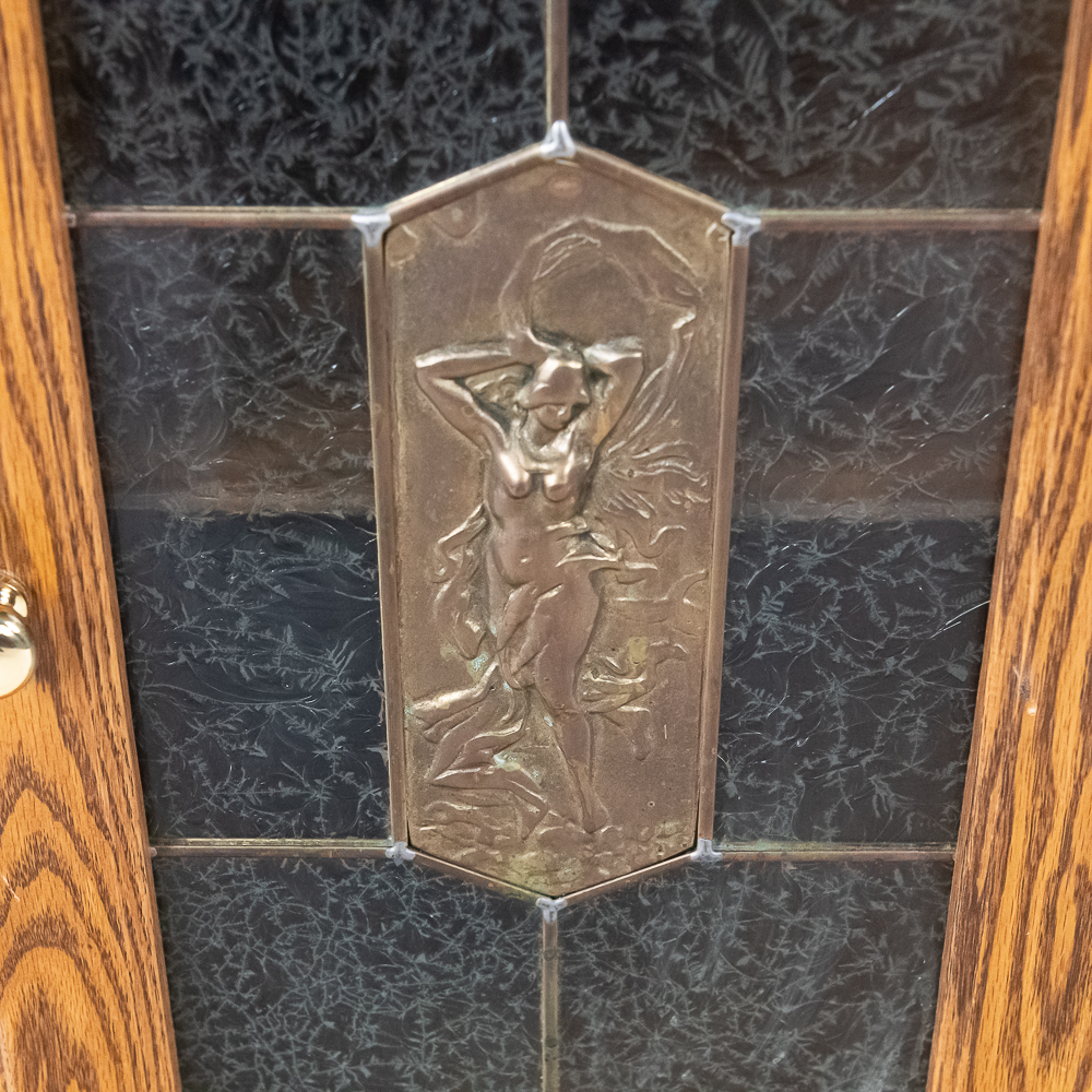 Has a lovely front leaded glass door with brass fairy center insert. One inside shelf and 4 brass claw feet. Inside electric light with switch mounted on back. Overall good condition with just a few light scuffs on top. 34″H X 19″w X 19″D