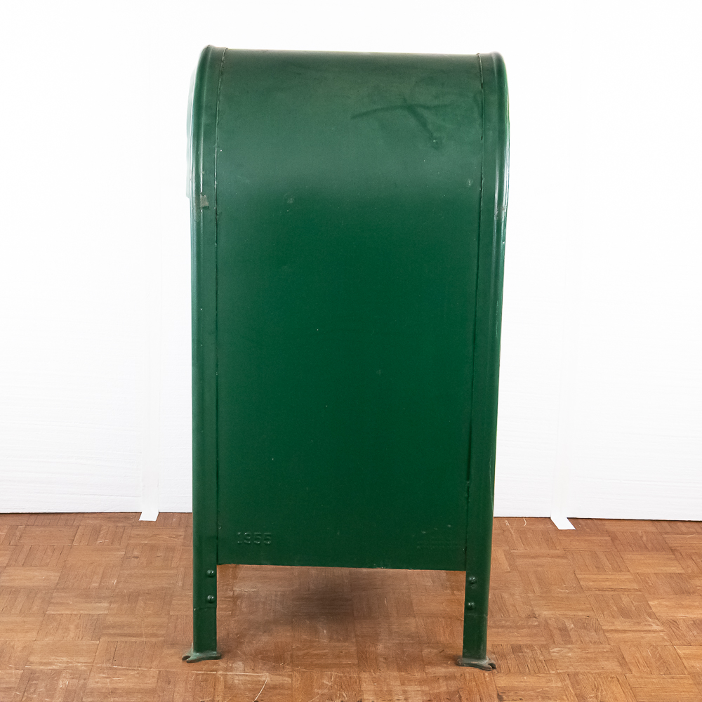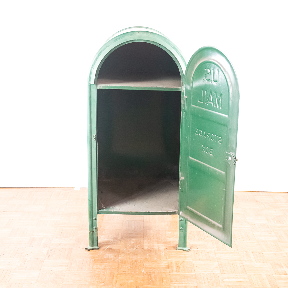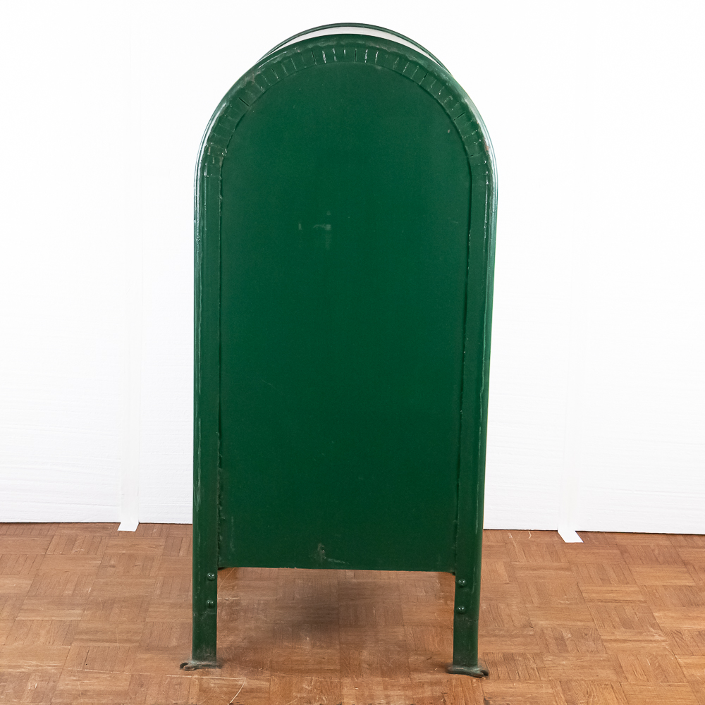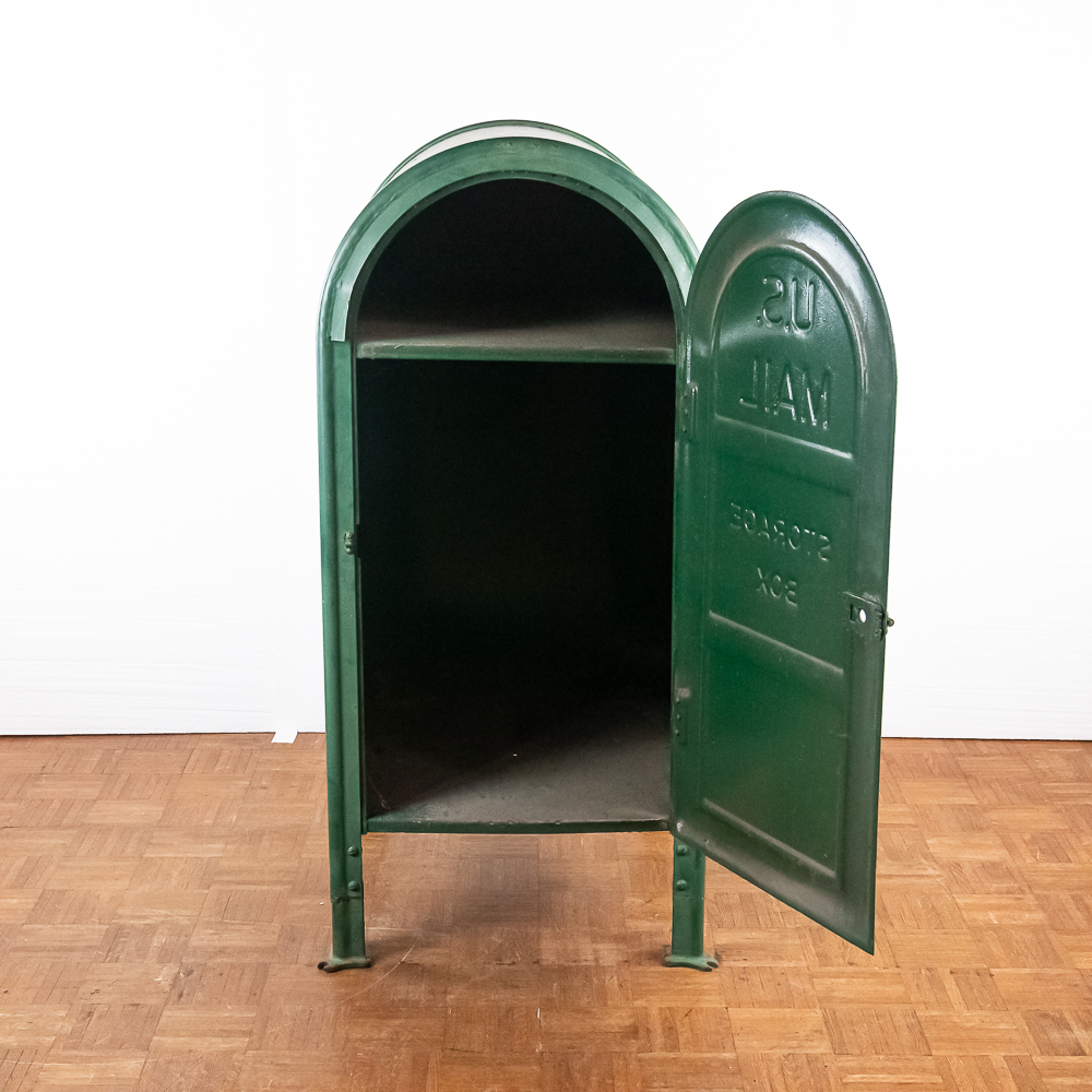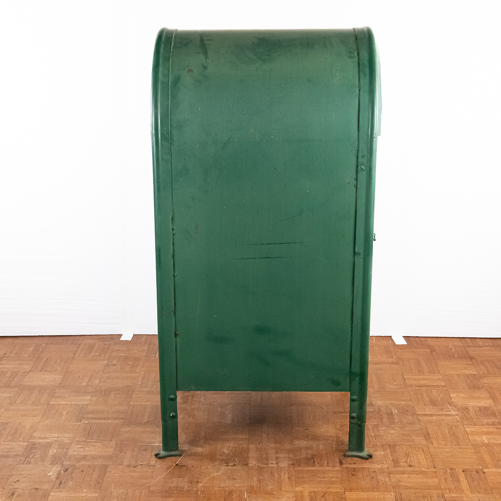 Heavy stamped steel route storage box with round top and “U.S. Mail Storage Box” embossed on the door. In original dark green paint, lock on door missing and has been replaced with a barrel bolt. These storage boxes were used in the city along a mail carriers route to replenish his mail bag as he proceeded along his route. In good+ condition. Measures 54″ tall, 25″ wide, 27″ deep.