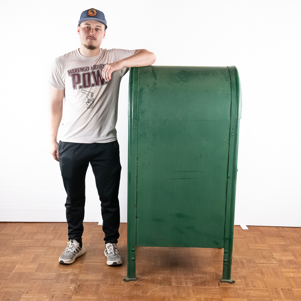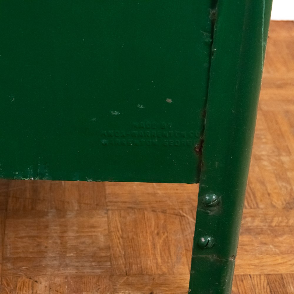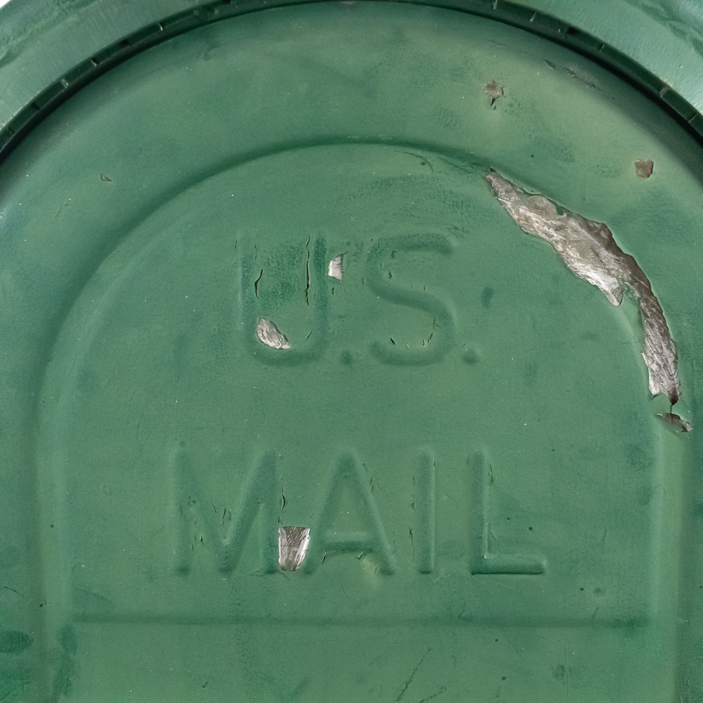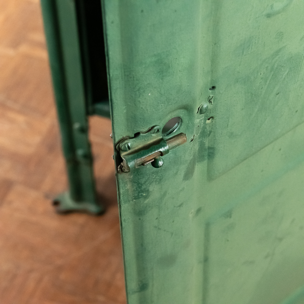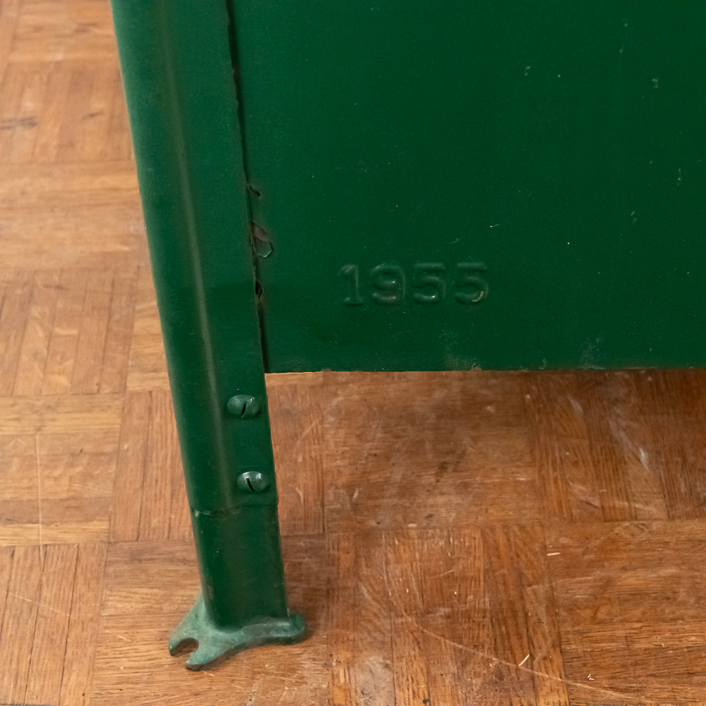 Heavy stamped steel route storage box with round top and “U.S. Mail Storage Box” embossed on the door. In original dark green paint, lock on door missing and has been replaced with a barrel bolt. These storage boxes were used in the city along a mail carriers route to replenish his mail bag as he proceeded along his route. In good+ condition. Measures 54″ tall, 25″ wide, 27″ deep.