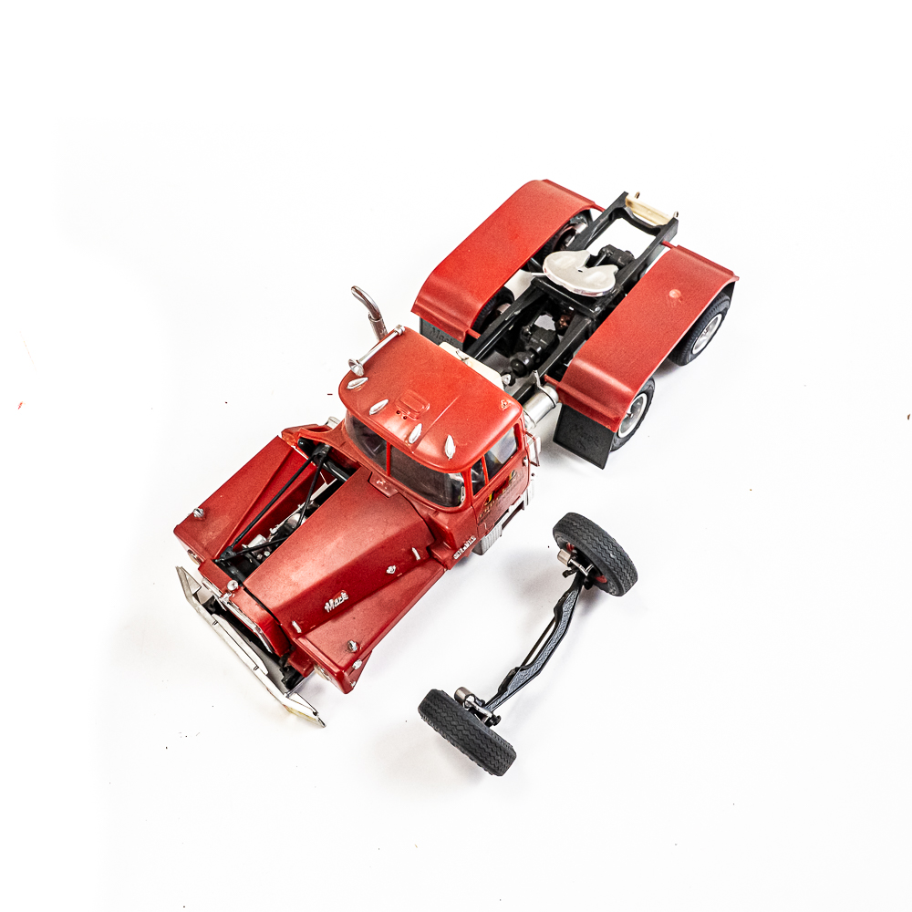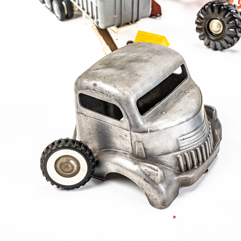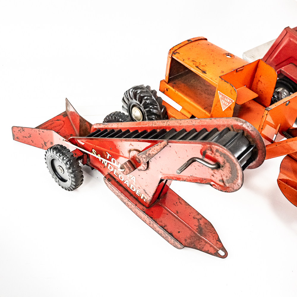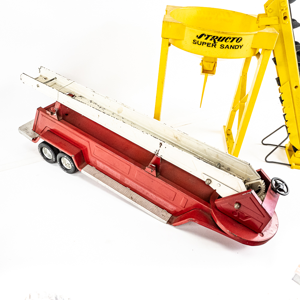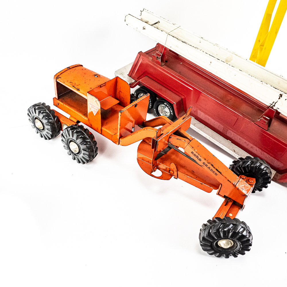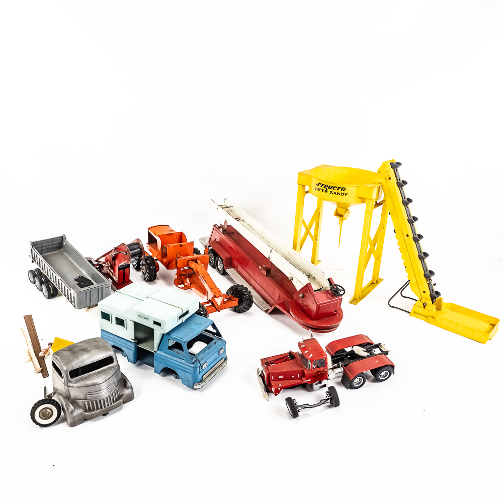 Eclectic collection includes Vintage Structo Super Sandy loading tower, J&L diecast truck & trailer, Nylint Road Grader missing pieces, 60s Tonka Sand loader, Nylint Ladder truck missing truck along with assorted pieces for parts. In good to fair overall condition with age and wear including discoloration/paint loss, scuffs and scratches, oxidation; some accessory pieces missing. Perfect addition to your collection, please use photos to judge condition and bid accordingly.
