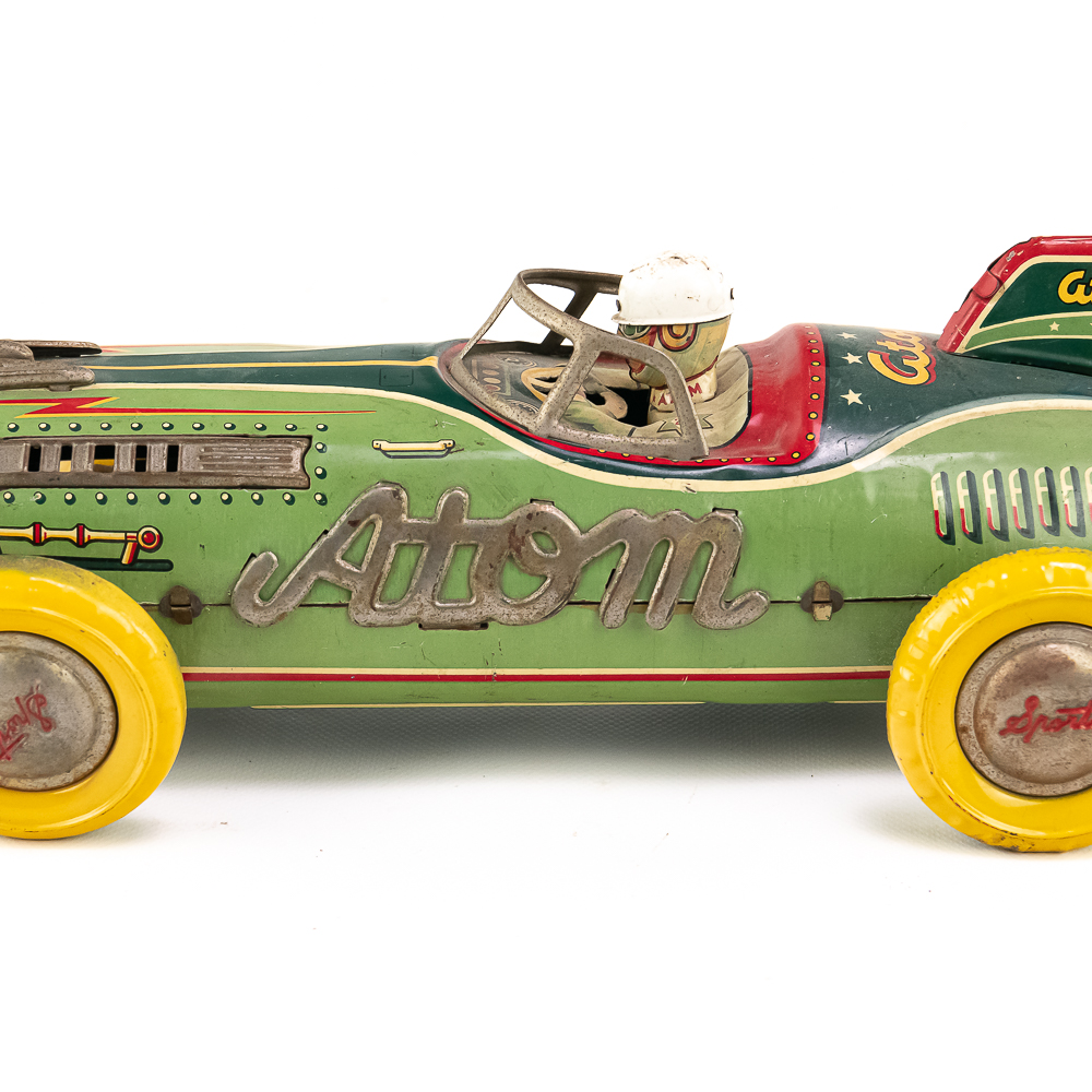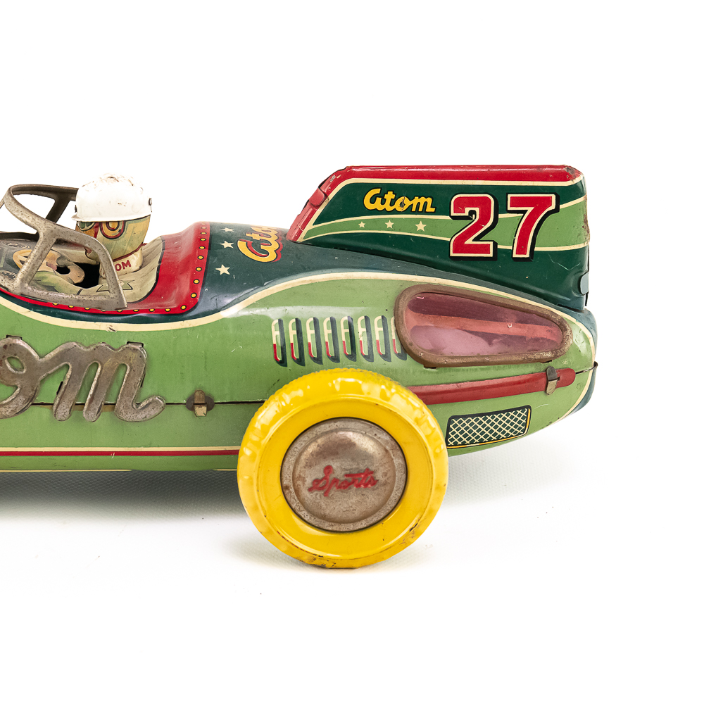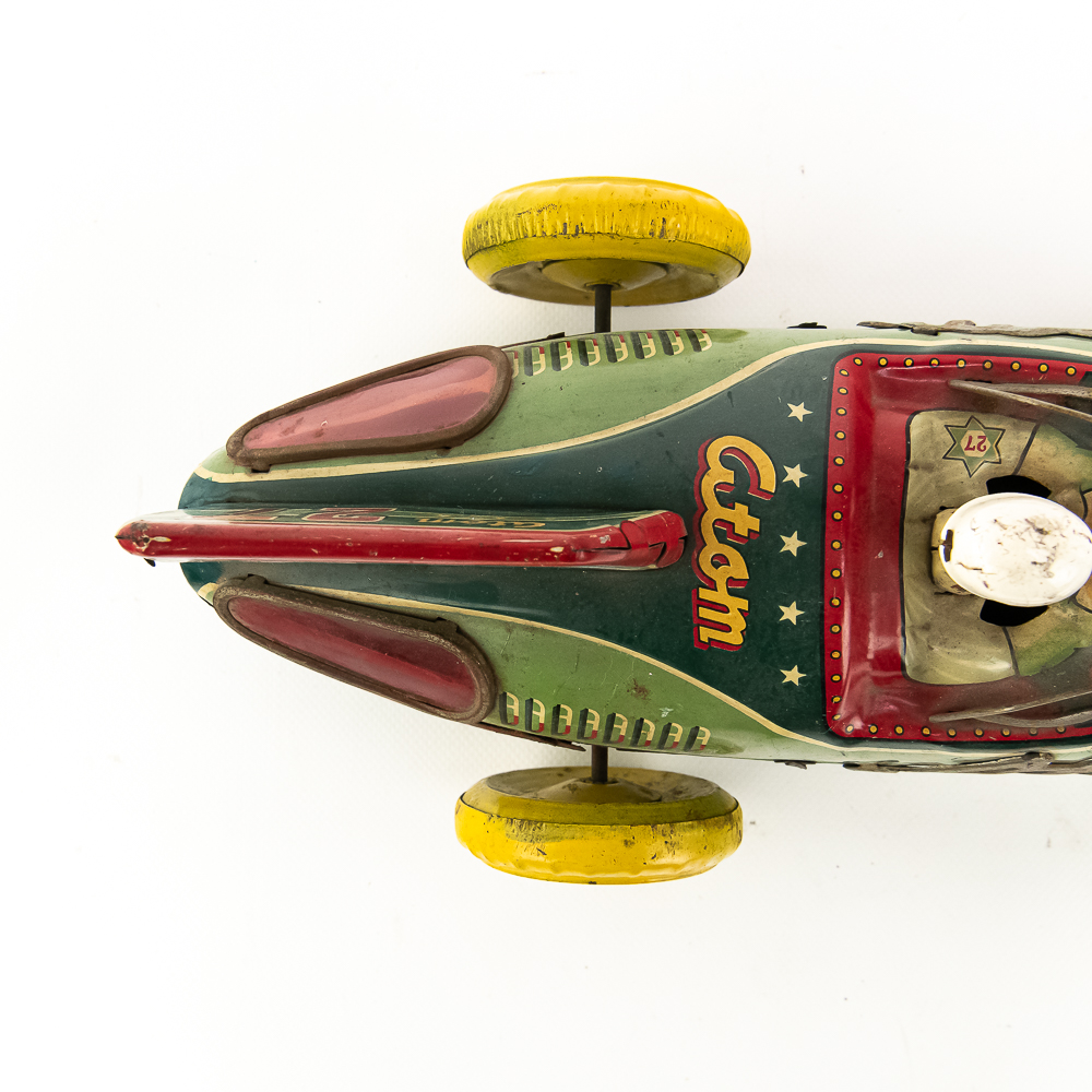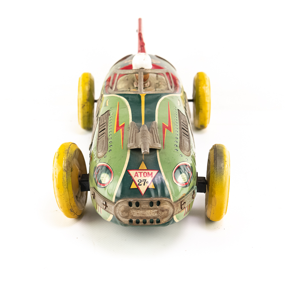Hard to find and highly desirable Yonezawa ATOM 27 Japanese tin litho friction racer. Approximately 16″ and in good overall condition featuring a futuristic eye catching color combination and design. Appears to be original with driver w helmet, chrome accents and no rubber on the tires. Some cosmetic imperfections noted are associated with age and wear include minor scratches, oxidation and discoloration. Front wheels roll with w slight wobble, friction is not engaged and does not work along with light oxidation on chrome accents and bottom edge. Perfect addiiton to your collection, please use photos to judge condition and bid accordingly.