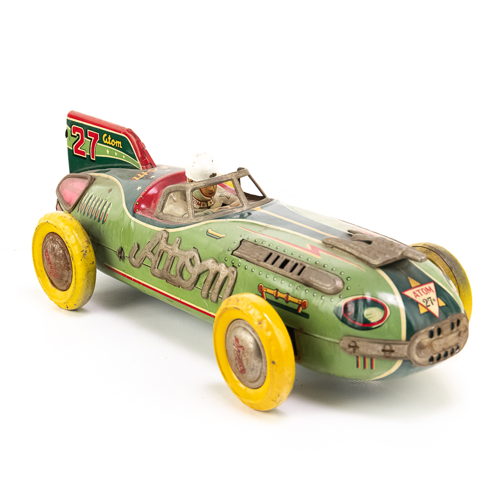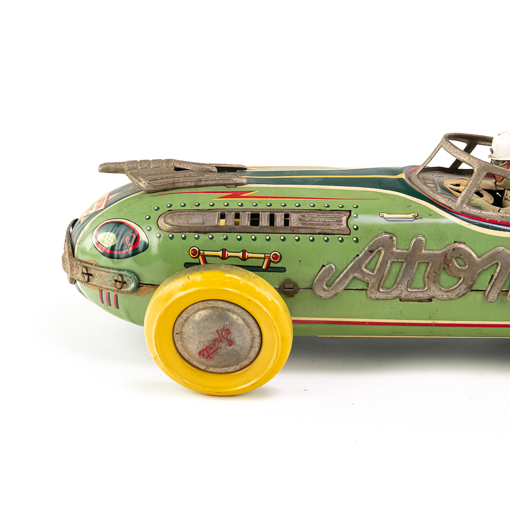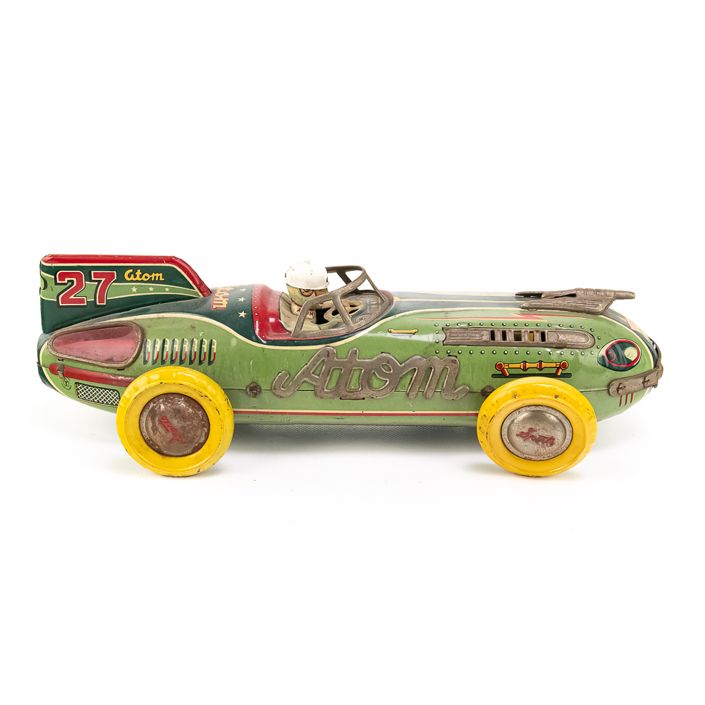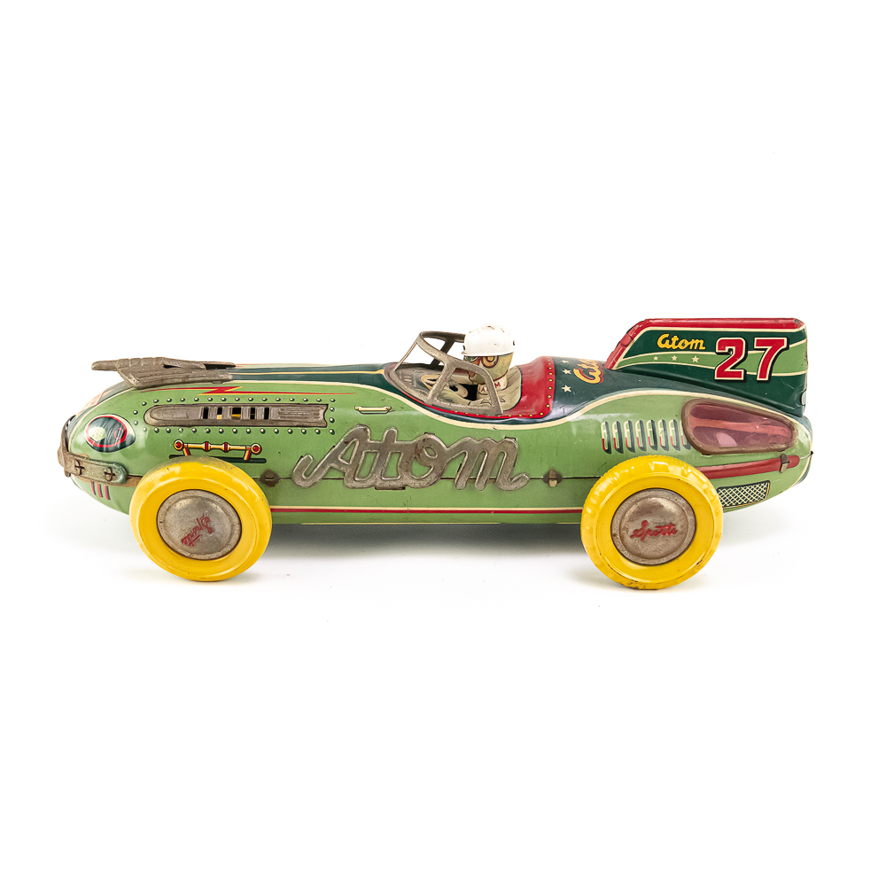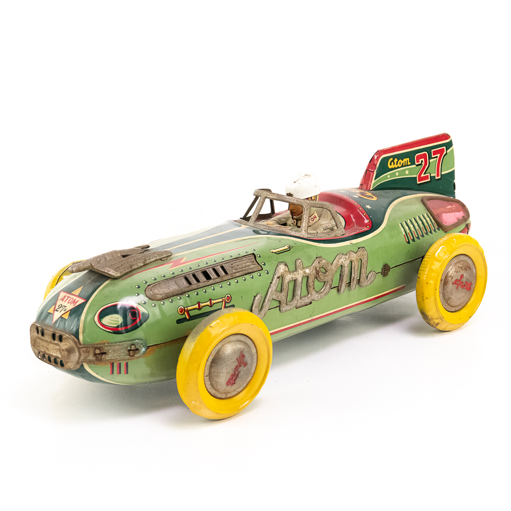 Hard to find and highly desirable Yonezawa ATOM 27 Japanese tin litho friction racer. Approximately 16″ and in good overall condition featuring a futuristic eye catching color combination and design. Appears to be original with driver w helmet, chrome accents and no rubber on the tires. Some cosmetic imperfections noted are associated with age and wear include minor scratches, oxidation and discoloration. Front wheels roll with w slight wobble, friction is not engaged and does not work along with light oxidation on chrome accents and bottom edge. Perfect addiiton to your collection, please use photos to judge condition and bid accordingly.