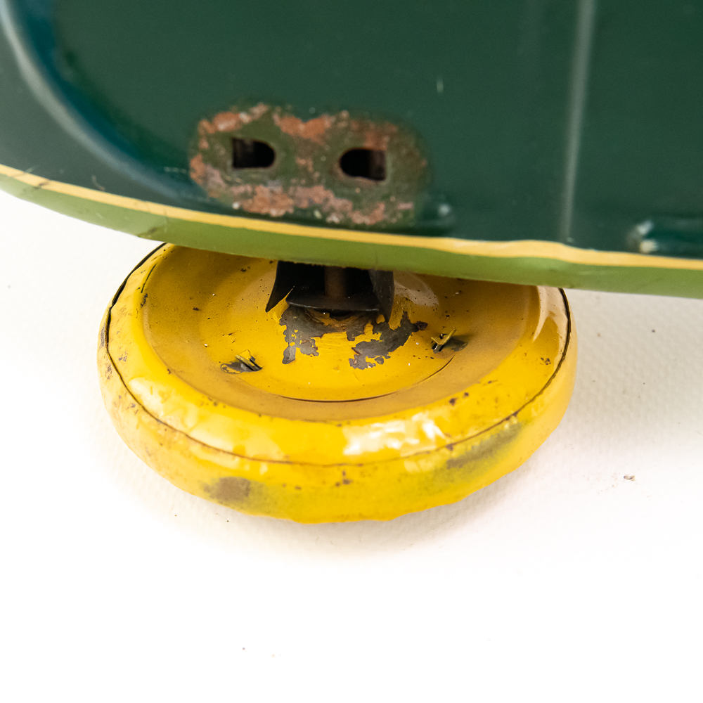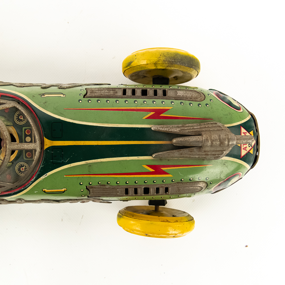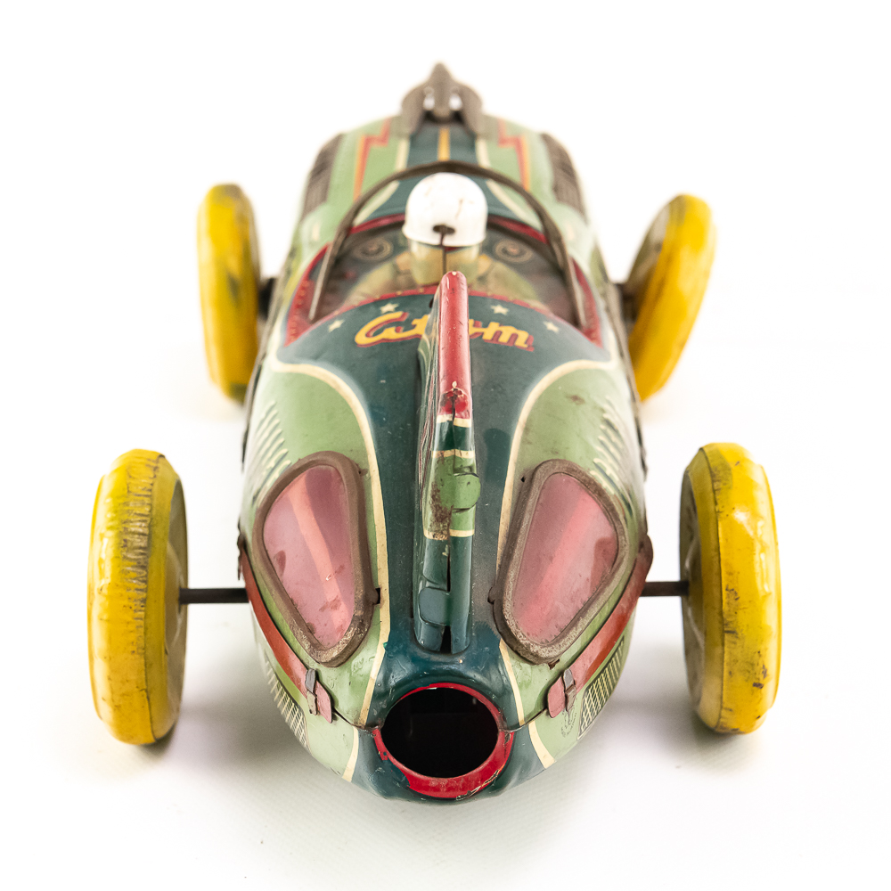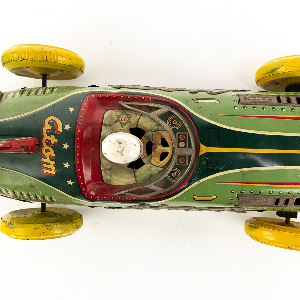 Hard to find and highly desirable Yonezawa ATOM 27 Japanese tin litho friction racer. Approximately 16″ and in good overall condition featuring a futuristic eye catching color combination and design. Appears to be original with driver w helmet, chrome accents and no rubber on the tires. Some cosmetic imperfections noted are associated with age and wear include minor scratches, oxidation and discoloration. Front wheels roll with w slight wobble, friction is not engaged and does not work along with light oxidation on chrome accents and bottom edge. Perfect addiiton to your collection, please use photos to judge condition and bid accordingly.