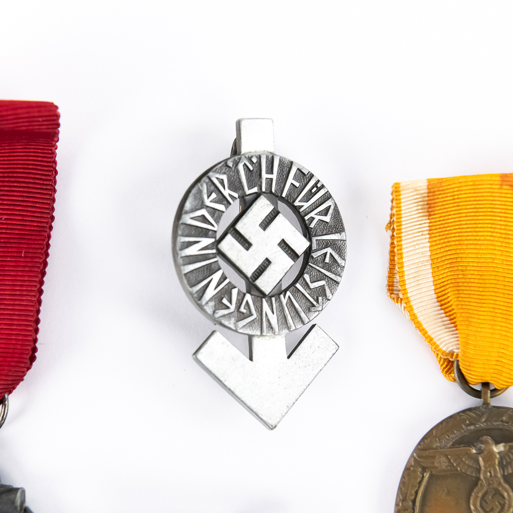 7) Hitler Youth Silver Proficiency Badge. Pinback and RZM M1/34 marked with serial number 246915. Dimensions: 2”x1.25”
