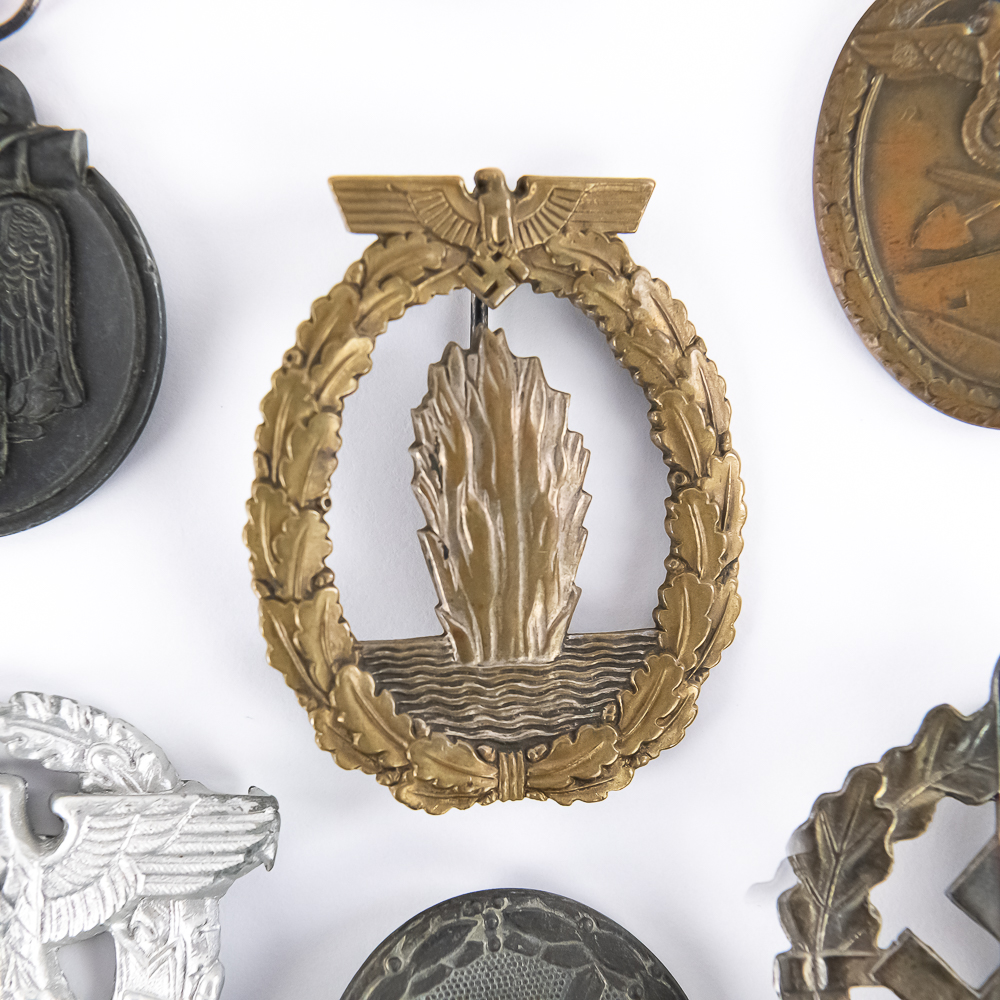 4) German Tombak Kriegsmarine Minesweeper Badge. Type 1 (7-wave pattern). Unmarked. Vertical pinback, C-catch. Nice looking piece despite loss of finish in areas. Dimensions: 2.25”x1.75”