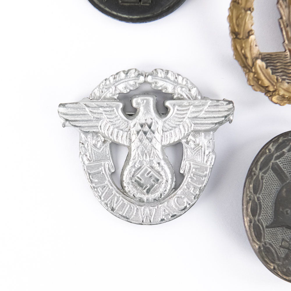 6) Police “Landwacht” Metal Cap & Breast Insignia. Stamped aluminum construction. Horizontal pinback. Nice original finish.