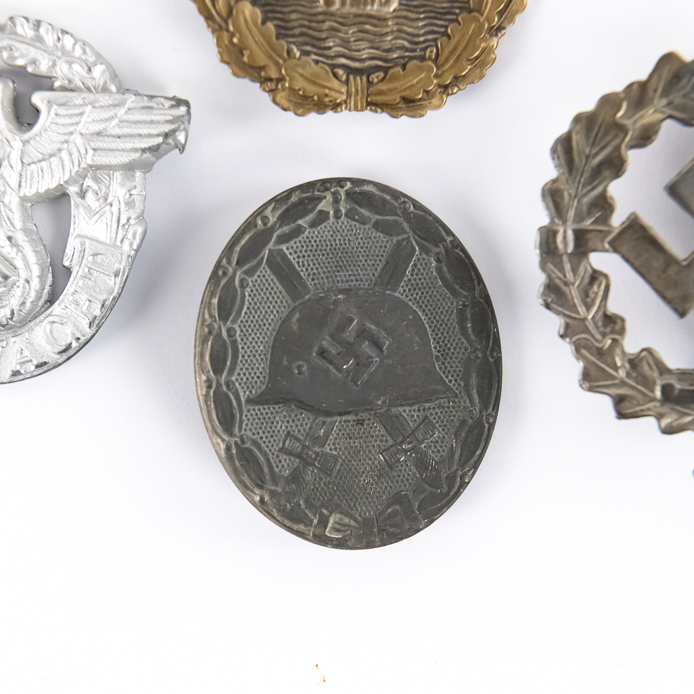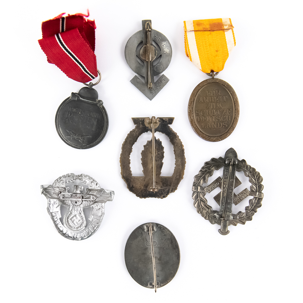 1) Silver German Wound Badge. Solid cast. Marked “107” on back. Traces of original finish evident on lower aspects of relief. Vertical pinback. Dimensions: 1.75”x1.5”.