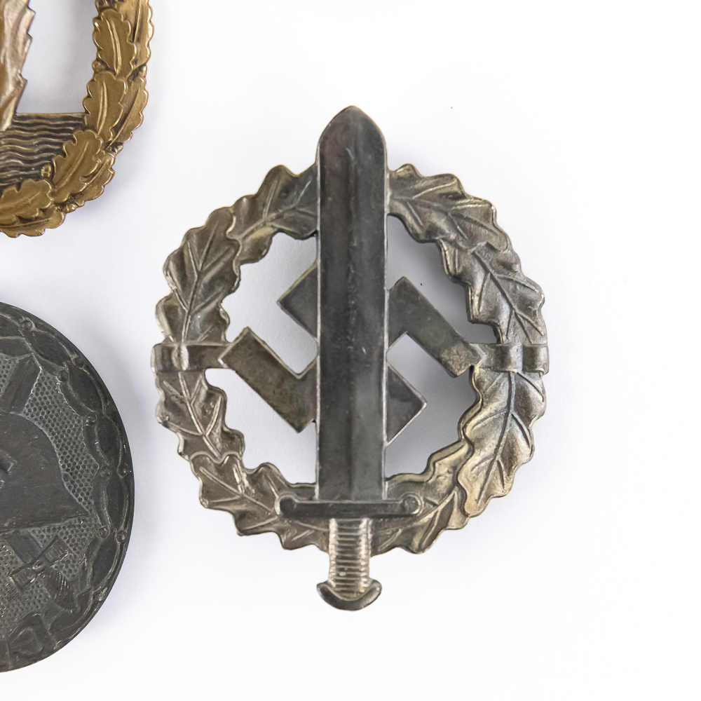 5) German Silver SA Sportsbadge. Stamped construction. Marked on back “W REDO, GENTUM D OBERSTEN, S.A. FUHPUNG, SAAR=AUTERN” Dimensions: 1.75”x2.25” Vertical pinback, C-catch.
