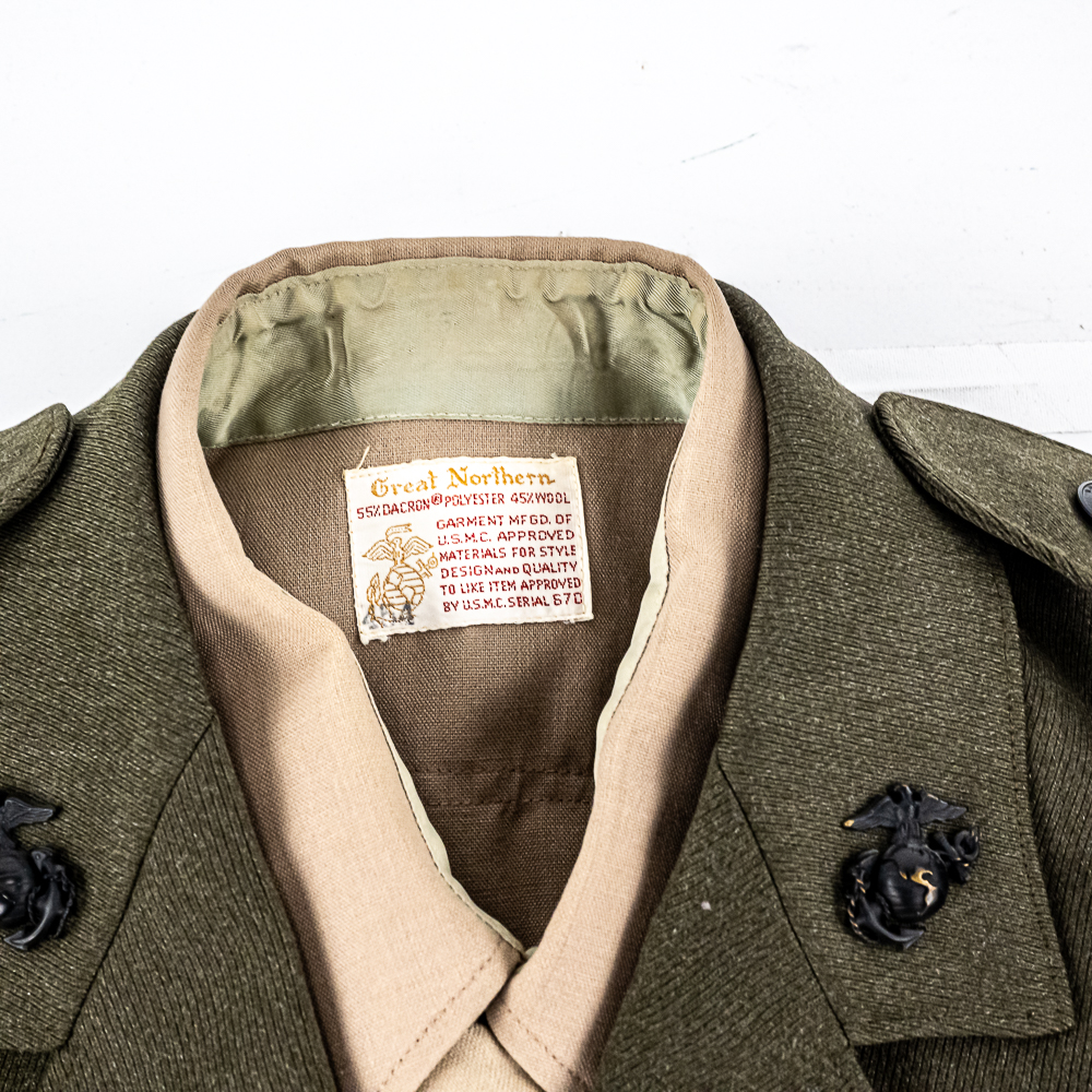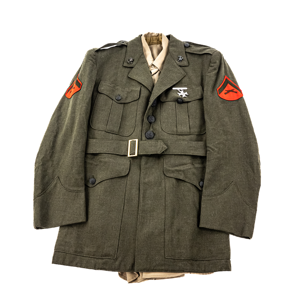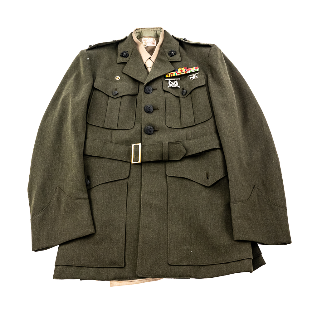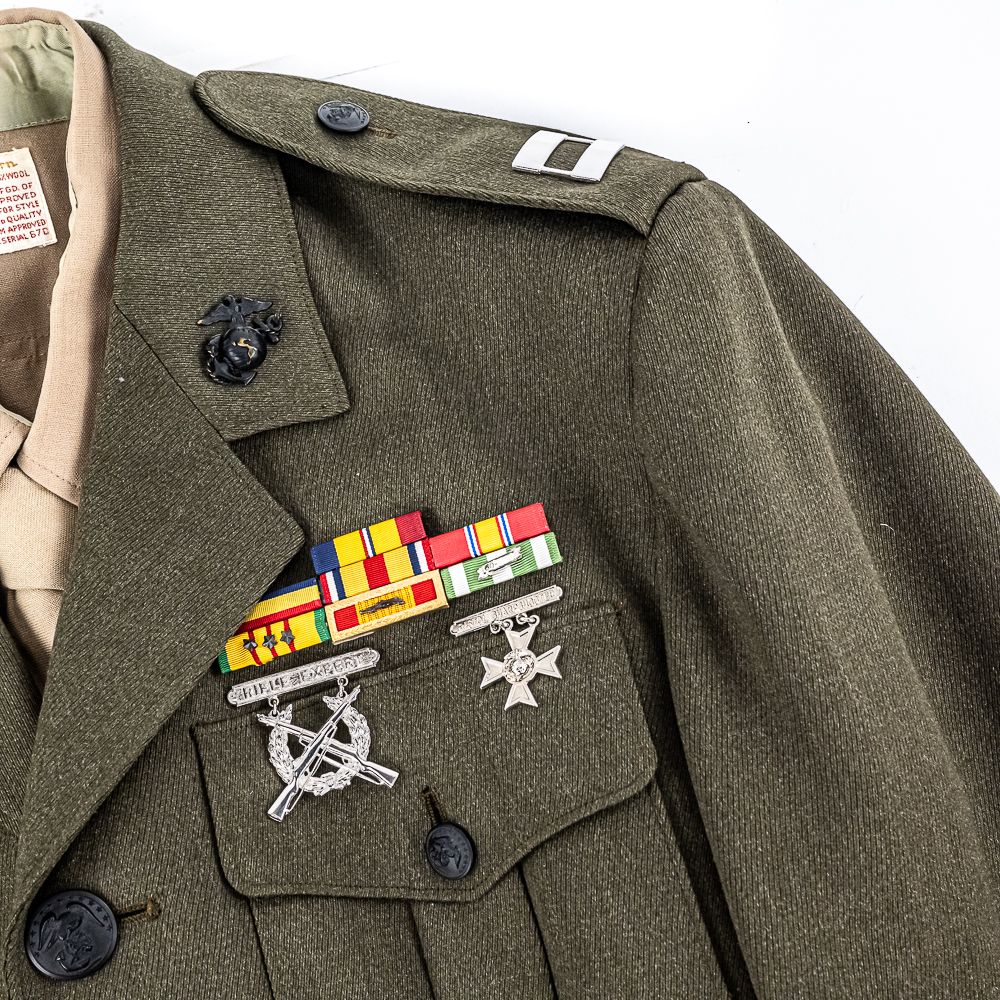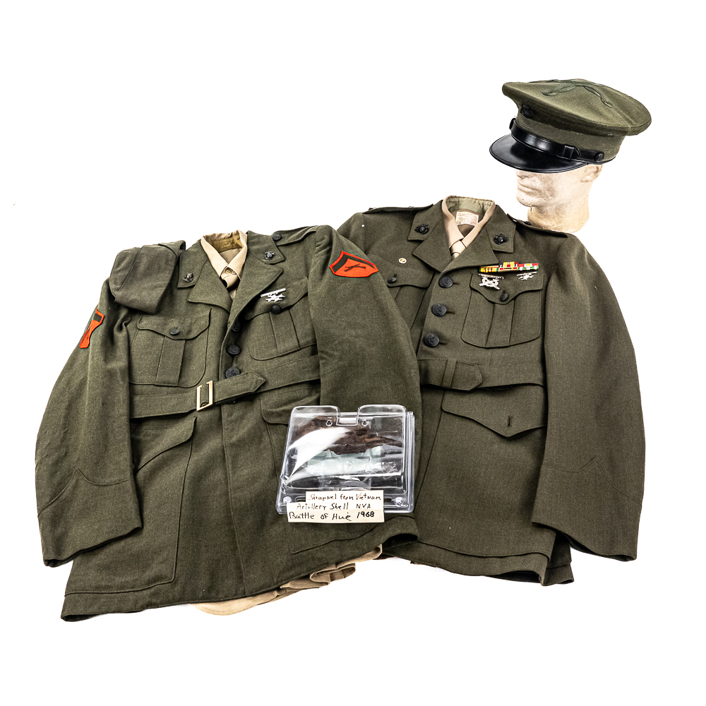 Pair of USMC Service Alpha Uniforms. 1) Uniform attributed by consigner to Carl Ritzel. Includes: Coat, wool, serge, green. with belt. Captain’s bars on shoulders, globe and anchor screwback insignia on collar. Ribbon bars for: Combat Action; Presidential Unit Citation; Selected Marine Corps Reserve Medal; National Defense Service Medal; Vietnam Service Medal w/3 campaign stars; Republic of Vietnam Gallantry Cross Unit Citation; ROV Campaign Medal. Badges for Rifle Expert and Pistol Sharpshooter on chest. USMC Honorable Discharge button on chest. Tailor-Exchange Uniform Shop, MCB Quantico, VA. Cap, visor, made by Berkshire Caps. Name tag “RITZEL”. Globe and anchor insignia. Shirt, Great Northern. 55/45/ Poly/Wool. Necktie, “Smoothie button down tie”