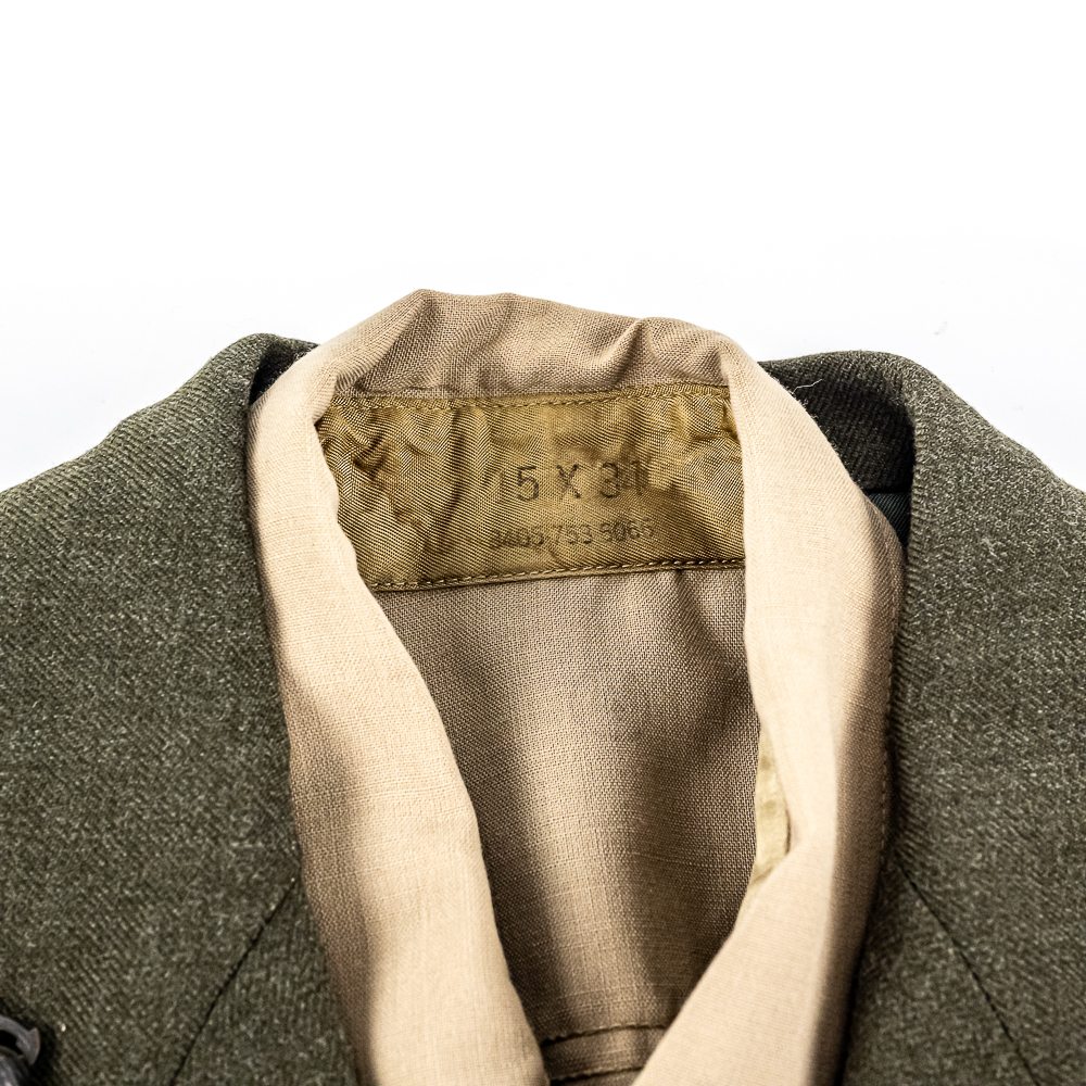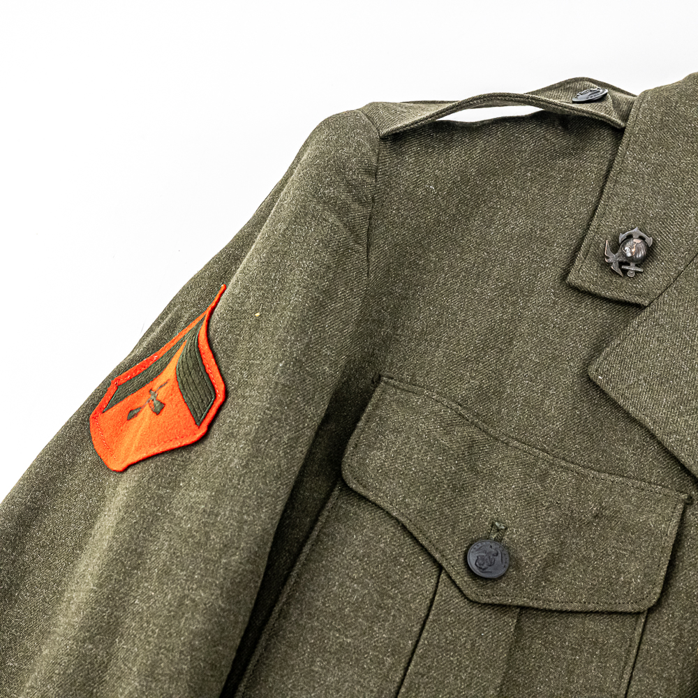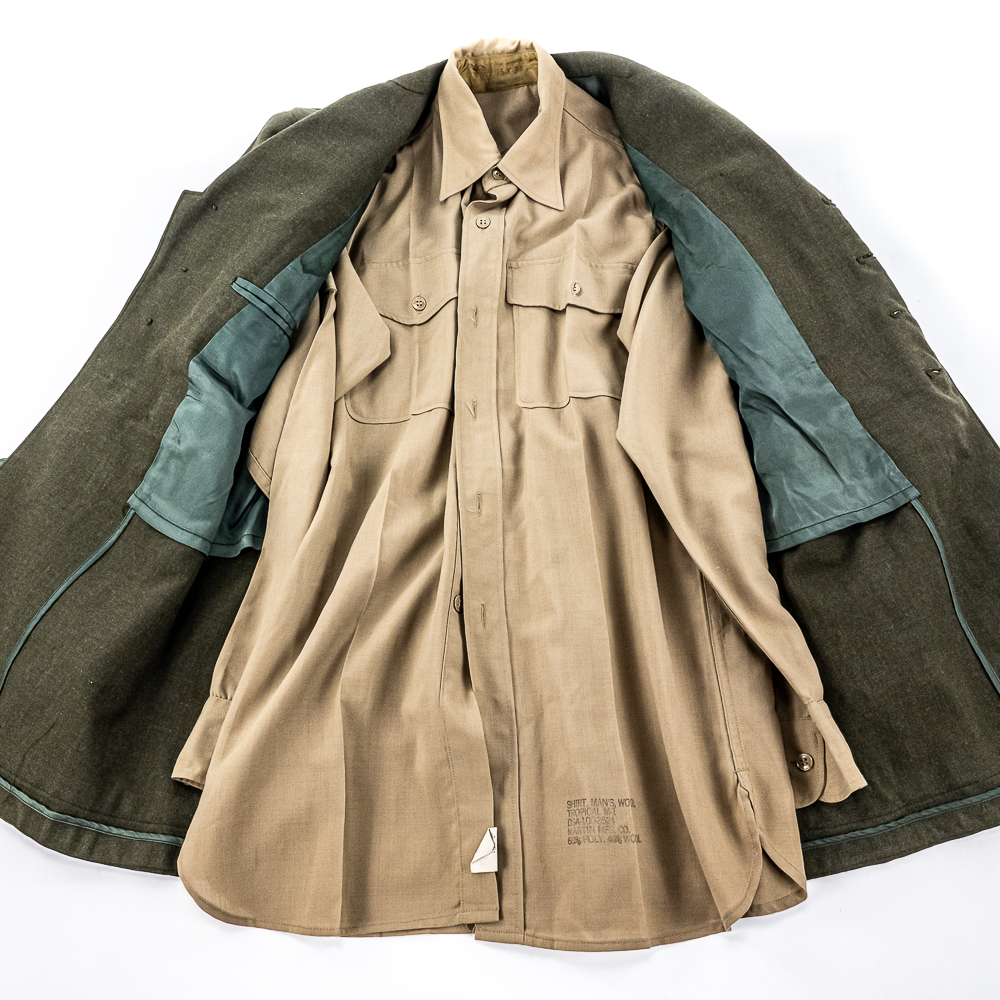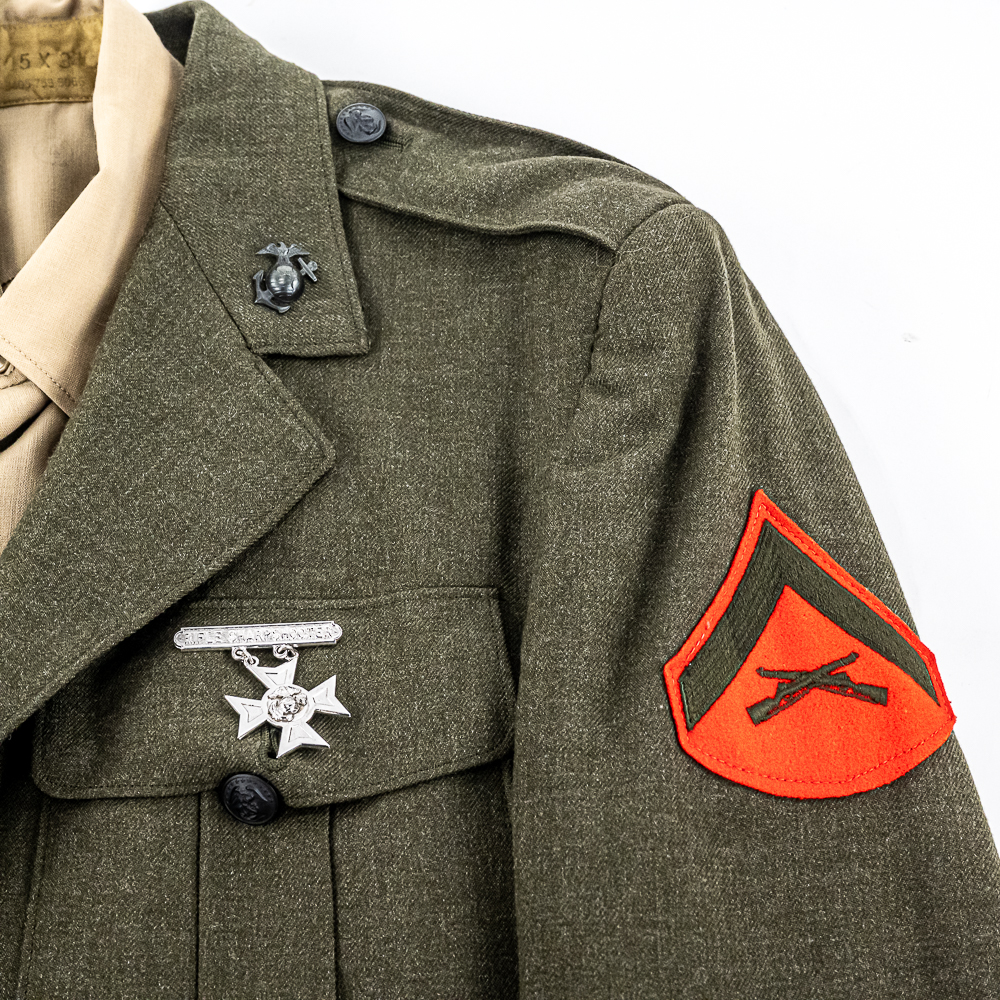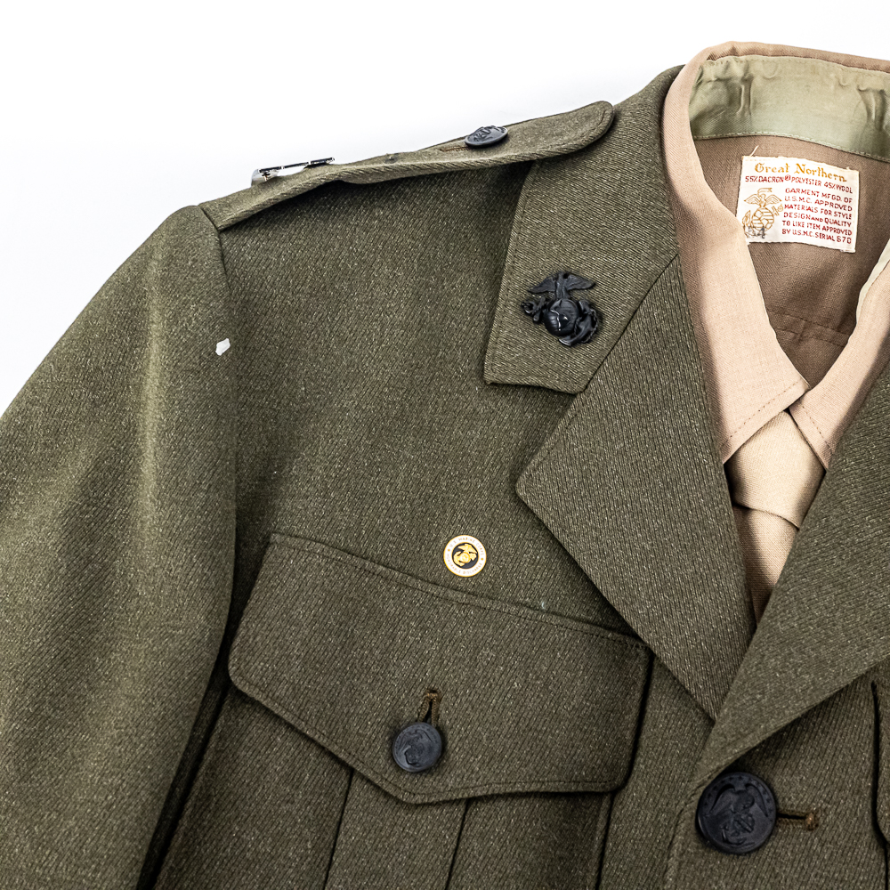 Pair of USMC Service Alpha Uniforms. 1) Uniform attributed by consigner to Carl Ritzel. Includes: Coat, wool, serge, green. with belt. Captain’s bars on shoulders, globe and anchor screwback insignia on collar. Ribbon bars for: Combat Action; Presidential Unit Citation; Selected Marine Corps Reserve Medal; National Defense Service Medal; Vietnam Service Medal w/3 campaign stars; Republic of Vietnam Gallantry Cross Unit Citation; ROV Campaign Medal. Badges for Rifle Expert and Pistol Sharpshooter on chest. USMC Honorable Discharge button on chest. Tailor-Exchange Uniform Shop, MCB Quantico, VA. Cap, visor, made by Berkshire Caps. Name tag “RITZEL”. Globe and anchor insignia. Shirt, Great Northern. 55/45/ Poly/Wool. Necktie, “Smoothie button down tie”