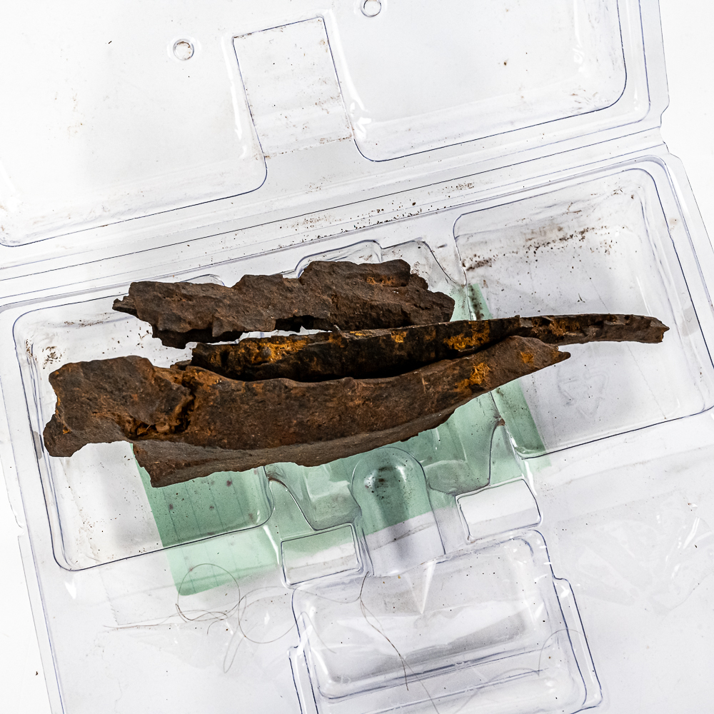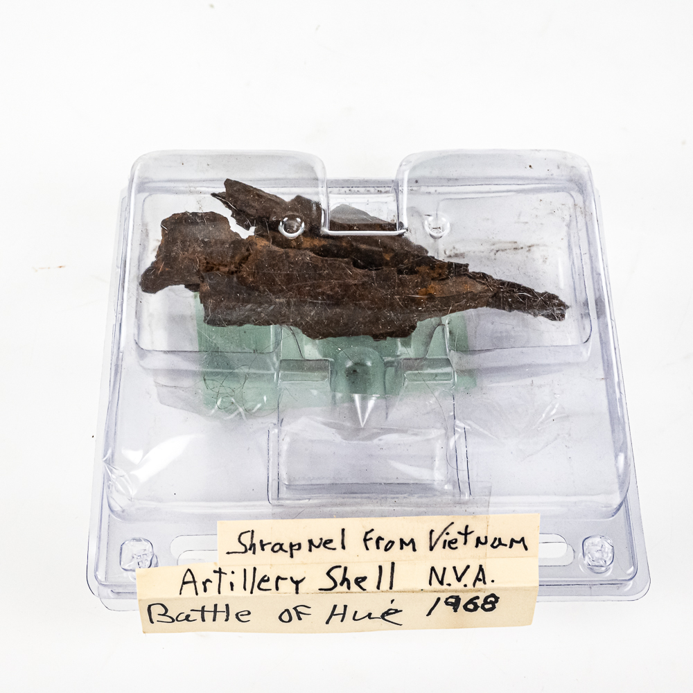 Four shrapnel fragments from NVA artillery shell, Battle of Hue, 1968. All measure between 3-1/2″ and 6″ in length. 2) Coat, wool, serge, green. with belt. Size: 39S. Made by South Jersey Clothing Co. Lance Corporal rank on each sleeve. On chest-badge, Rifle Sharpshooter. 1/20 Silver filled. “SER 397” Globe and anchors (screwback) on lapels. Cap, garrison, man’s poly wool green, size 6-1/2. Shirt, tan. Size 15×34. Lance Corporal rank sewn on each sleeve.