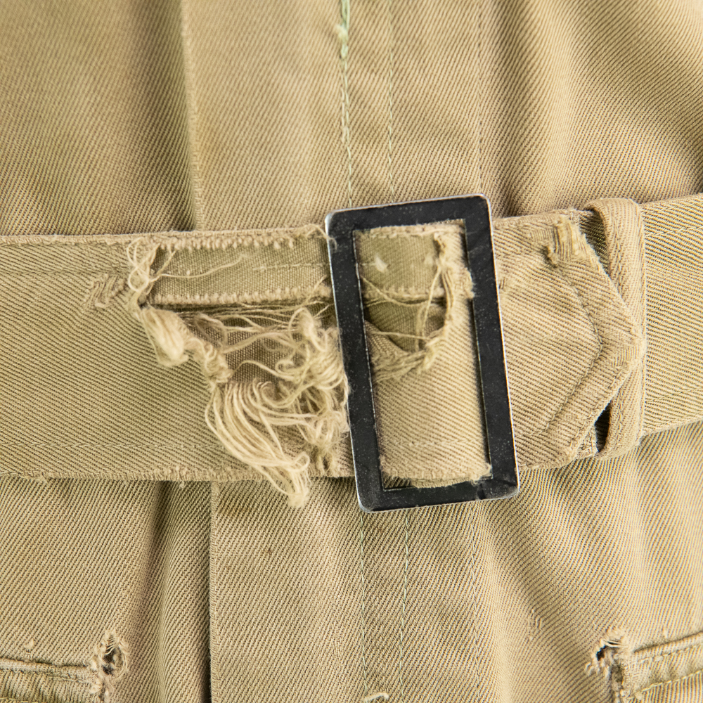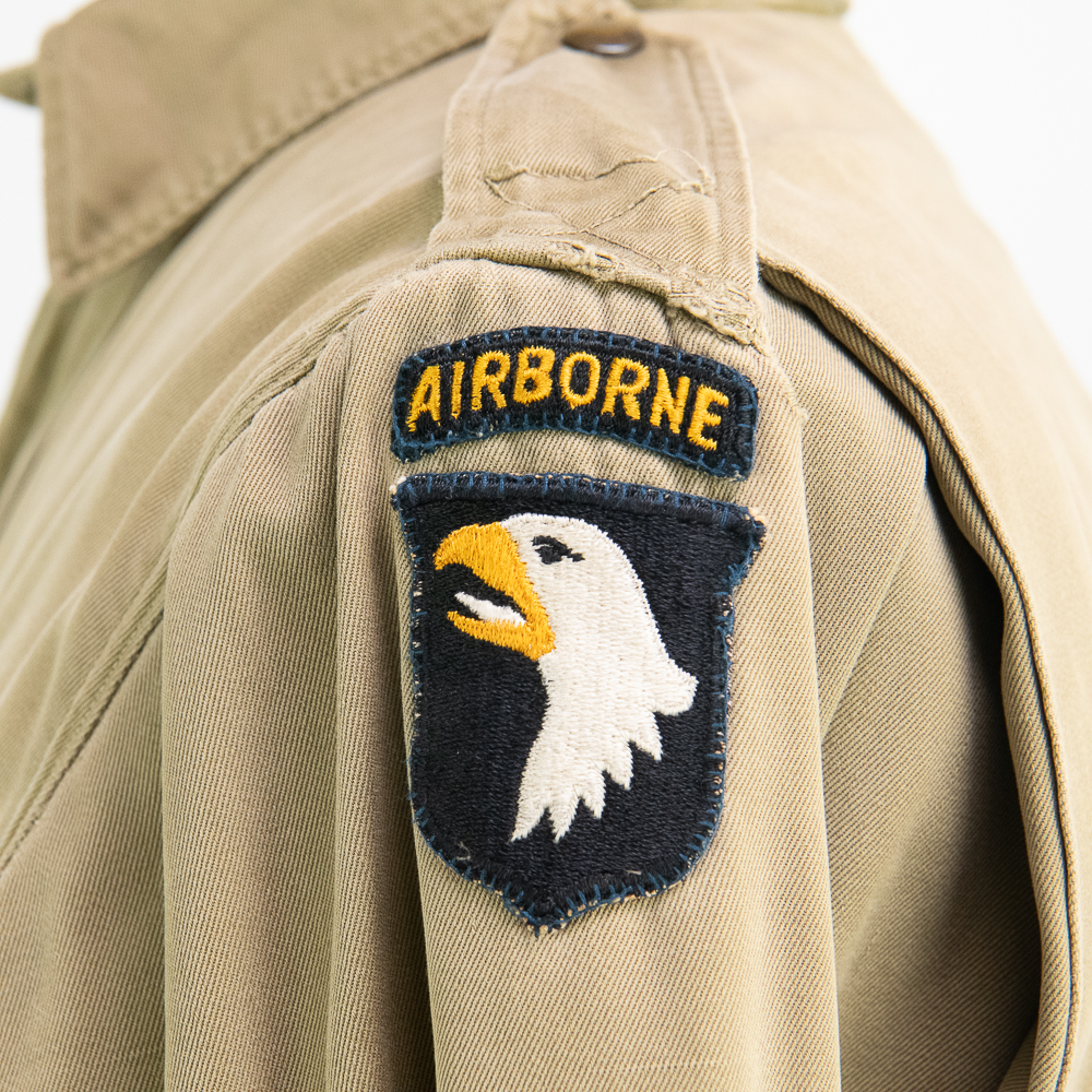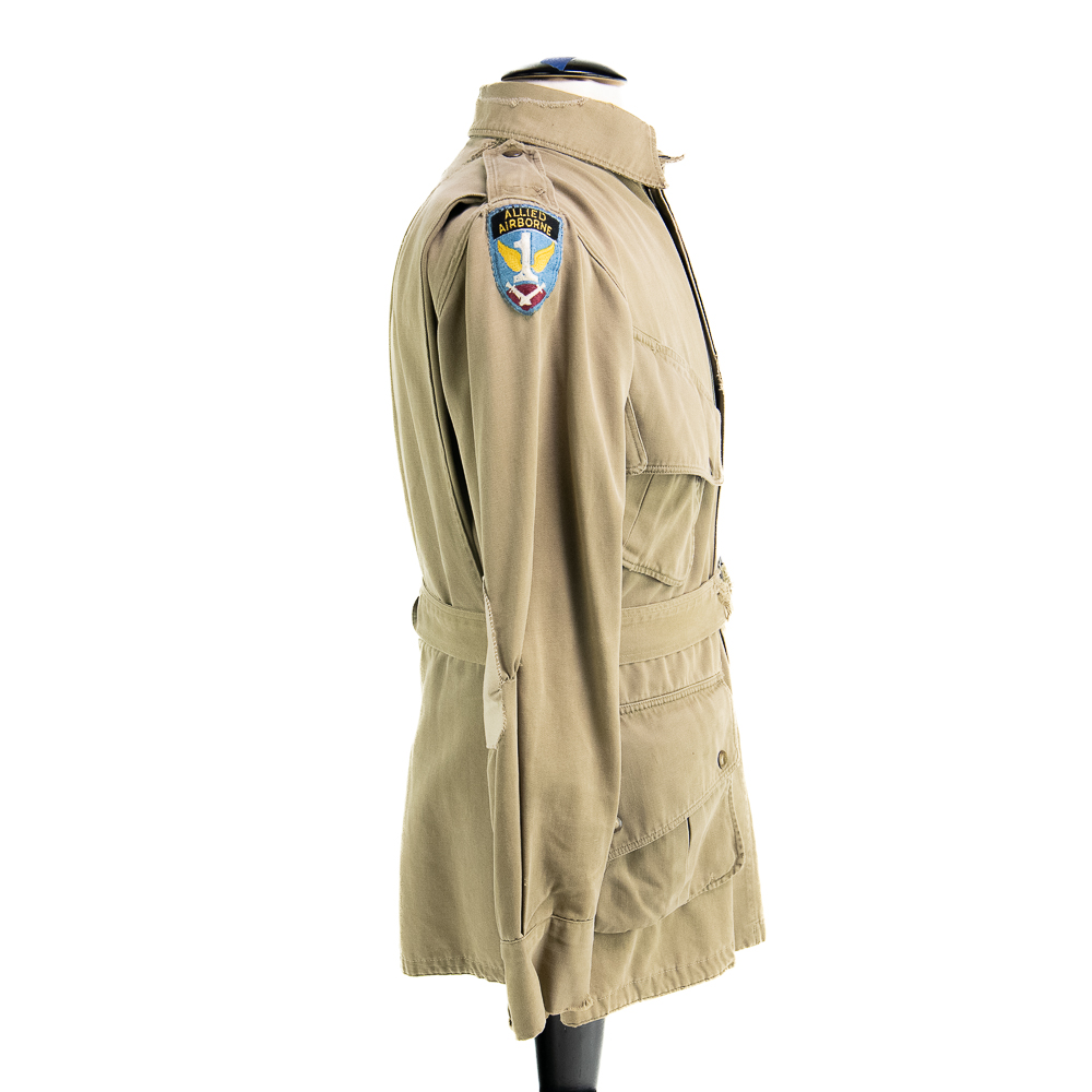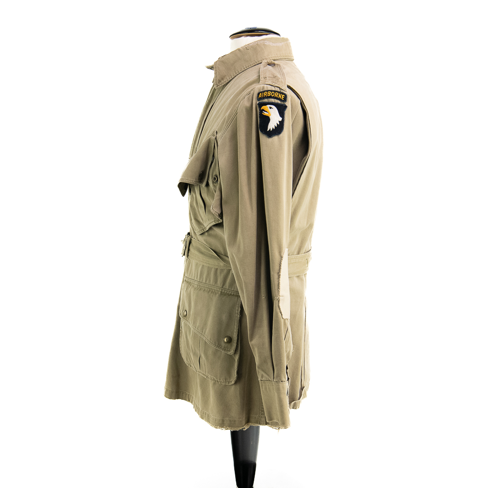 M42 Jump Jacket. 101st Airborne (white tongue variant, on left shoulder) and First Allied Airborne Army (right shoulder) patched. 101st patch and above tab chain stitched in blue thread. First Allied Airborne Army patch is whip stitched w/ white thread. No glow on any of the repairs on the jacket. When the UV light is put over the First Allied Airborne Army it has an uneven mottled glow on the numeral one. When the UV light is put over elbow patches as well as the 101st patch it seems to have a glow, and reflects the light more than expected. Unknown owner, but laundry mark stamp on back of inside collar is “ P 8624 ”. Jacket shows a lot of wear/usage. Significant wear around collar and fraying of edges at base of coat as well as on arms below elbows. Five-inch tear on the rear upper right shoulder than has been machine sewn. Elbows have large patches sewn over them. Not something reinforced for invasion, but more for elbow repair. Four front pockets, zip closure, waist belt. Belt has attaching strap securing it to the jacket (an early variation). The first 2-3 in of belt tip has frayed (not repaired). Quartermasters tag is present in the right waist pocket. It is very faded from laundering, but intact. Brass washed white metal zipper marked “ CONMAR “ Made in USA 12 CONMAR ” on back of zipper. Inside of shoulder area exhibits darl sticky residue from broken down padding foam from hangar. It looks to have been hung up a long time. This jacket deserves to be researched further. Dimensions: 19 in wide x 30 in tall. Please see photos for condition. GERONIMO!