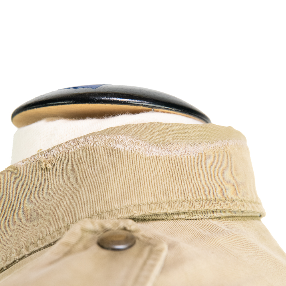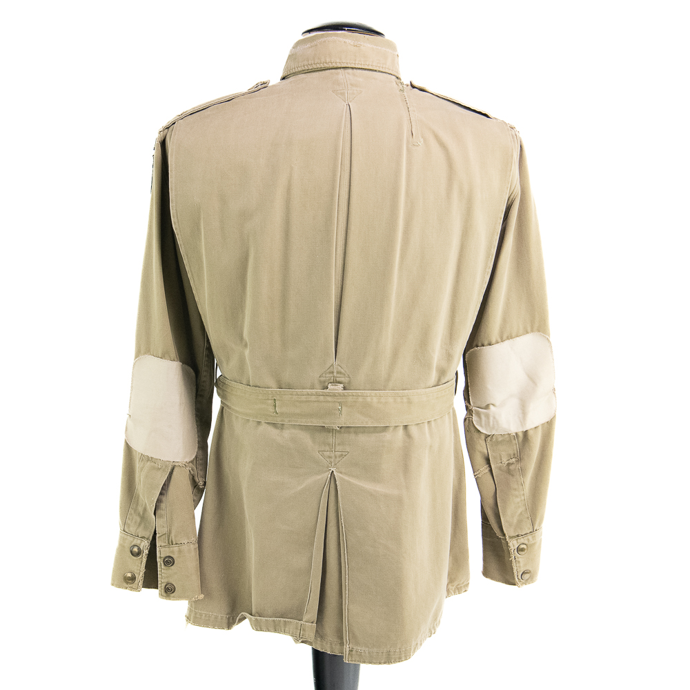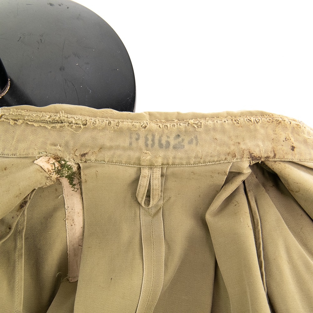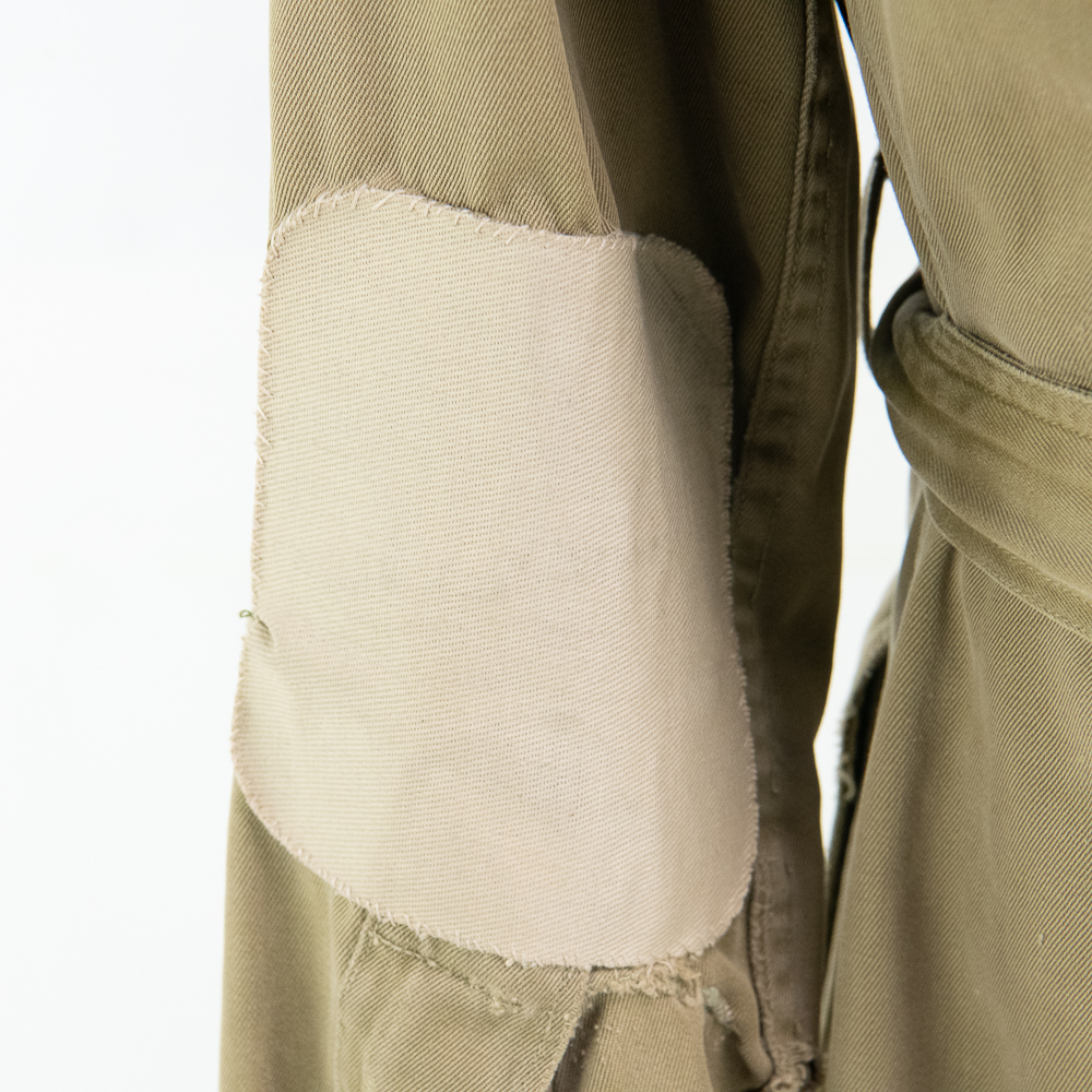 M42 Jump Jacket. 101st Airborne (white tongue variant, on left shoulder) and First Allied Airborne Army (right shoulder) patched. 101st patch and above tab chain stitched in blue thread. First Allied Airborne Army patch is whip stitched w/ white thread. No glow on any of the repairs on the jacket. When the UV light is put over the First Allied Airborne Army it has an uneven mottled glow on the numeral one. When the UV light is put over elbow patches as well as the 101st patch it seems to have a glow, and reflects the light more than expected. Unknown owner, but laundry mark stamp on back of inside collar is “ P 8624 ”. Jacket shows a lot of wear/usage. Significant wear around collar and fraying of edges at base of coat as well as on arms below elbows. Five-inch tear on the rear upper right shoulder than has been machine sewn. Elbows have large patches sewn over them. Not something reinforced for invasion, but more for elbow repair. Four front pockets, zip closure, waist belt. Belt has attaching strap securing it to the jacket (an early variation). The first 2-3 in of belt tip has frayed (not repaired). Quartermasters tag is present in the right waist pocket. It is very faded from laundering, but intact. Brass washed white metal zipper marked “ CONMAR “ Made in USA 12 CONMAR ” on back of zipper. Inside of shoulder area exhibits darl sticky residue from broken down padding foam from hangar. It looks to have been hung up a long time. This jacket deserves to be researched further. Dimensions: 19 in wide x 30 in tall. Please see photos for condition. GERONIMO!