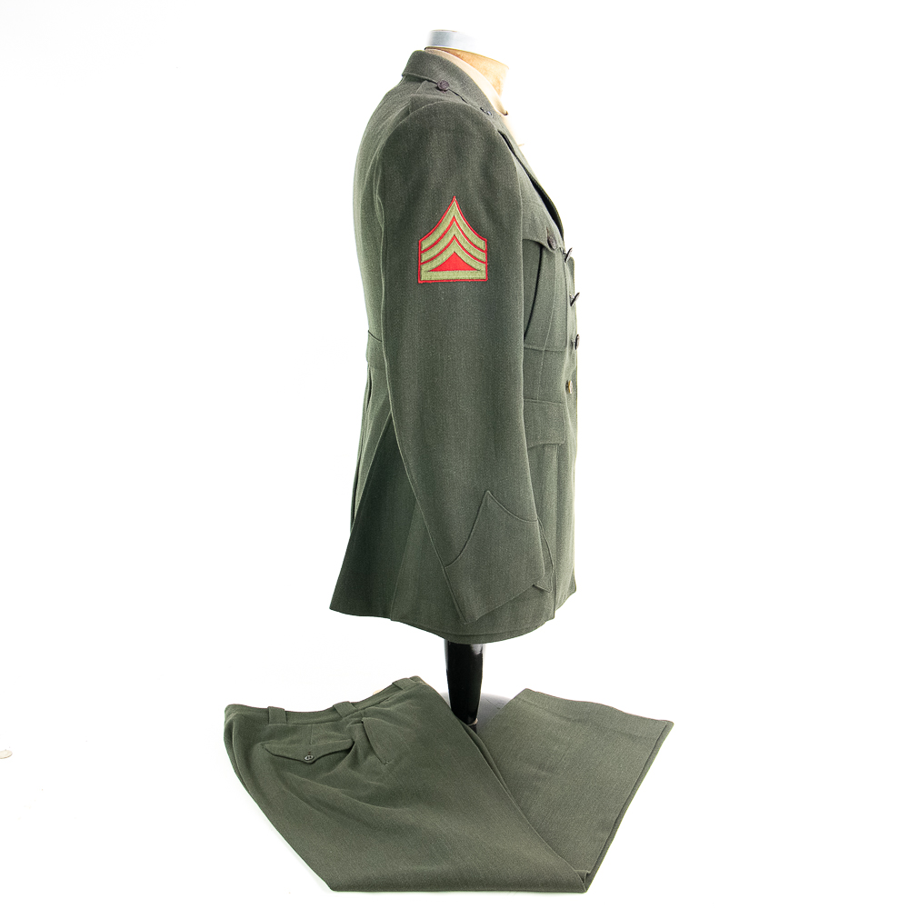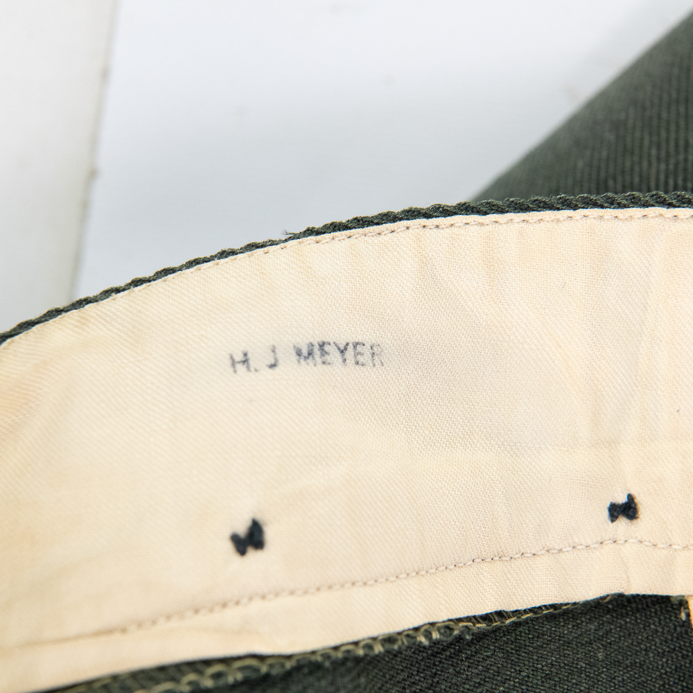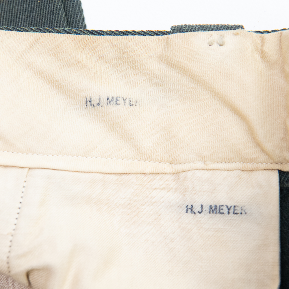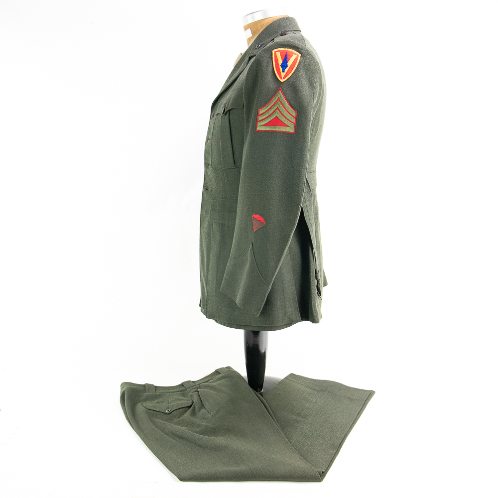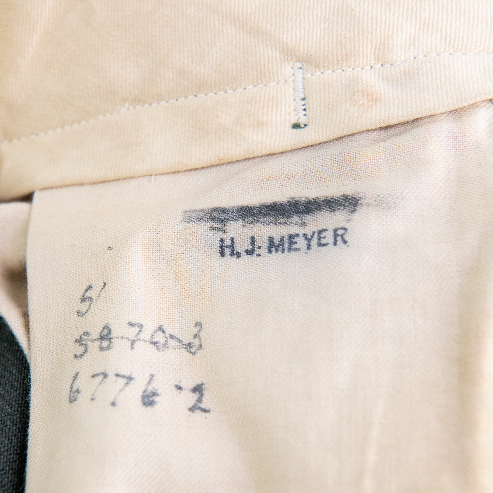 Uniform. This jacket is custom tailor-made of a whip cord fabric. Interior is lined with “quilted” silken material, and arm-pit shields in each sleeve. Inside the interior breast pocket is a “Union-Made” tag — there is no tailor tag evident. The Union tag has “H.J. Meyer” stamped twice by ink-stamp. The same name is marked on the upper edge of the neck liner. The size is approximately a 36-37L. USMC buttons. Staff Sergeant stripes sewn on each sleeve, with the flat rocker indicating ‘staff’ (this checks with his apparent “clerk” designation on 5th Div. Muster Doc (see below). On left shoulder 5th Marine Division shoulder patch and a very RARE red-embroidered on fabric parachute insignia, indicating either para-qualified or Parachute Battalion veteran. All insignia is machine sewn-on. There is no ribbon bar. Lapels have pair of USMC Globe and Anchor insignia-unmarked. Trousers are made of exact matching fabric. They are marked inside 4 times with the “H.J. Meyer” ink stamp. Also present are the hand-printed numbers “5870-3” & “6776-2″ These are not serial number designators, so must be tailor designations. There is also an ” S’ ” & “Sexton” handprinted — the latter has been crossed out; the printing style and ink matches the numbers so probably a tailor mark or simply an error. The size is correct to the jacket: smaller. Inseam is 31.5 inces and the waist about 30″. Exc condition with no damage, mothing or tears. Nothing glows or responds under UV light. Necktie; khaki. 48 in. Everything appears original and unmodified. Please see photos for condition.
