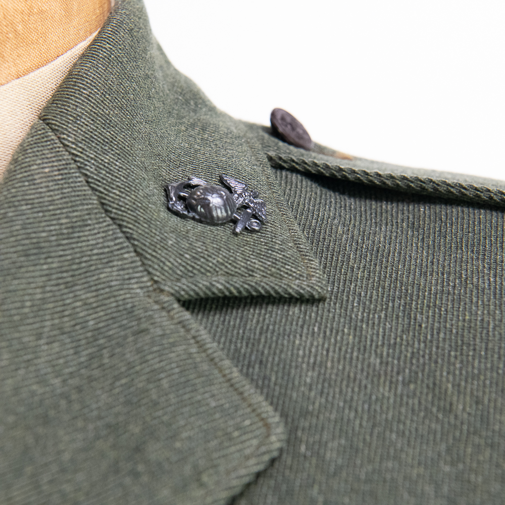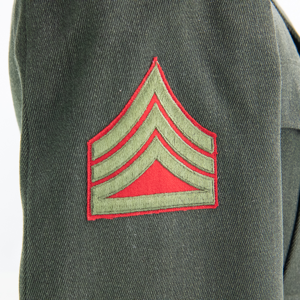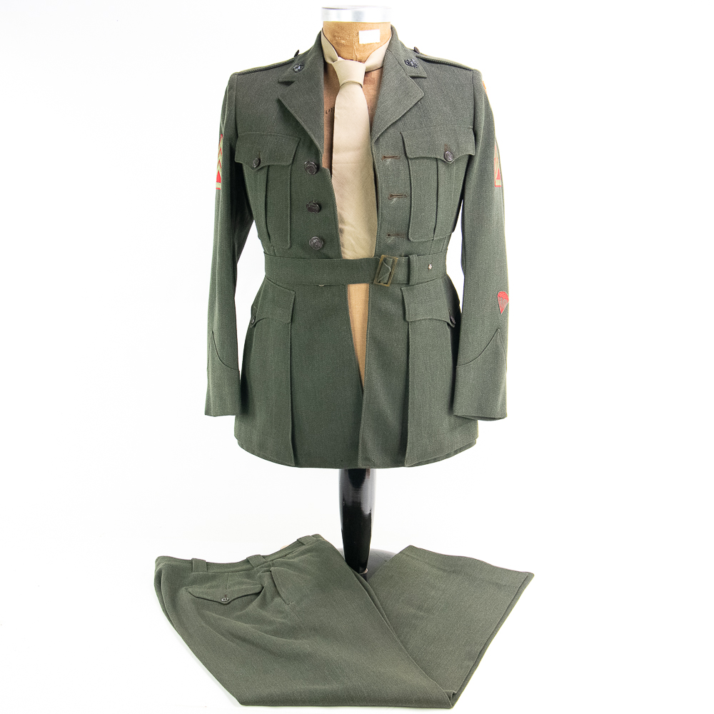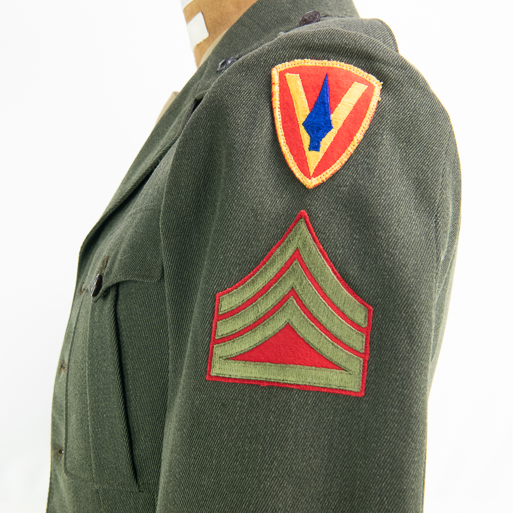 Uniform. This jacket is custom tailor-made of a whip cord fabric. Interior is lined with “quilted” silken material, and arm-pit shields in each sleeve. Inside the interior breast pocket is a “Union-Made” tag — there is no tailor tag evident. The Union tag has “H.J. Meyer” stamped twice by ink-stamp. The same name is marked on the upper edge of the neck liner. The size is approximately a 36-37L. USMC buttons. Staff Sergeant stripes sewn on each sleeve, with the flat rocker indicating ‘staff’ (this checks with his apparent “clerk” designation on 5th Div. Muster Doc (see below). On left shoulder 5th Marine Division shoulder patch and a very RARE red-embroidered on fabric parachute insignia, indicating either para-qualified or Parachute Battalion veteran. All insignia is machine sewn-on. There is no ribbon bar. Lapels have pair of USMC Globe and Anchor insignia-unmarked. Trousers are made of exact matching fabric. They are marked inside 4 times with the “H.J. Meyer” ink stamp. Also present are the hand-printed numbers “5870-3” & “6776-2″ These are not serial number designators, so must be tailor designations. There is also an ” S’ ” & “Sexton” handprinted — the latter has been crossed out; the printing style and ink matches the numbers so probably a tailor mark or simply an error. The size is correct to the jacket: smaller. Inseam is 31.5 inces and the waist about 30″. Exc condition with no damage, mothing or tears. Nothing glows or responds under UV light. Necktie; khaki. 48 in. Everything appears original and unmodified. Please see photos for condition.