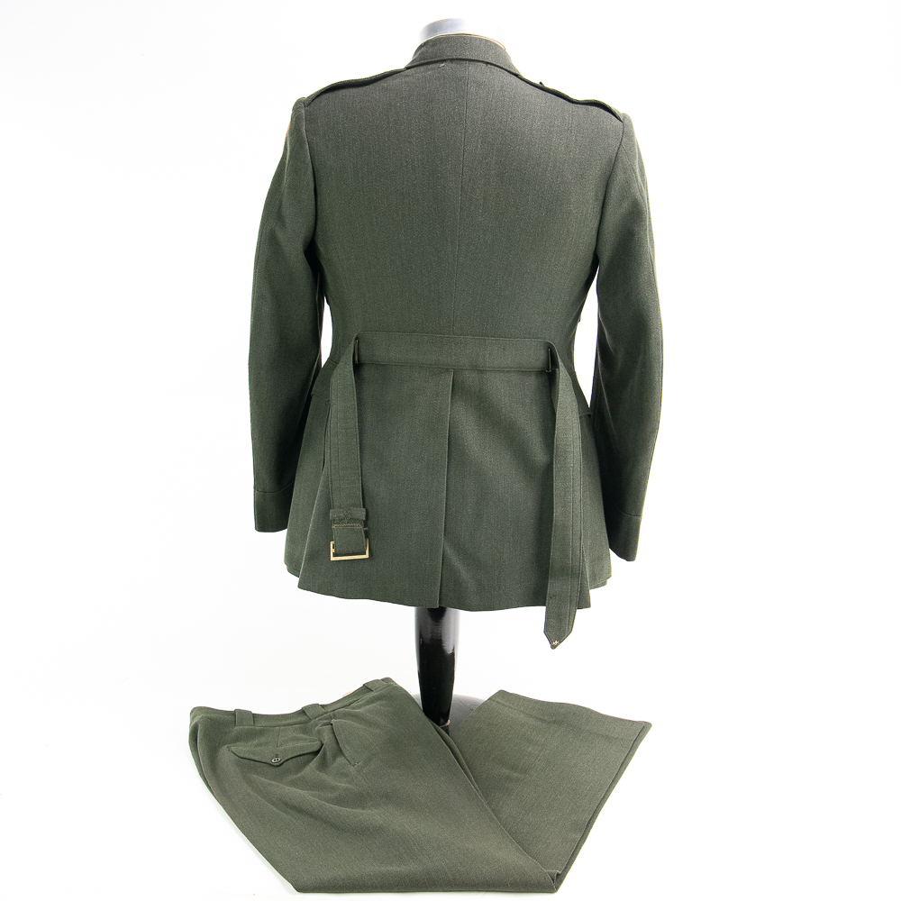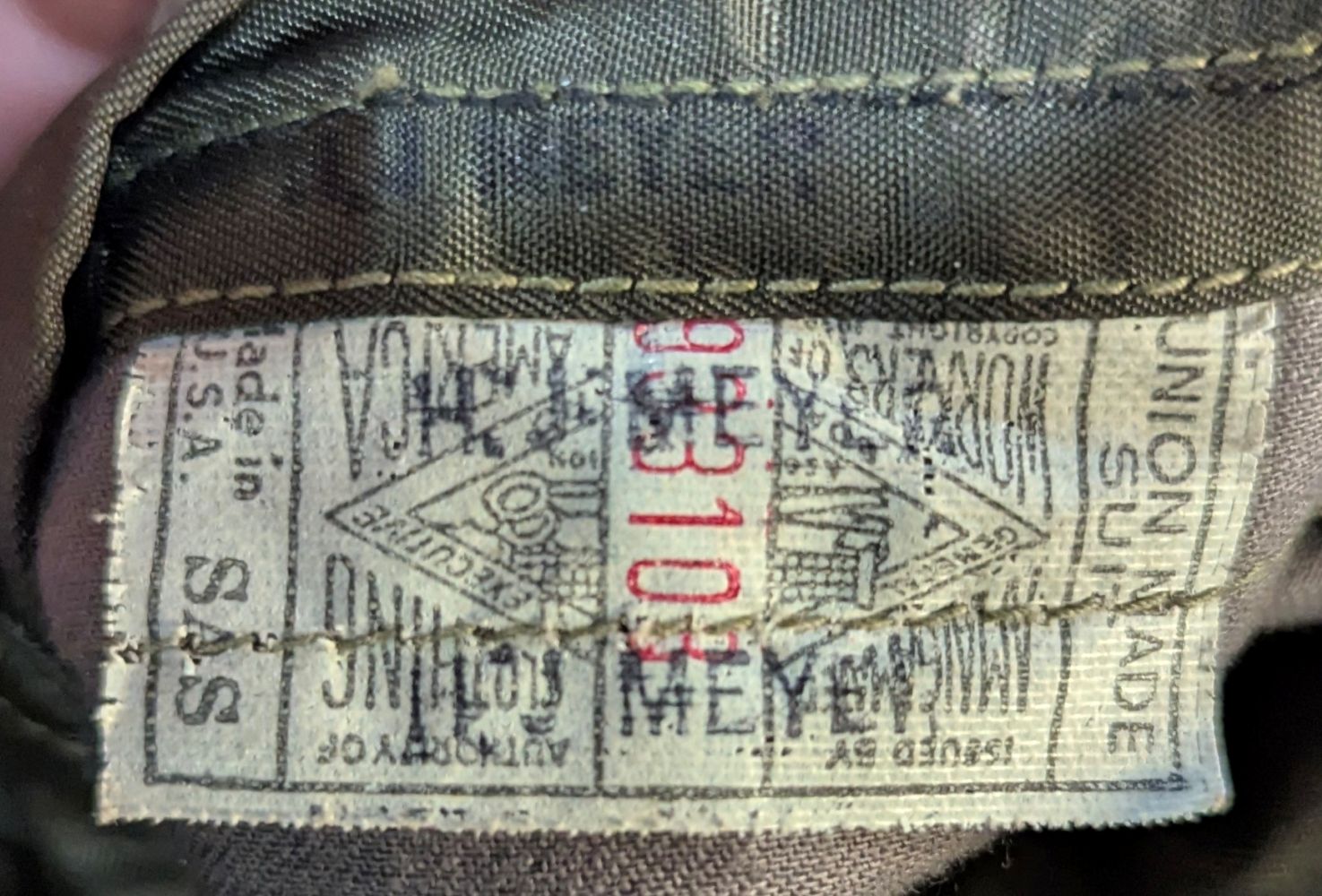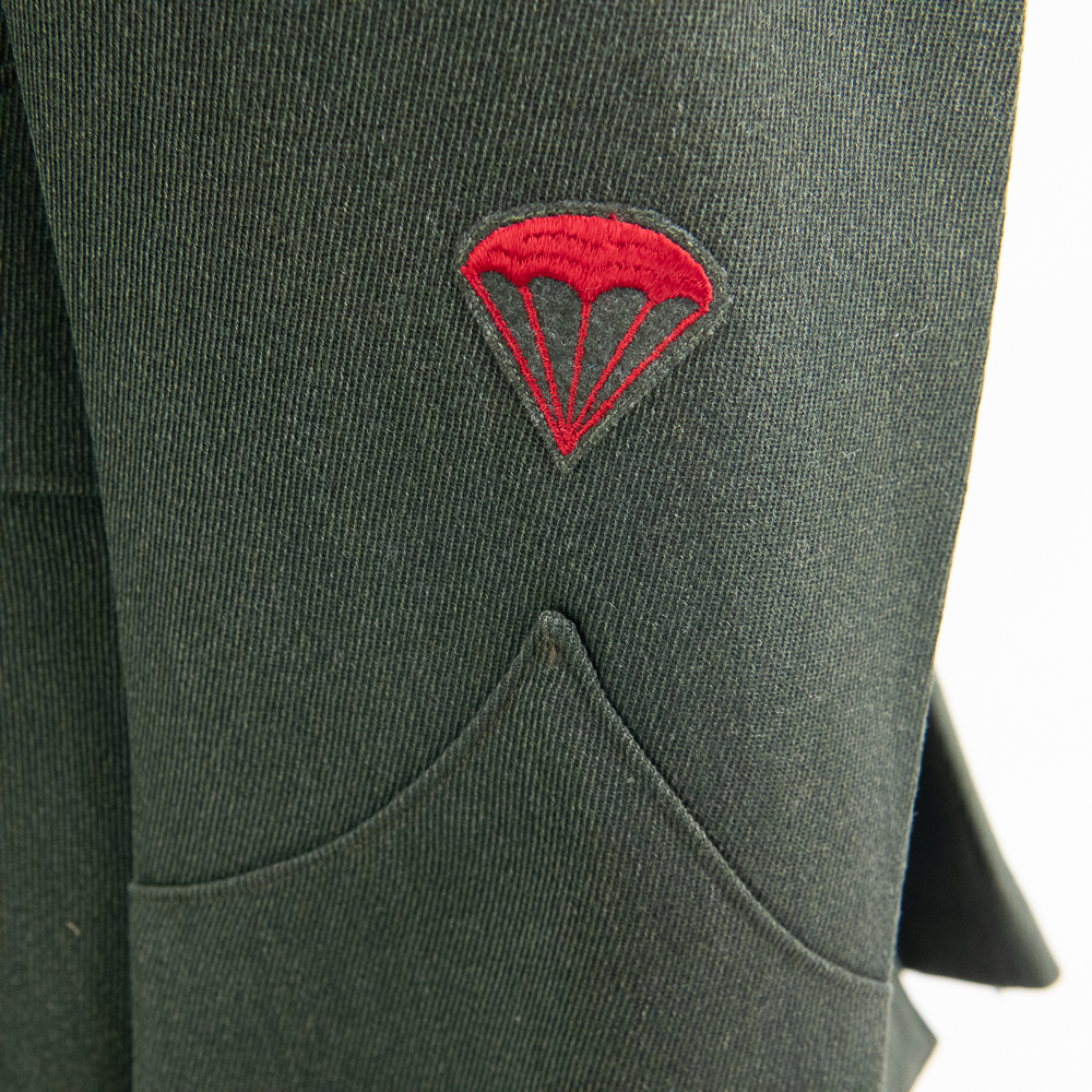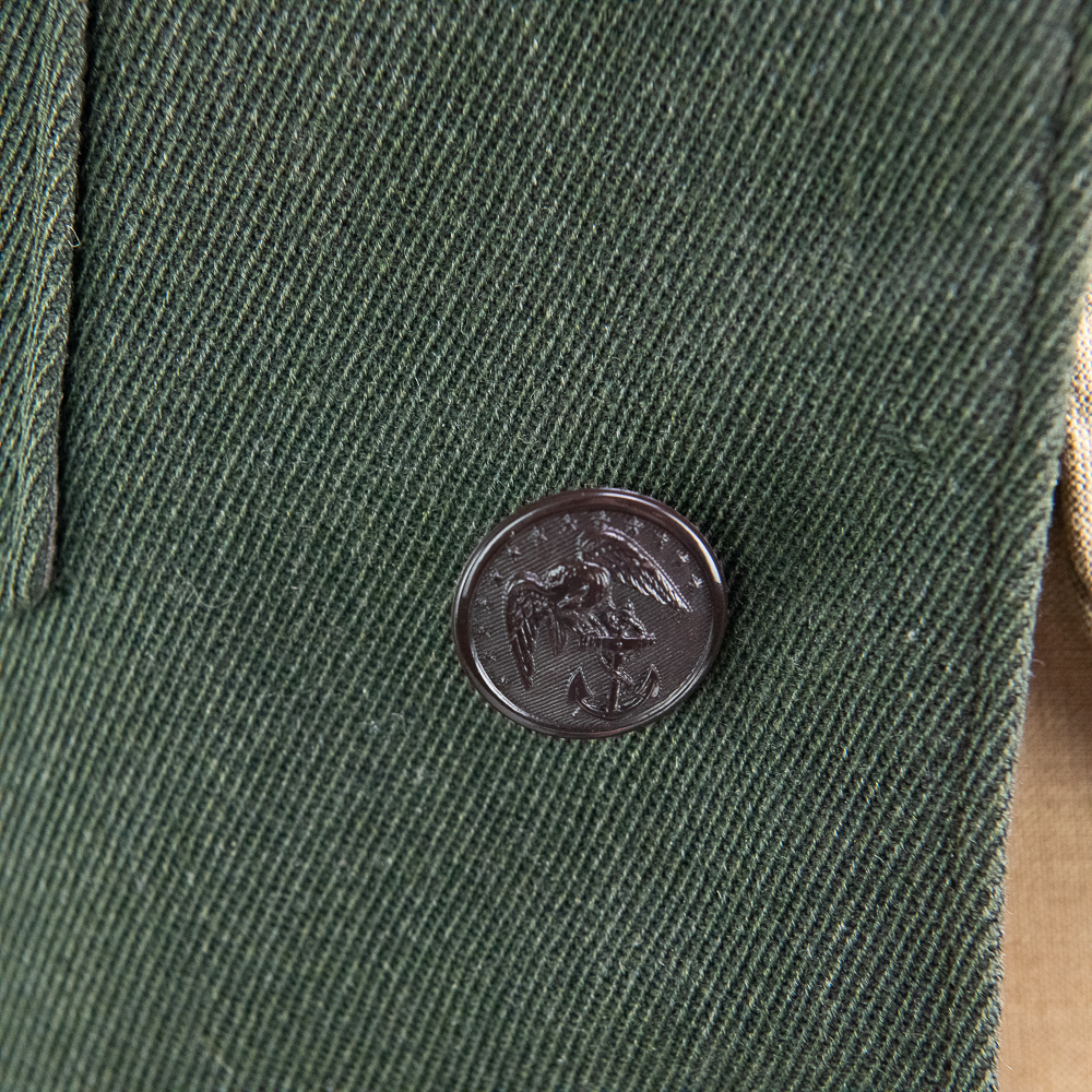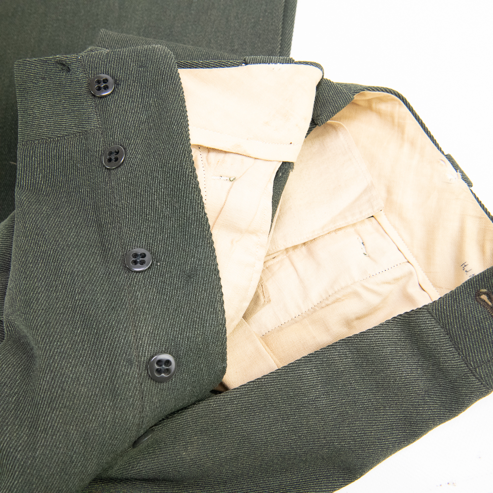 Uniform. This jacket is custom tailor-made of a whip cord fabric. Interior is lined with “quilted” silken material, and arm-pit shields in each sleeve. Inside the interior breast pocket is a “Union-Made” tag — there is no tailor tag evident. The Union tag has “H.J. Meyer” stamped twice by ink-stamp. The same name is marked on the upper edge of the neck liner. The size is approximately a 36-37L. USMC buttons. Staff Sergeant stripes sewn on each sleeve, with the flat rocker indicating ‘staff’ (this checks with his apparent “clerk” designation on 5th Div. Muster Doc (see below). On left shoulder 5th Marine Division shoulder patch and a very RARE red-embroidered on fabric parachute insignia, indicating either para-qualified or Parachute Battalion veteran. All insignia is machine sewn-on. There is no ribbon bar. Lapels have pair of USMC Globe and Anchor insignia-unmarked. Trousers are made of exact matching fabric. They are marked inside 4 times with the “H.J. Meyer” ink stamp. Also present are the hand-printed numbers “5870-3” & “6776-2″ These are not serial number designators, so must be tailor designations. There is also an ” S’ ” & “Sexton” handprinted — the latter has been crossed out; the printing style and ink matches the numbers so probably a tailor mark or simply an error. The size is correct to the jacket: smaller. Inseam is 31.5 inces and the waist about 30″. Exc condition with no damage, mothing or tears. Nothing glows or responds under UV light. Necktie; khaki. 48 in. Everything appears original and unmodified. Please see photos for condition.
