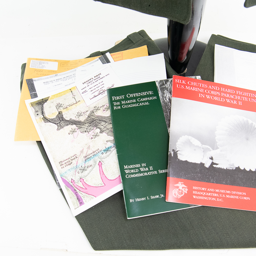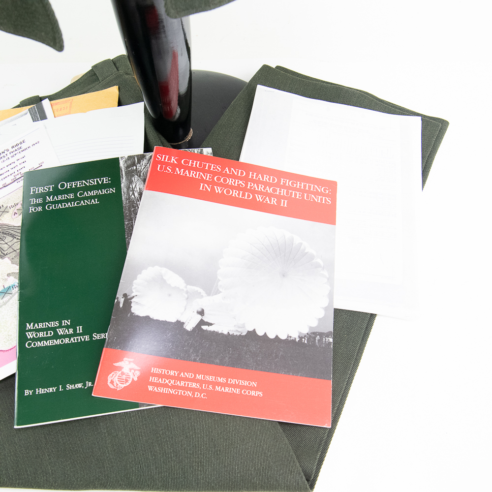 DOCUMENTS: Uniform came with 2 sets of documentation from the Marine Corp Historical Center in D.C. One document shows that then-PFC Herbert J. Meyer was a member of Company A, First Parachute Battalion, First Marine Divison. This Muster Roll for 1 Sept to 30 (‘0’ there but weak) shows Meyer was wounded in action by gunshot on the 14th — (on the night of Sept 13 thru daybreak on the 14th, Marine Parachutists & Raiders held off a massive attack by the Japanese on the 1stMarDiv positions south of Henderson Field. This was the infamous “Edsons Ridge” battle on Guadalcanal. The 1st Parachute Battalion suffered 128 casualties that night. Of those, 59 men were dead or missing-in-action. (46% casualties!). The 2nd document shows he also served with the HQ Battalion, 5th Marine Division on Iwo Jima. USMC publications included: “First Offensive The Marine Campaign for Guadalcanal” by Henry I. Shaw Jr. and “Silk Chutes and Hard Fighting: U.S. Marine Corps Parachute Units in World War II.” By LT Col Jon T. Hoffman.