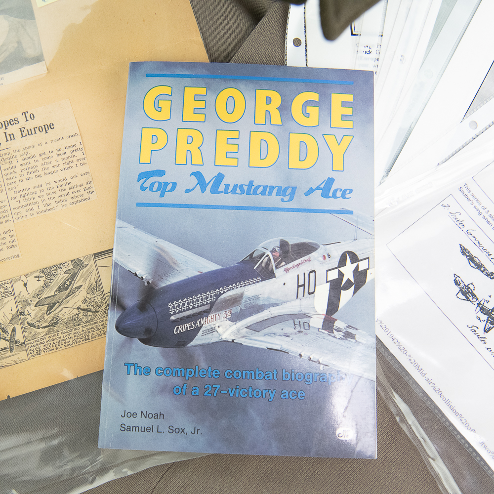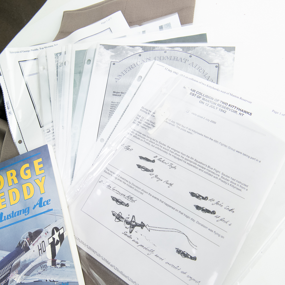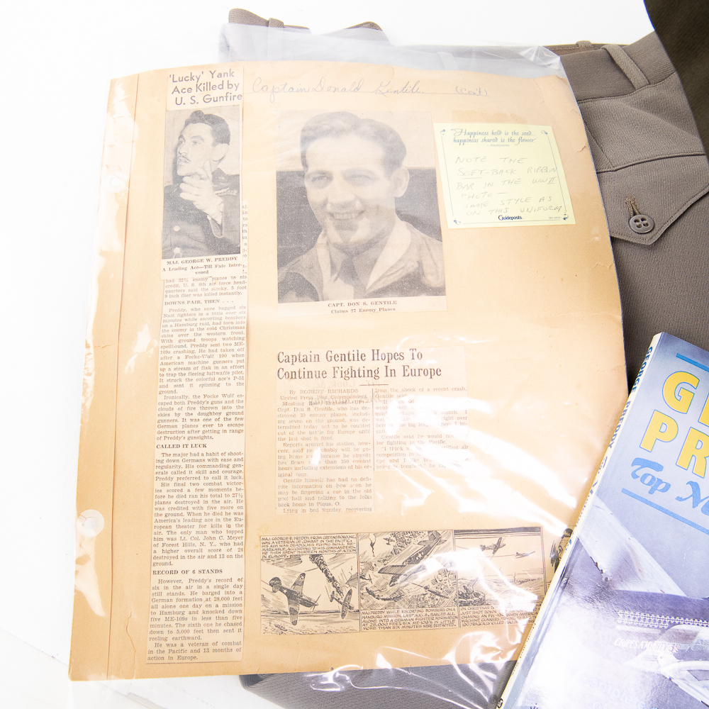 Also included are 1) Several printed documents/images (six) off the internet highlighting various aspects of his short military career and legacy. 2) Scrapbook page featuring clipping of article announcing death of Maj. George W. Preddy and 4 panel comic strip of his career and demise. Page also features clippings from newspaper of Captain Donald Gentile photo and article blurb. A modern not affixed to this page makes reference to the ribbon bar style on the uniform. 3) Book: “ George Preddy Top Mustang Ace. The Complete Combat Biography of a 27-Victory Ace.” By Joe Noah and Saule L. Sox, Jr. Motorbooks International. 1991. 192 pages.