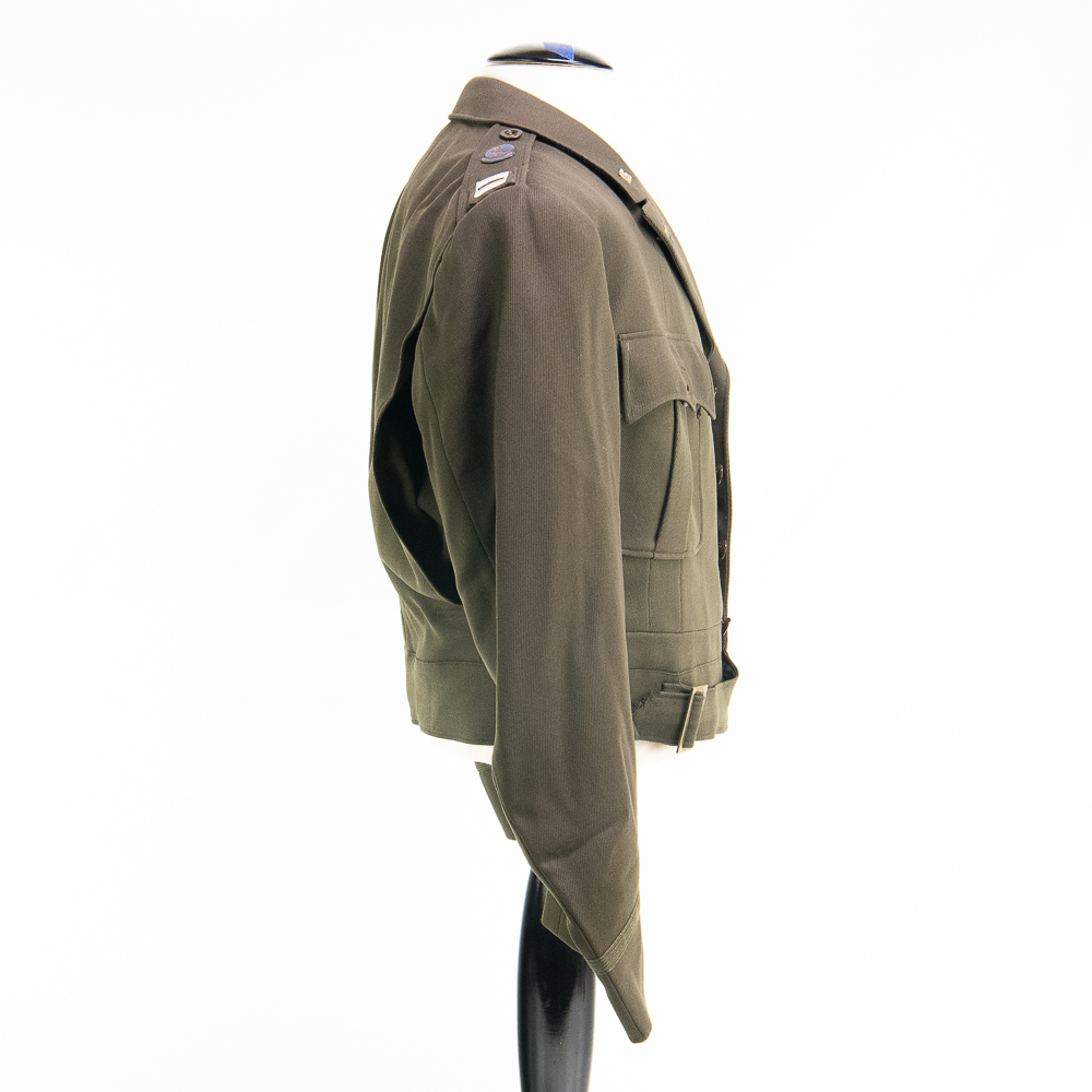 Officer “Ike” jacket for Glider pilot, I Troop Carrier Command. Jacket dated Nov. 1942 and Size 42 R on quartermaster tag inside chest inner pocket. US and Army Air Force lapel insignia w/double clutch back fasteners (one of the AAF insignia has sterling marked fasteners). Shoulder straps have Captains rank-cloth. Distinctive Unit insignia for I Troop Carrier Command on shoulder straps. Double clutch fasteners. Matched pair marked “ Le Velle and Co Washington DC Philadelphia Sterling “ Embroidered wool Glider Pilots wings. Upper ribbon bar: Distinguished Flying Cross; Bronze Star Medal; Purple Heart Medal. Lower ribbon bar: Air Medal; European-African Middle Eastern Campaign w/ silver star and bronze arrowhead; World War II Victory Medal. Fourragere on left shoulder. Left shoulder sleeve “I Troop Carrier Command” insignia. Left sleeve cuff has 4 service stripes. Waist belt has some loss of material at the tip. Only markings are what looks to be initial with number stitched crudely in dark thread at interior of waist enclosure. Dimensions: 20 in wide x 24 in tall. Please see photos for condition.