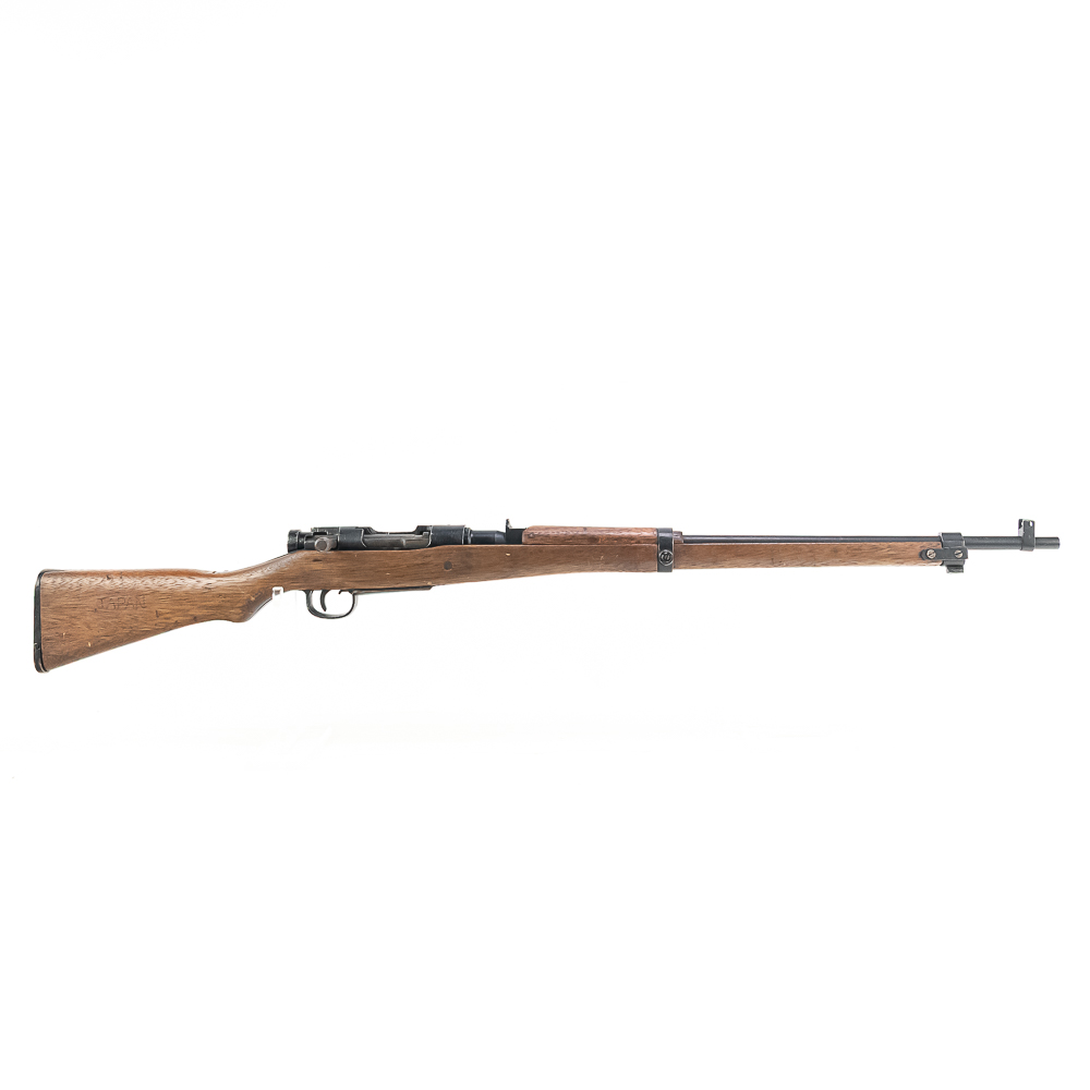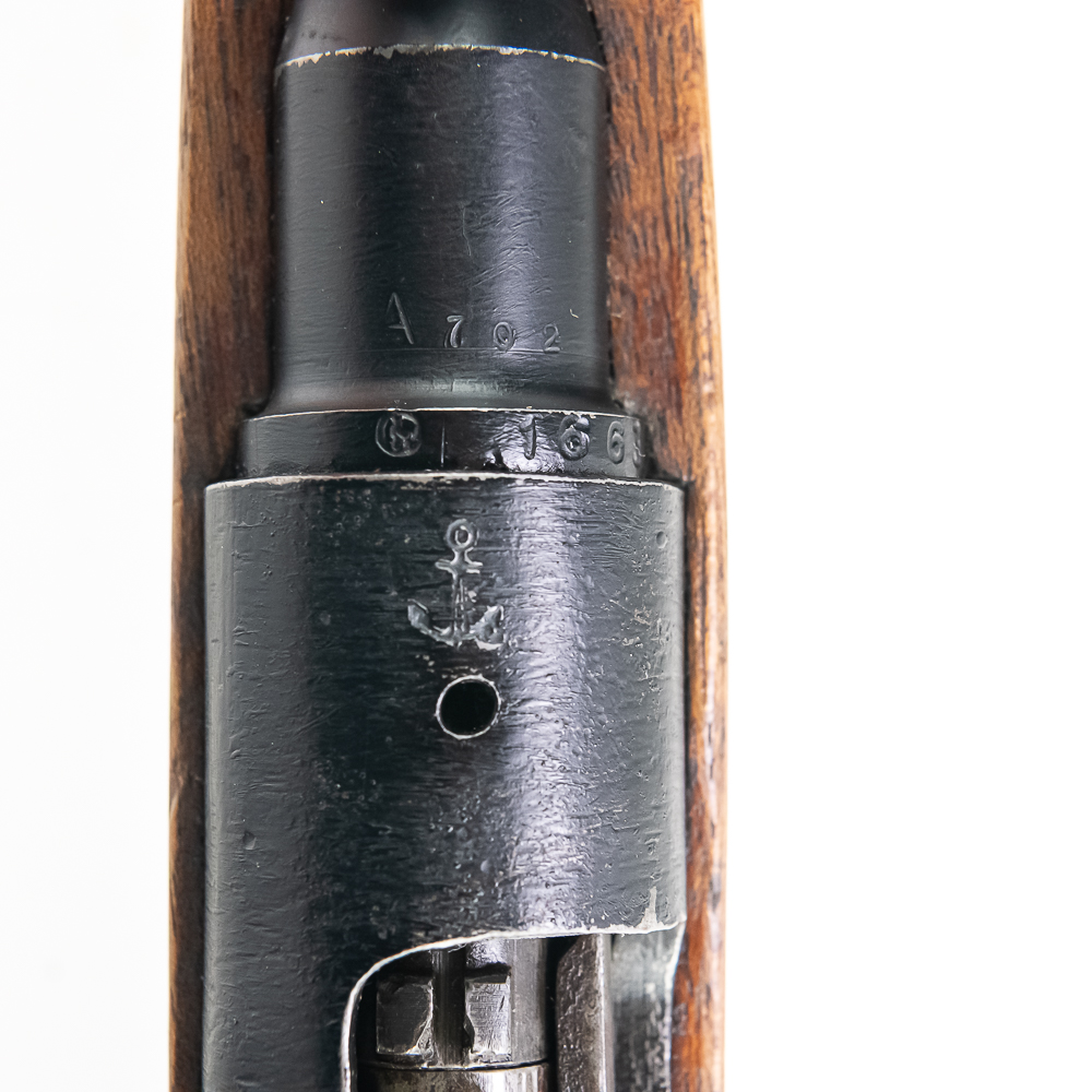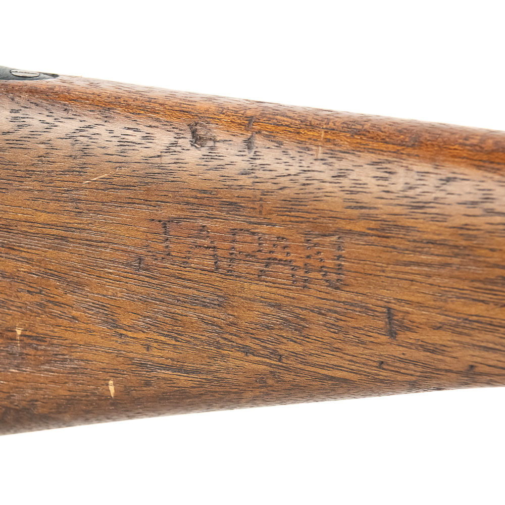 NAVY Arisaka “Special Type 99” 7.7 Rifle in very good condition with some wear and a good bore with some frosting. Anchor on chamber. “JAPAN” pinged into nice condition stock. Unique Japanese installed steel straps at front of gun (they were running out of parts) Nice black paint.